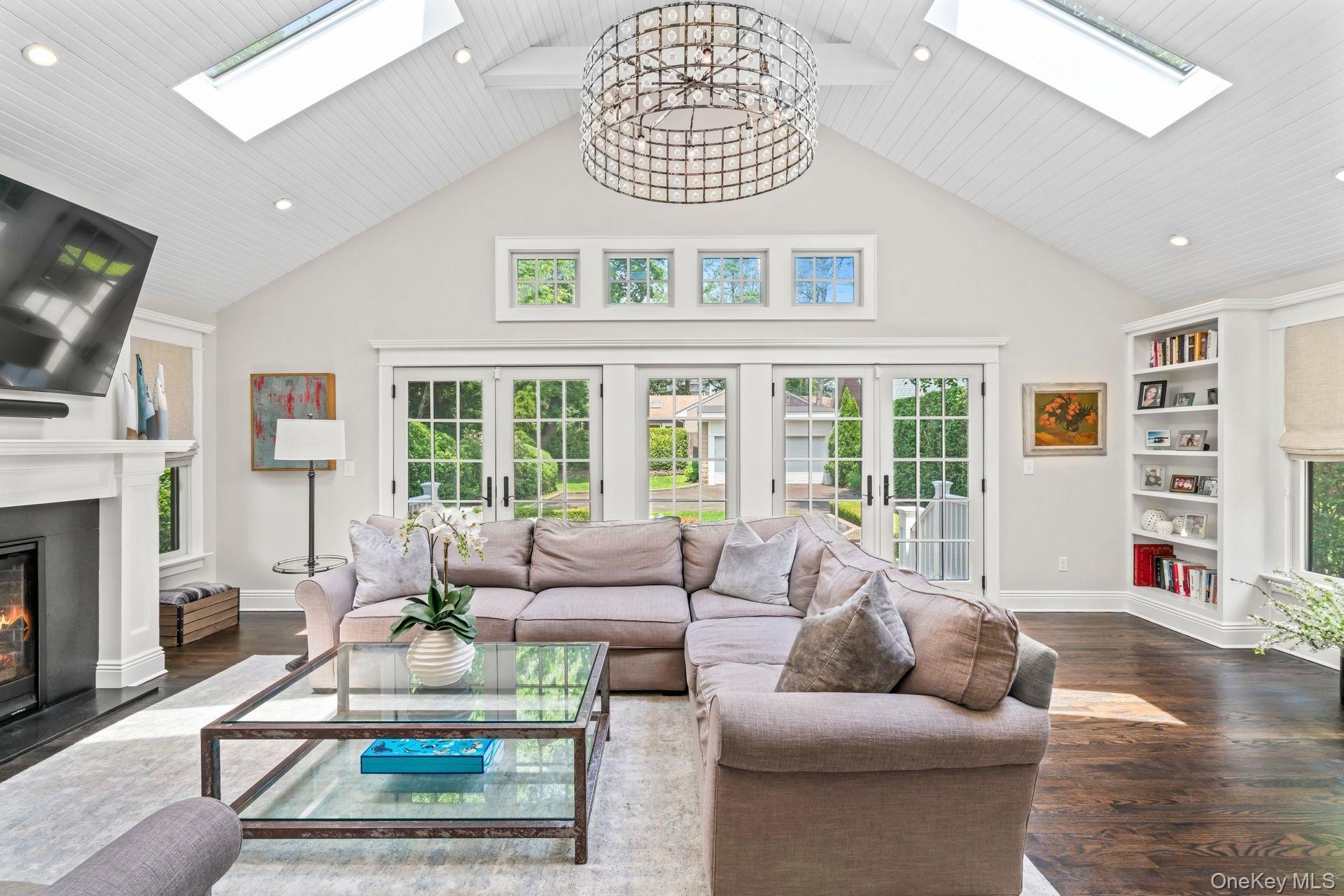 A gracious wraparound porch welcomes you into a sun-filled layout designed for both everyday living and effortless entertaining. The main level features a spacious entry foyer, formal living room, and an open-concept eat-in kitchen flowing into a vaulted-ceiling great room with skylights that bathe the space in natural light. A powder room adds convenience, while just off the dining room, a versatile mudroom/bar area offers custom storage, an extra refrigerator, and direct porch access—perfect for hosting or simply relaxing.