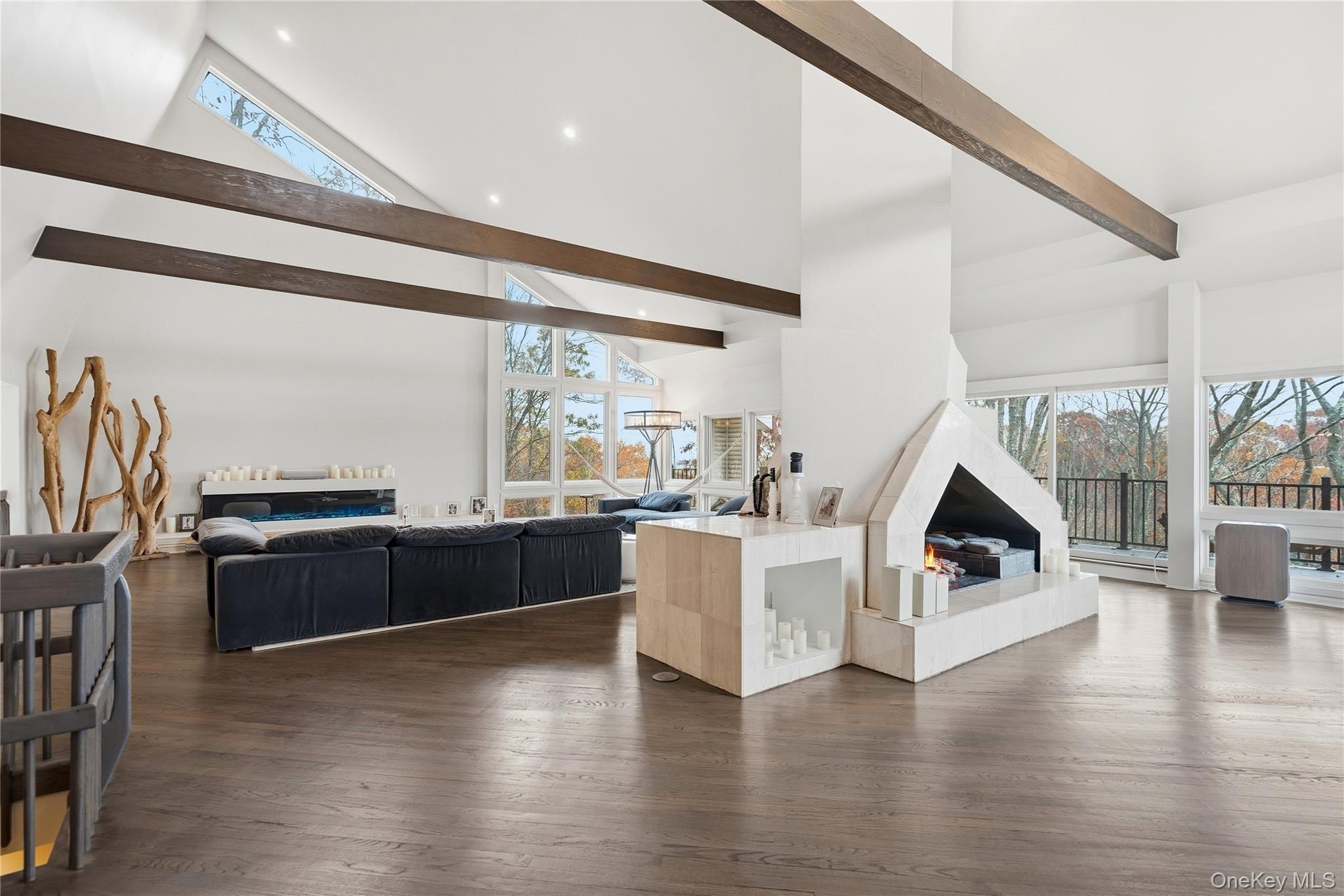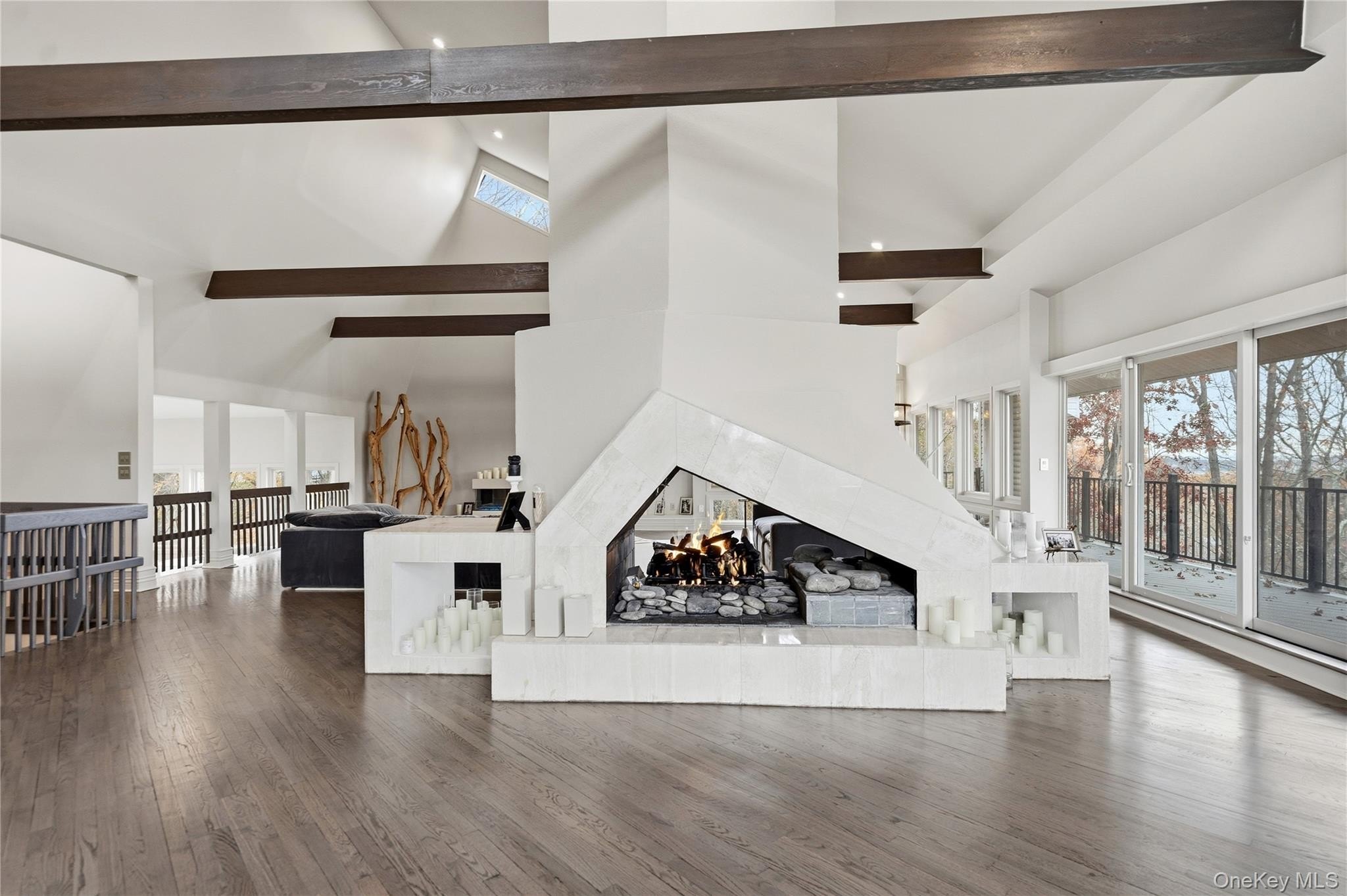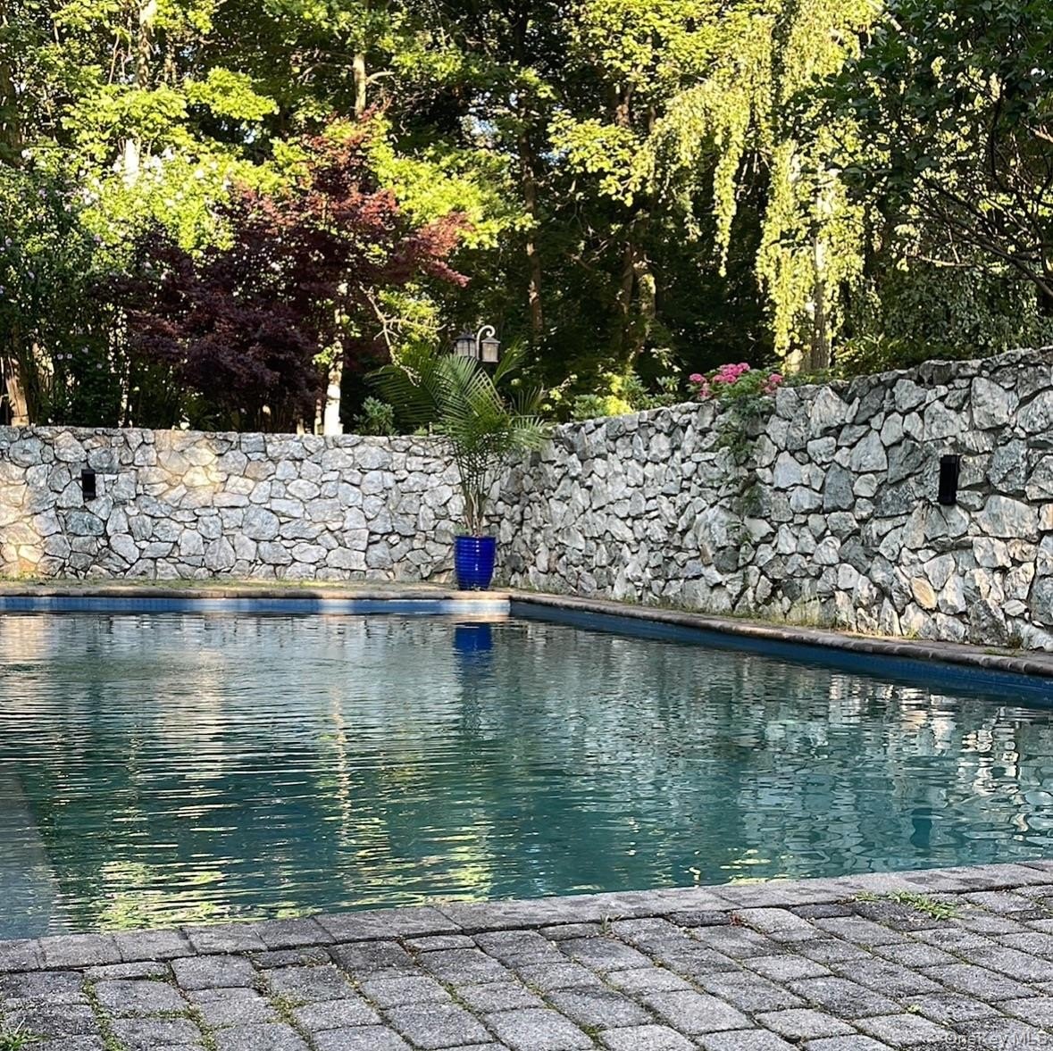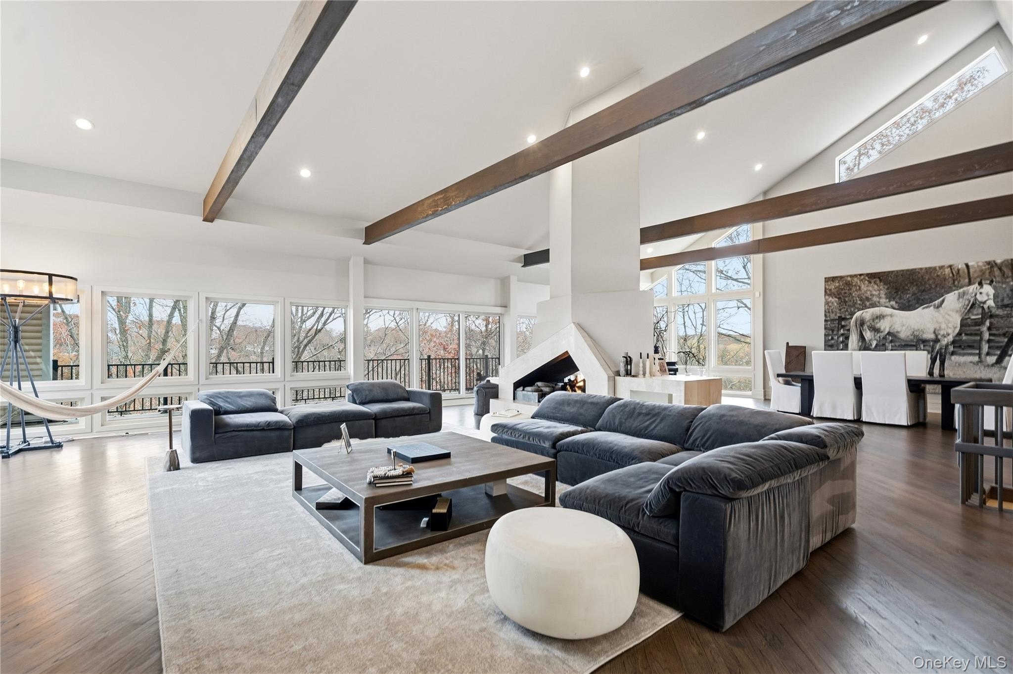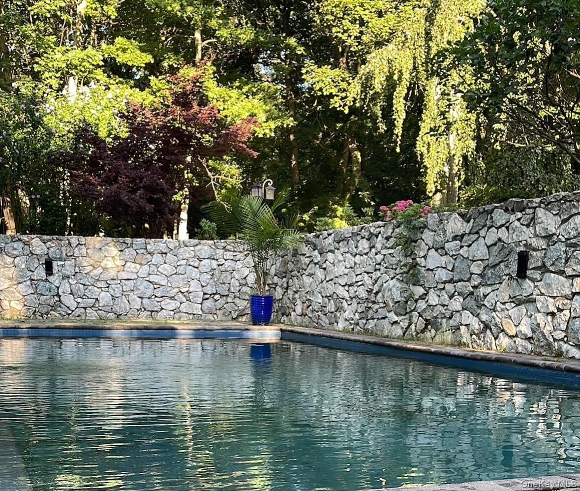 Special Contemporary 5 bedrooms, 5.5 bath home filled with light and space! From the moment you step into the grand foyer with its soaring cathedral ceiling, this contemporary home impresses with its light and open design. Walls of windows throughout create a seamless connection between indoors and outdoors, bathing every room in natural light. Each of the five bedrooms features its own private bath. The gourmet kitchen is equipped with top of the line viking stainless steel appliances. Just beyond the kitchen, the expansive great room features hardwood floors, a double-sided fireplace, and sliding glass doors that open to a wraparound terrace- an ideal space for gatherings or quiet relaxation. The adjacent dining room completes this elegant and functional main living area. The private primary suite offers a serene retreat with a fully renovated bathroom, plenty of closet space and two walls of windows overlooking the property. Outside, surrounded by nature, is a 3 car garage, and a heated gunite salt water pool. This home is truly unique and special.