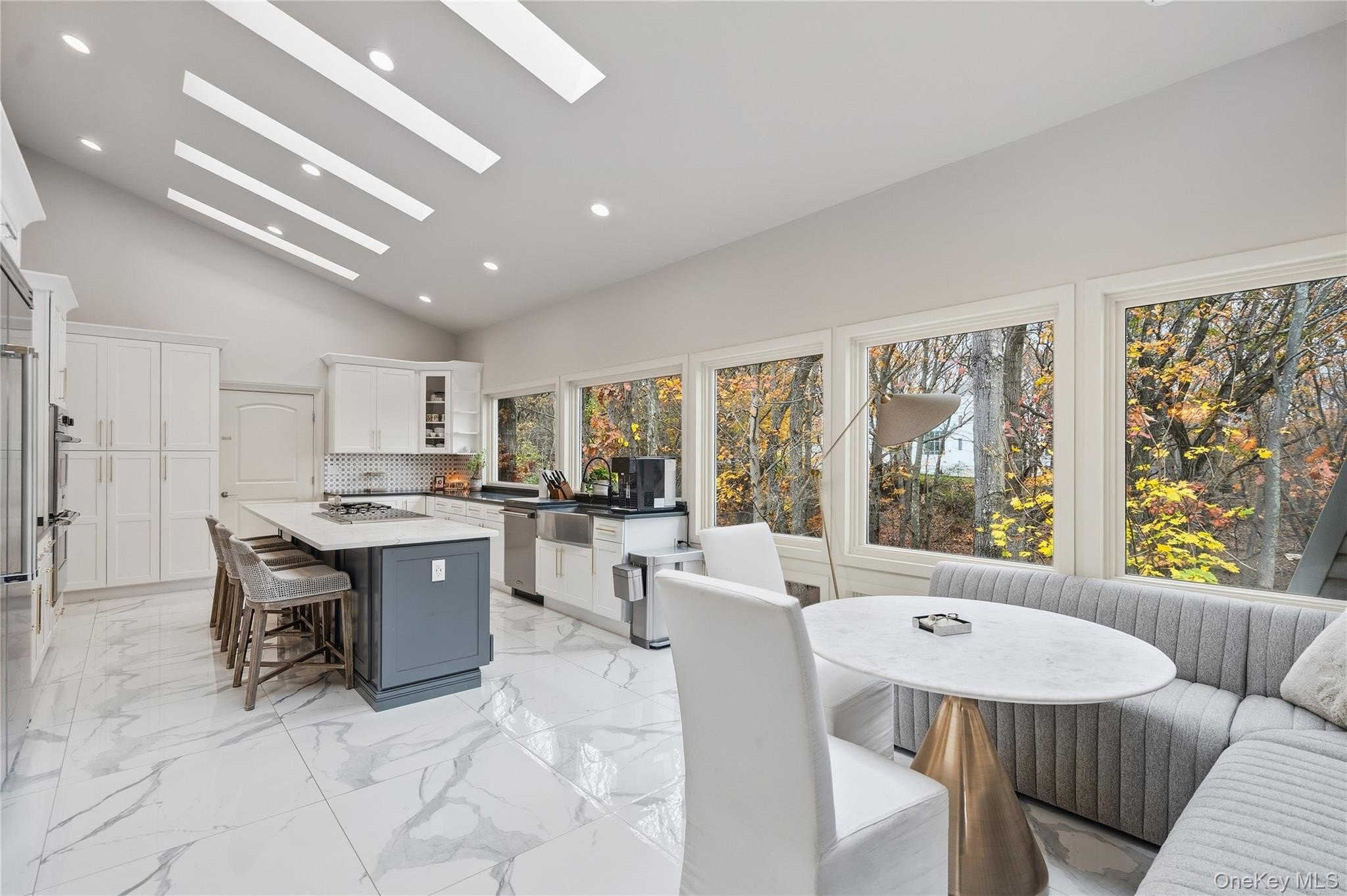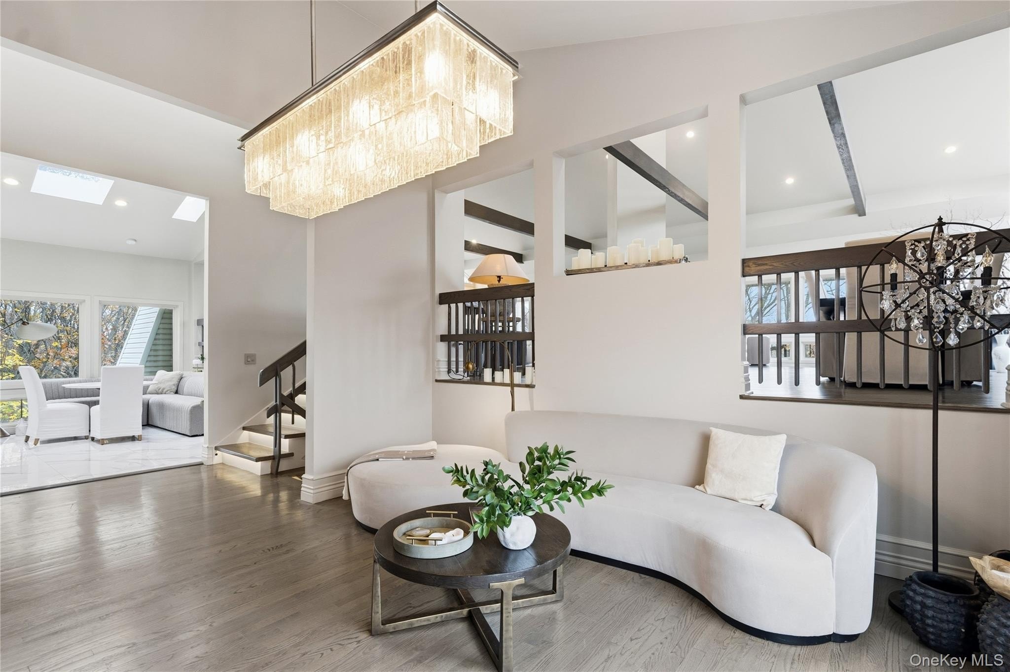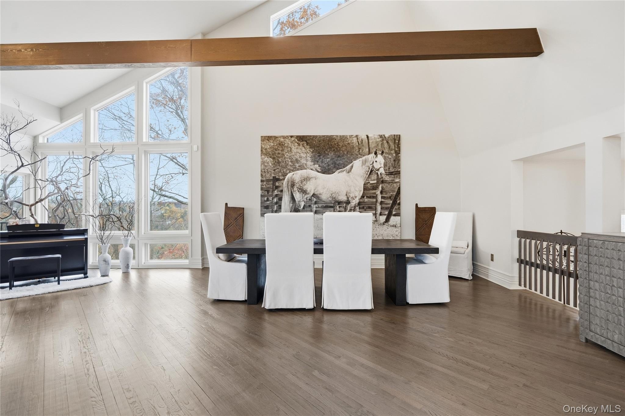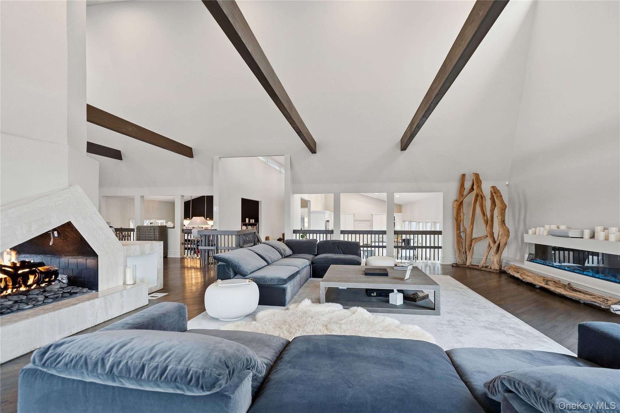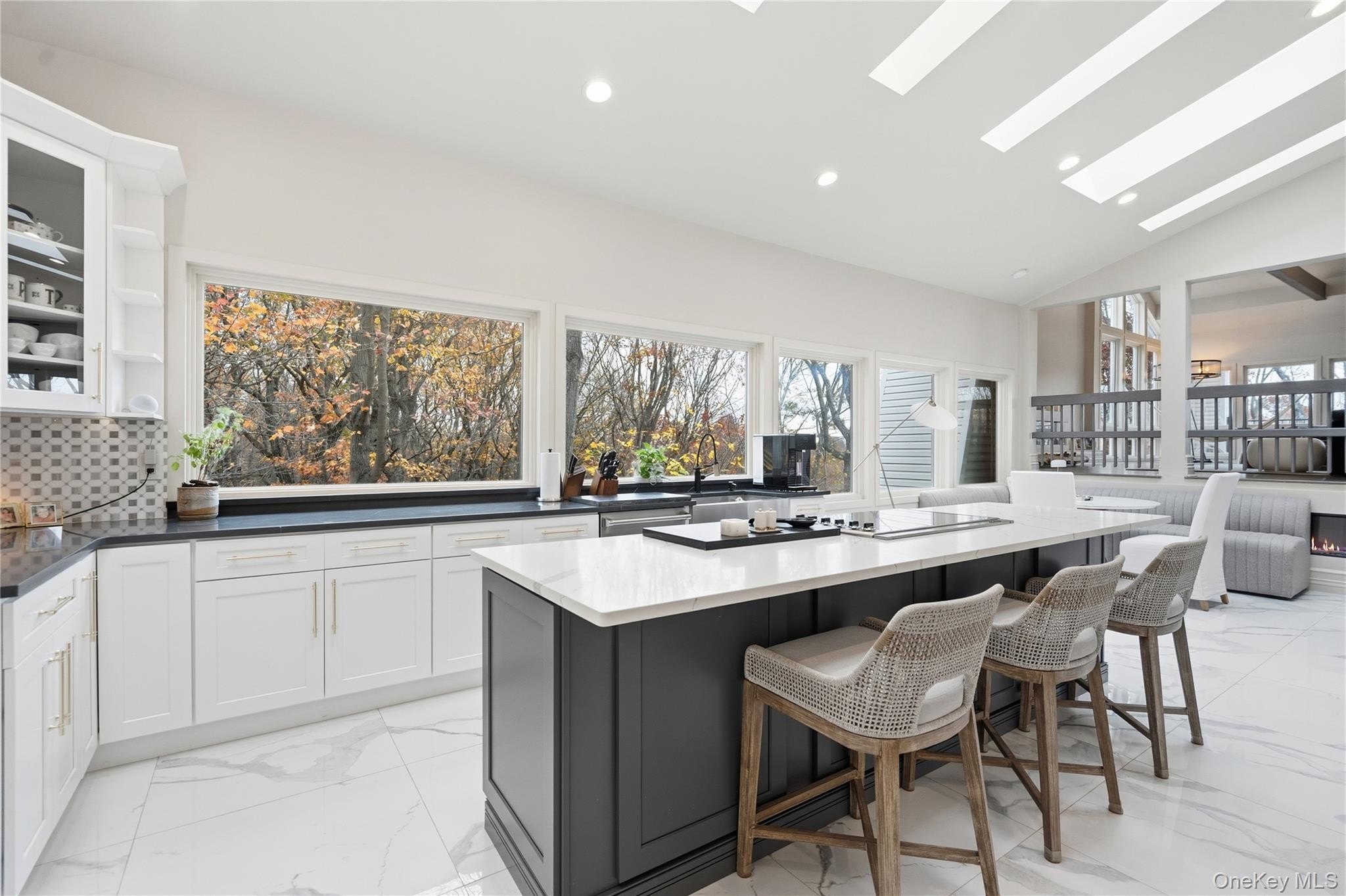 Special Contemporary 5 bedrooms, 5.5 bath home filled with light and space! From the moment you step into the grand foyer with its soaring cathedral ceiling, this contemporary home impresses with its light and open design. Walls of windows throughout create a seamless connection between indoors and outdoors, bathing every room in natural light. Each of the five bedrooms features its own private bath. The gourmet kitchen is equipped with top of the line viking stainless steel appliances. Just beyond the kitchen, the expansive great room features hardwood floors, a double-sided fireplace, and sliding glass doors that open to a wraparound terrace- an ideal space for gatherings or quiet relaxation. The adjacent dining room completes this elegant and functional main living area. The private primary suite offers a serene retreat with a fully renovated bathroom, plenty of closet space and two walls of windows overlooking the property. Outside, surrounded by nature, is a 3 car garage, and a heated gunite salt water pool. This home is truly unique and special.