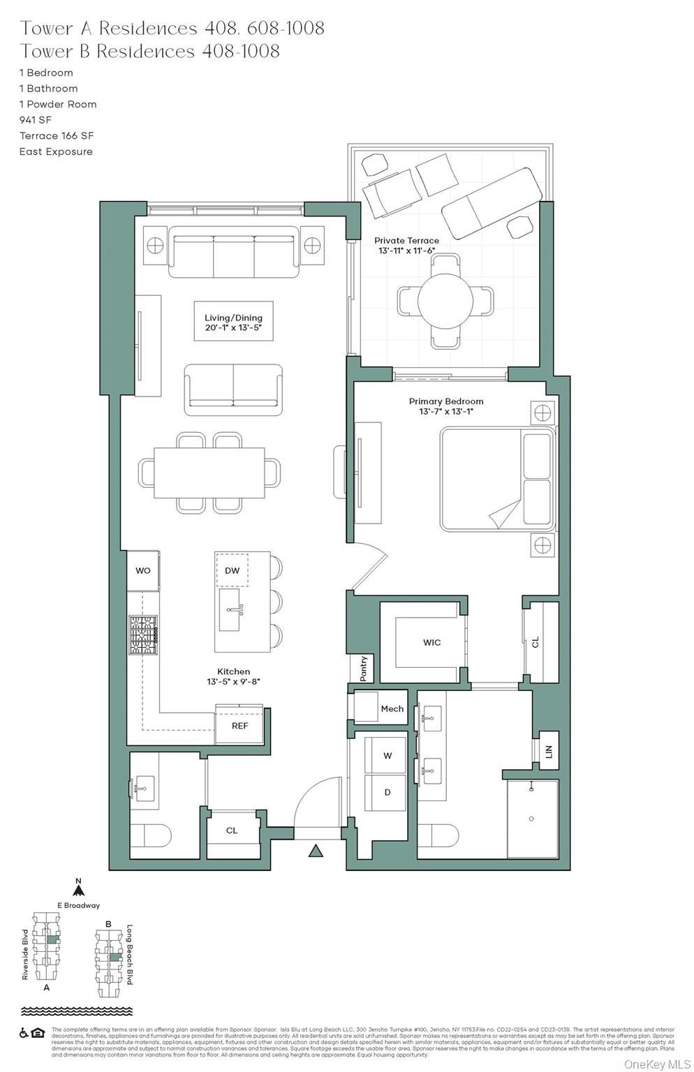 A luxury beach hotel-inspired condominium, The Boardwalk is a first-of-its-kind offering in Long Beach. Situated along the boardwalk, the pair of white stone buildings offer an exclusive resort lifestyle, making home a destination. This 941 sq ft 1-bedroom, 1-and-a-half bath residence combines modern coastal charm and upscale design details. Floor-to-ceiling windows, 7" European Blond Oak plank flooring, and a 166 sq ft terrace offer effortless indoor-outdoor living. The open-plan living area features Eastern views, while the spacious kitchen incorporates custom lacquer cabinetry, honed Porcelanosa Sintered stone countertop, backsplash and island, and Kohler polished nickel fixtures. The suite of fully-integrated Bosch appliances includes a 5 burner gas cooktop, electric convection wall oven, ducted hood, French door refrigerator and freezer, microwave, and custom-paneled dishwasher. The sun-drenched primary bedroom offers ample storage, including a generous walk-in closet, its own access to a private terrace, and spa-like bathroom with decorative tile floors and Porcelanosa tile feature wall, custom double vanity with Kohler undermount sinks, and glass enclosed rain shower. A powder room with Kohler sink and fixtures, Porcelnanosa tile feature wall, Ann Sacks ceramic mosaic tile floors, along with a separate utility closet with side-by-side vented Whirlpool washer and dryer, complete this luxurious home. Over 40,000 square feet of wellness and relaxation-driven indoor and outdoor amenities offer a customizable, active, and healthy lifestyle, including an exclusive porte-cochere, seasonal oceanside saltwater swimming pool, private pool-side cabanas for purchase, Club Room, Private Dining Room, Billiard Room, Card Lounge, Kid's Play Room, Pet Grooming Station, The Hub co-working space, Outdoor kitchens, Private Dog Run, and State-of-the-art Fitness Studio with training room and saunas. The at-your-service culture at The Boardwalk is perfectly complimented by the lively beachside, easy access to dining and local conveniences, and proximity to Manhattan in under one hour on the Long Island Rail Road. Meet us at the Boardwalk! The complete terms are in an offering plan available from the Sponsor (CD22-0254 and CD23-0138) The artist representations and interior decorations, finishes, appliances and furnishings are provided for illustrative purposes only.