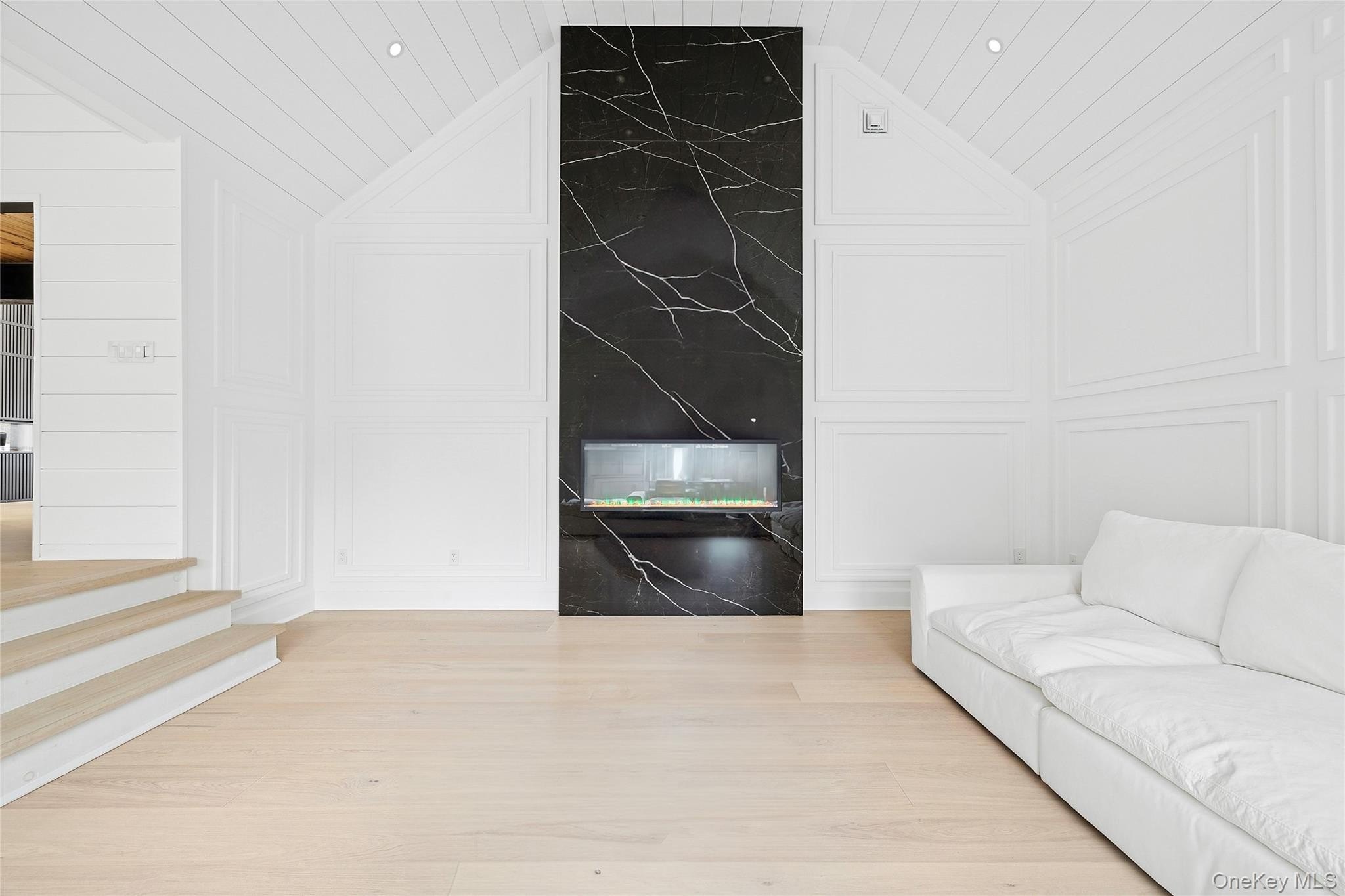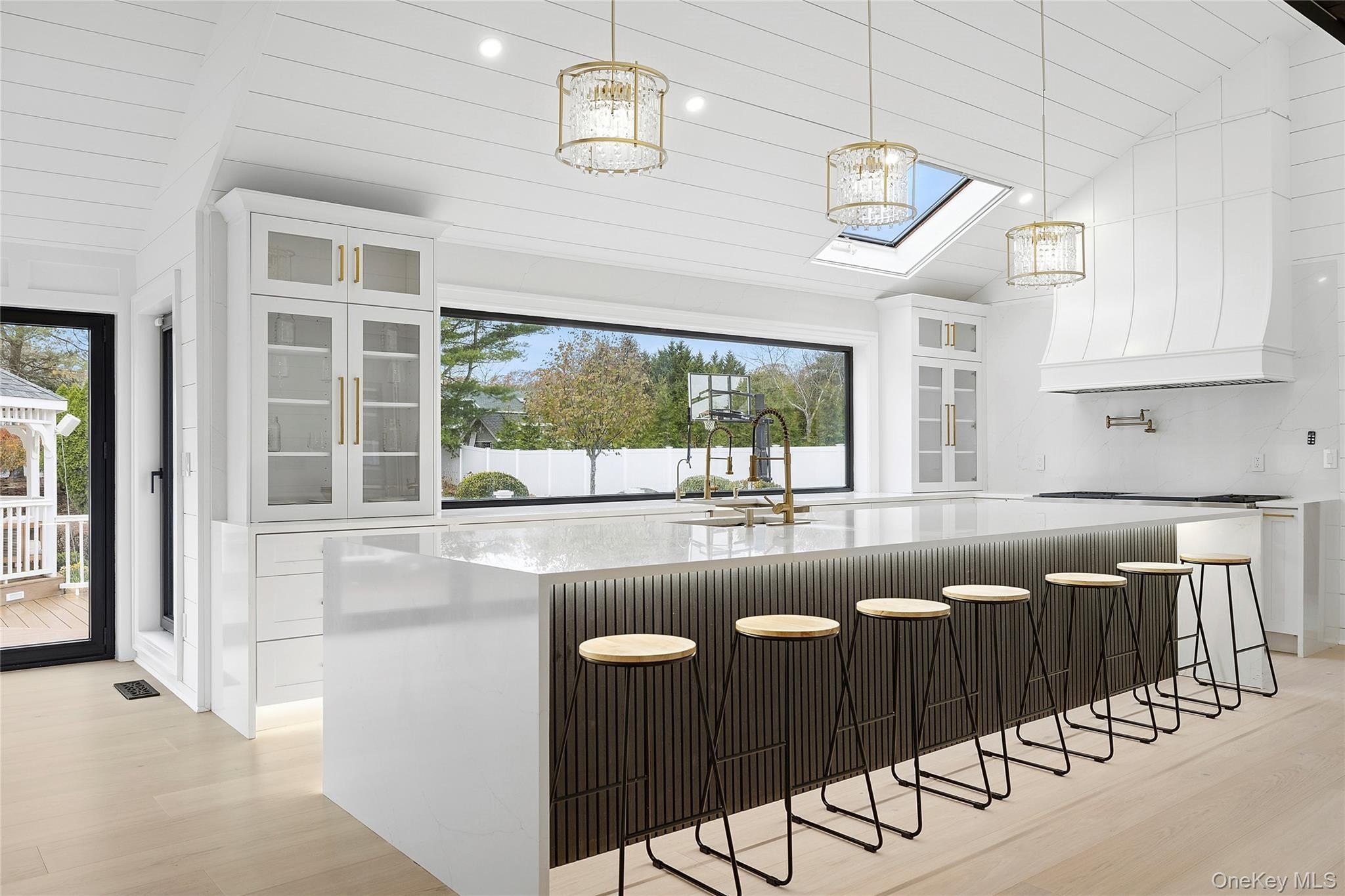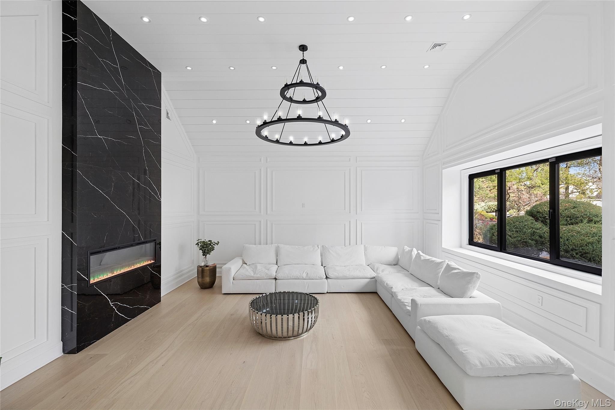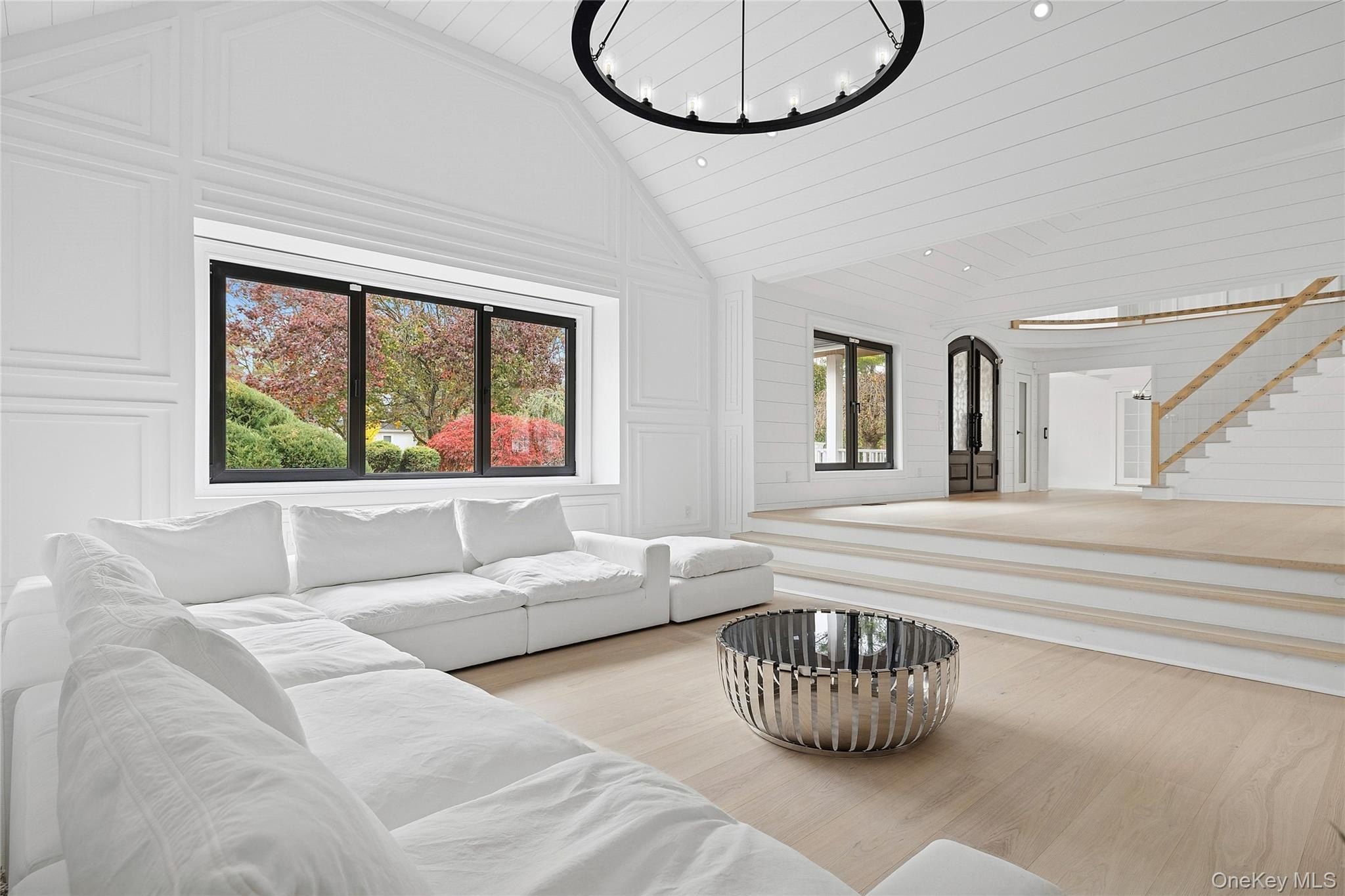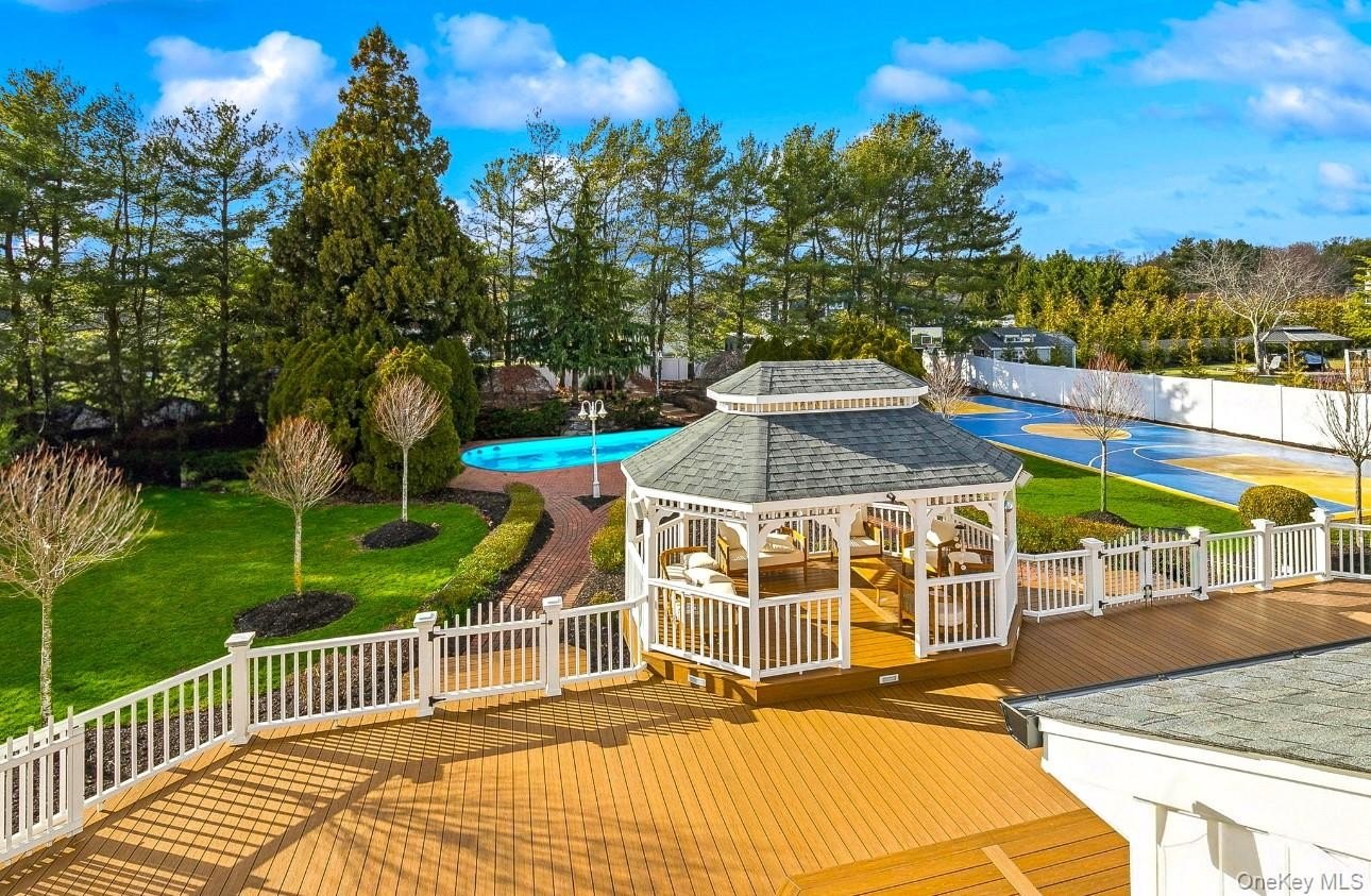 Stunning 4,000 square foot Hampton-style farm ranch, set on a private cul-de-sac and completely remodeled in 2024. This custom-built residence welcomes you with a grand entry foyer featuring 20-foot cathedral ceilings, intricate custom millwork, and white oak hardwood floors with radiant heat throughout. The first floor offers a formal living room with a floor-to-ceiling marble fireplace and bar area, a spacious dining room that opens to the backyard, and an oversized chef's kitchen with a 16-foot island, 60-inch Wolf range, double wall ovens, Subzero side-by-side refrigerator and freezer, a Thermador 7-foot wine cooler, walk-in pantry, butler's pantry, and custom cabinetry. The primary suite includes its own fireplace, a luxurious marble bath with freestanding tub and rain shower, radiant heated floors, and a custom California Closet walk-in wardrobe. Two additional bedrooms and beautifully appointed baths complete the main level, which also features Restoration Hardware chandeliers, three marble fireplaces, radiant heat throughout, Lutron lighting, and a new central air system. Upstairs, a loft overlooks the main living space and leads to two additional bedrooms, including a suite with a steam bath, walk-in closet, and laundry. The 3,000 square foot unfinished basement provides endless potential for additional living or recreation. Outdoors, the property is designed for entertaining with an expansive Peruvian teak deck, paved patio, custom gazebo, free-form heated saltwater pool, and a basketball court, all surrounded by lush landscaping. Ideally located near Stony Brook University, shopping, schools, restaurants, the LIRR, and three hospitals, this extraordinary residence offers the ideal blend of luxury, comfort, and indoor-outdoor living.