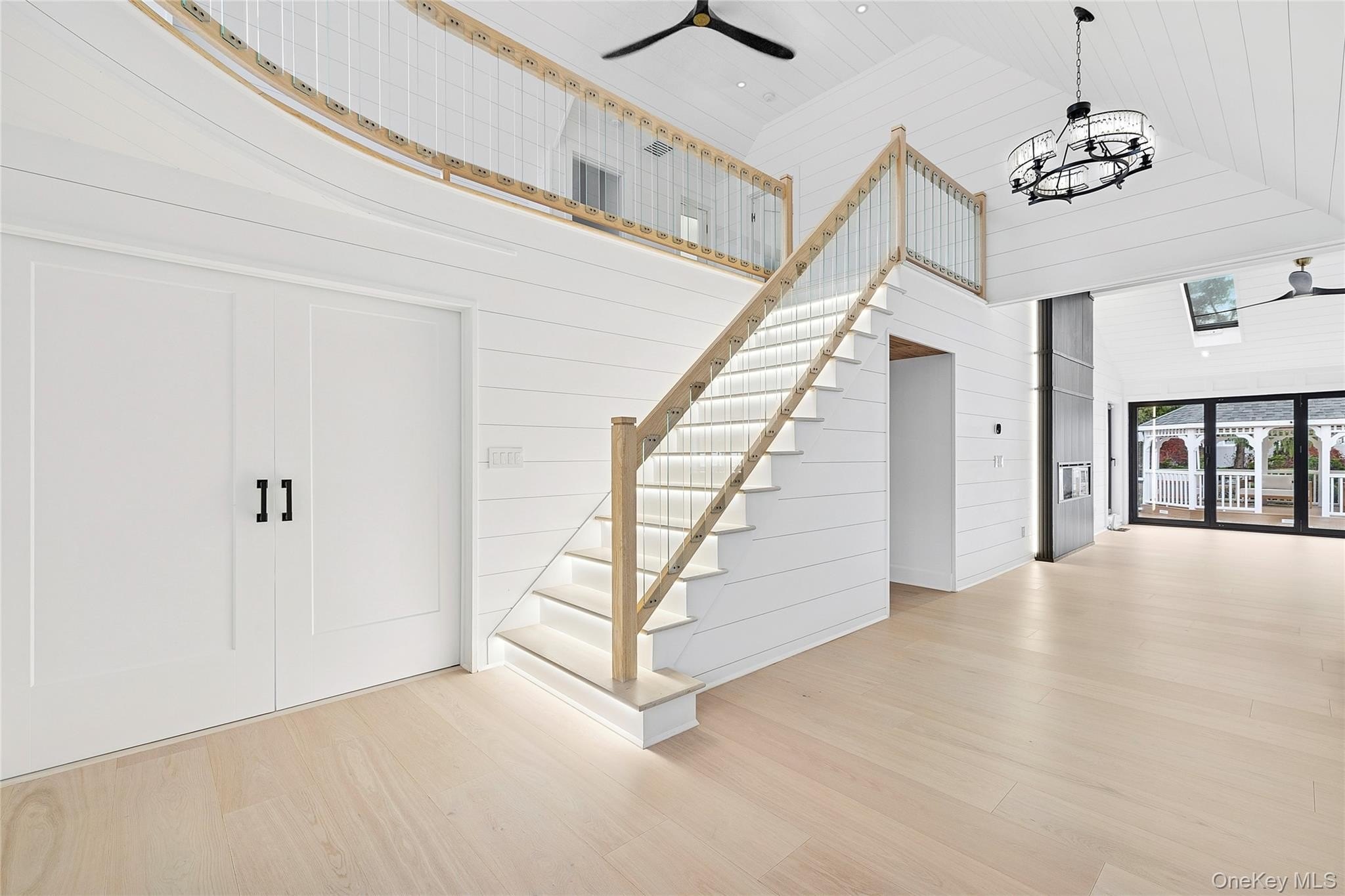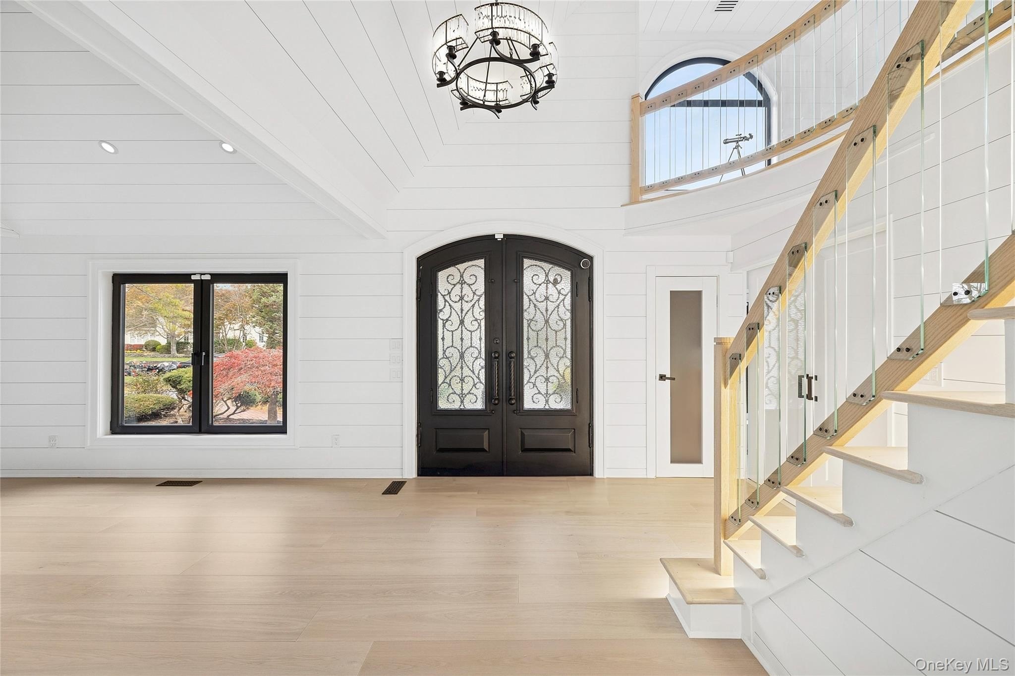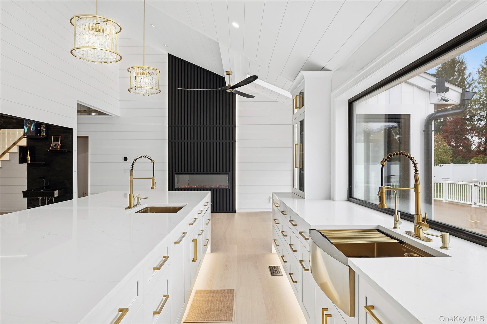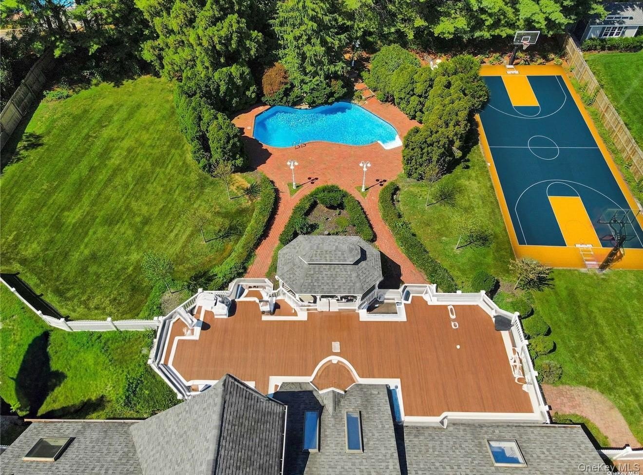 Stunning 4,000 square foot Hampton-style farm ranch, set on a private cul-de-sac and completely remodeled in 2024. This custom-built residence welcomes you with a grand entry foyer featuring 20-foot cathedral ceilings, intricate custom millwork, and white oak hardwood floors with radiant heat throughout. The first floor offers a formal living room with a floor-to-ceiling marble fireplace and bar area, a spacious dining room that opens to the backyard, and an oversized chef's kitchen with a 16-foot island, 60-inch Wolf range, double wall ovens, Subzero side-by-side refrigerator and freezer, a Thermador 7-foot wine cooler, walk-in pantry, butler's pantry, and custom cabinetry. The primary suite includes its own fireplace, a luxurious marble bath with freestanding tub and rain shower, radiant heated floors, and a custom California Closet walk-in wardrobe. Two additional bedrooms and beautifully appointed baths complete the main level, which also features Restoration Hardware chandeliers, three marble fireplaces, radiant heat throughout, Lutron lighting, and a new central air system. Upstairs, a loft overlooks the main living space and leads to two additional bedrooms, including a suite with a steam bath, walk-in closet, and laundry. The 3,000 square foot unfinished basement provides endless potential for additional living or recreation. Outdoors, the property is designed for entertaining with an expansive Peruvian teak deck, paved patio, custom gazebo, free-form heated saltwater pool, and a basketball court, all surrounded by lush landscaping. Ideally located near Stony Brook University, shopping, schools, restaurants, the LIRR, and three hospitals, this extraordinary residence offers the ideal blend of luxury, comfort, and indoor-outdoor living.