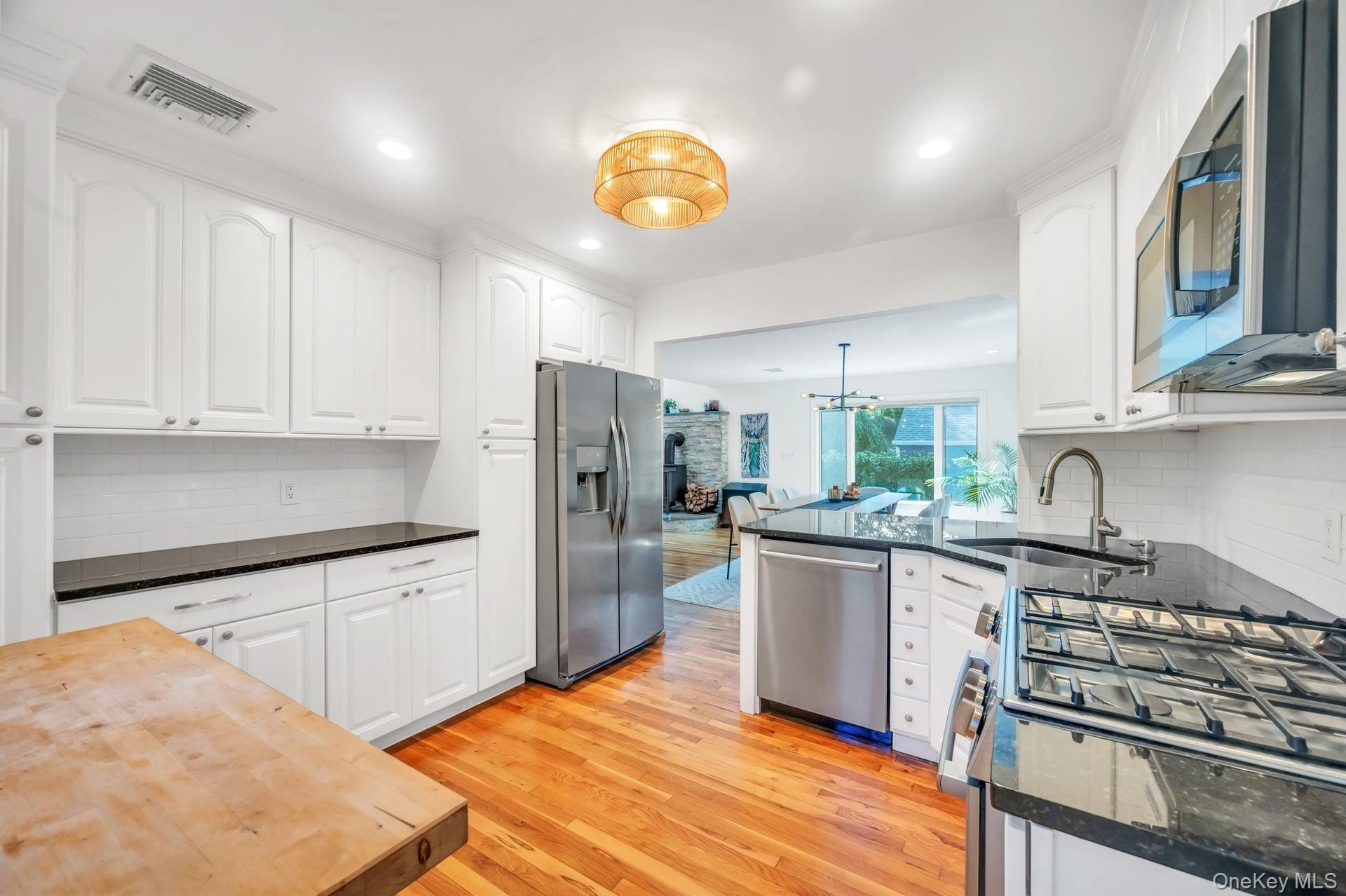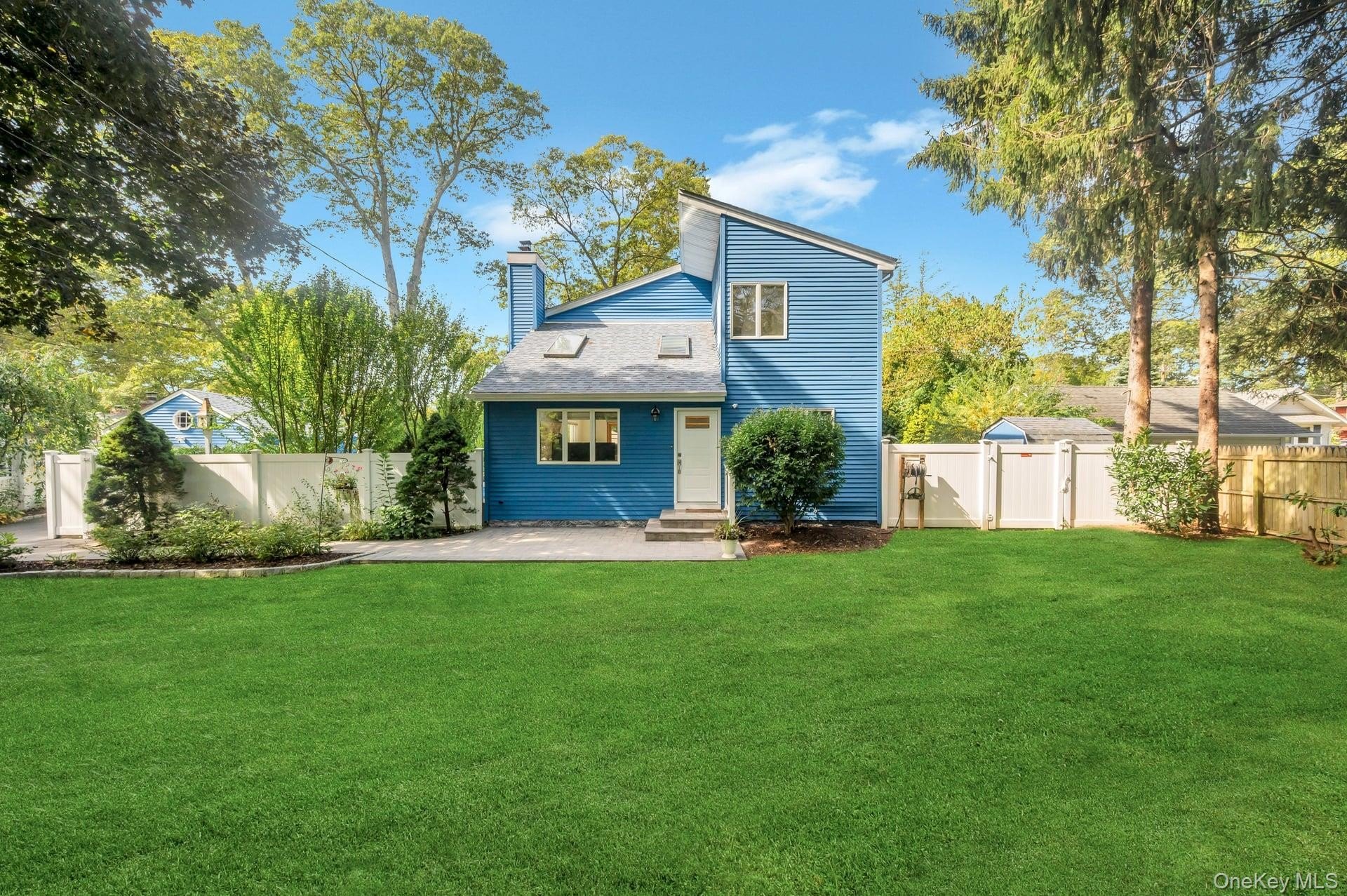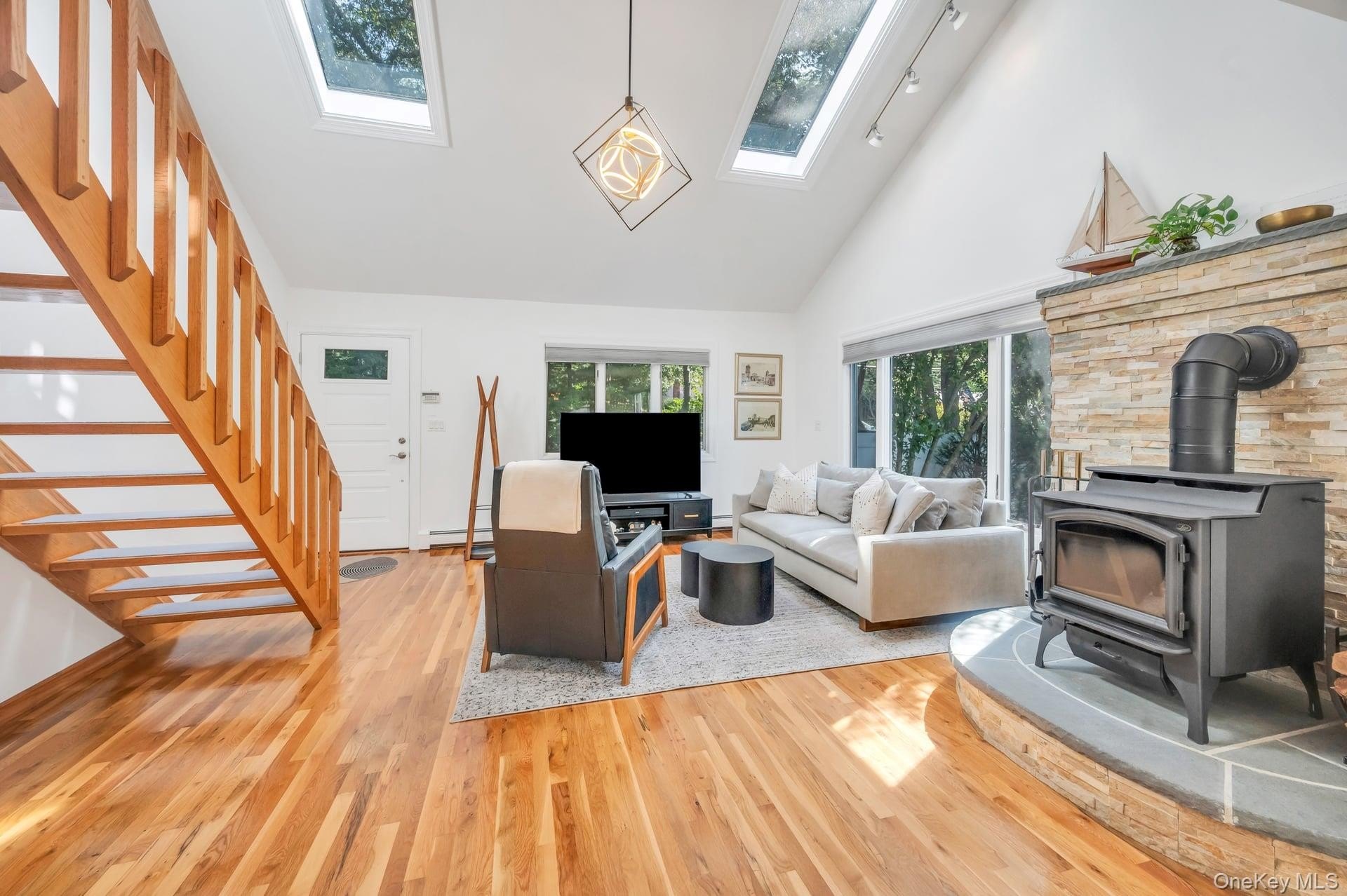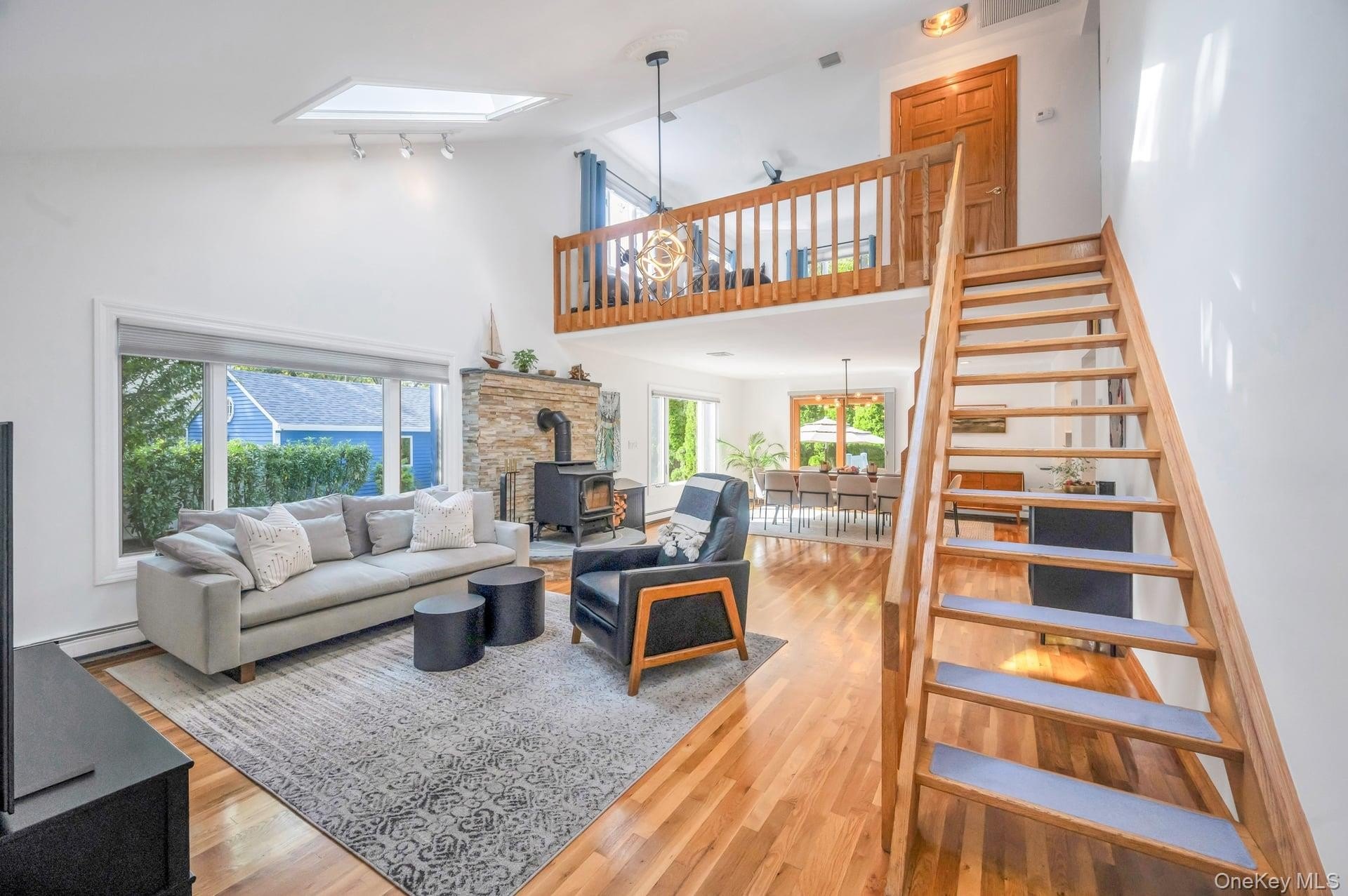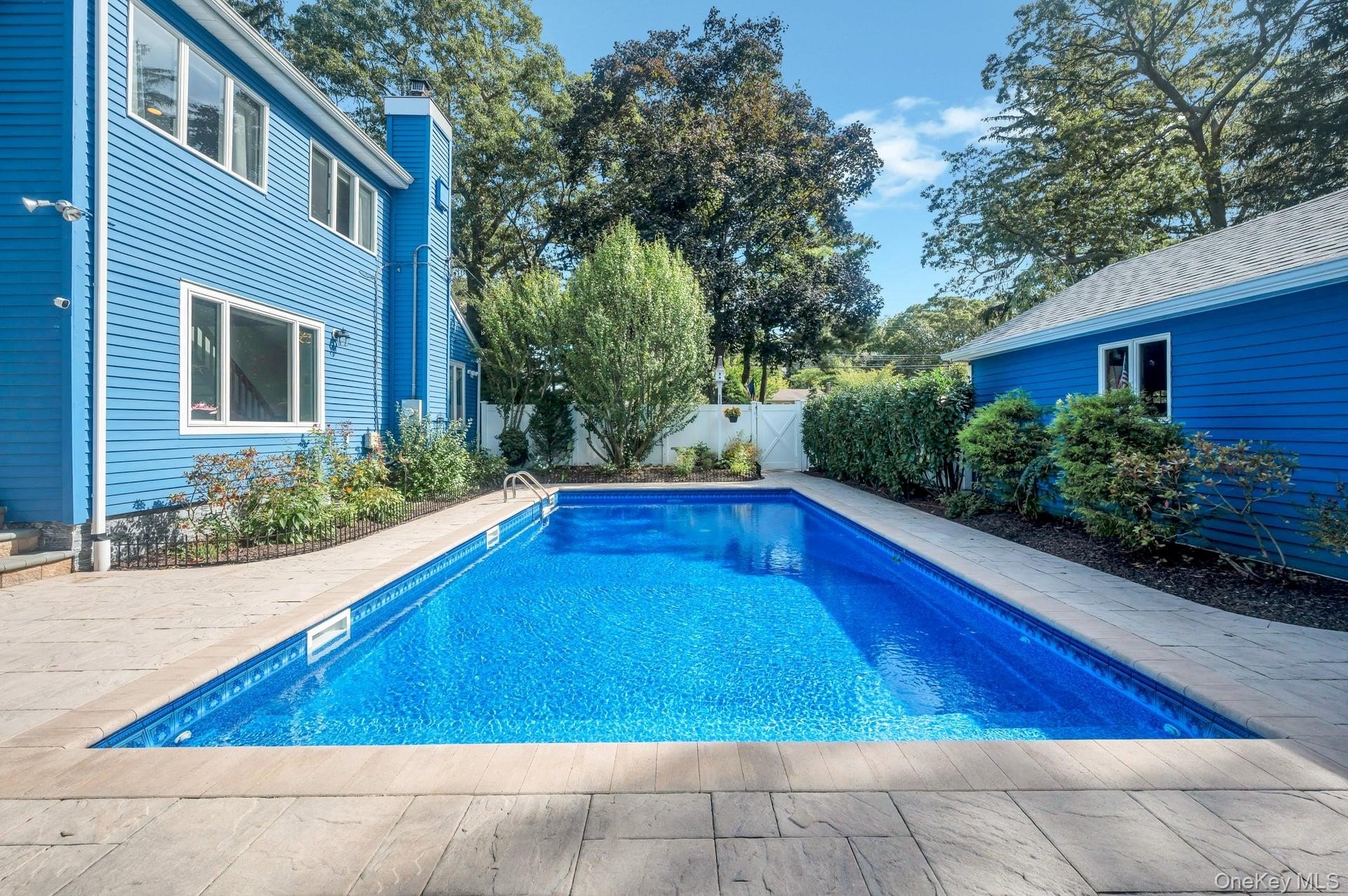 Incredible opportunity to own a magnificent newer-built home boasting a two-year-old roof, setback on the property with mature landscaping that creates privacy and seclusion from the moment you arrive. A long blacktop driveway with a Belgian block border leads to a two-car detached garage with electric, one large garage door, and white PVC fencing framing the grounds. The front approach is highlighted by a custom paver porch and beautiful cultured stone skirt wrapping the home, setting the tone for what's inside and out. The backyard is a true resort, featuring an enormous paver patio, heated saltwater inground pool, multiple entertaining spaces, a portion of the yard finished with Astroturf for low-maintenance beauty while the front yard remains lush grass, and several entrances into the home for seamless indoor-outdoor living. The pool is perfectly positioned between the house and garage, creating a tranquil, private oasis. Inside, a brand-new white front door with glass top opens into a dramatic two-story grand entry with soaring vaulted ceilings, recessed lighting, and oversized windows that fill the space with natural light. The formal living room is centered around a one-year-old Lopi Endeavor wood-burning stove set against a cultured stone wall, while the formal dining room is highlighted by a modern nine-bulb chandelier and a huge slider leading directly to the rear yard. The chef's kitchen is outfitted with white cabinetry, granite countertops, stainless steel Bosch stove and dishwasher, stainless steel refrigerator with water and ice, subway tile backsplash, and a breakfast bar, all flowing seamlessly into a brand-new mudroom complete with LG front-loading washer and dryer, white cabinetry, hanging storage, and yet another access point to the backyard. The first floor offers one bedroom, making it ideal for a home office, out-of-town guests, or extended family, along with a full bath featuring floor-to-ceiling tile, a glass stand-up shower, and modern fixtures. Upstairs you'll find a versatile den/bonus room or additional bedroom with updated hardwood floors and ceiling fan, plus an incredible primary suite with ceiling fan and a brand-new spa-like bath with glass tub and shower with built-in soap niches, custom tile flooring, and white vanity. A spacious additional bedroom with new flooring and a six-panel fog glass closet door rounds out the second floor. This home is packed with upgrades including 200-amp electrical service, Andersen windows, a less than one-year-old high-efficiency boiler, propane cooking, a separate cesspool and dry well, and a five-zone inground sprinkler system. Truly one-of-a-kind, this property combines modern finishes, meticulous updates, resort-style outdoor living, and every high-end feature today's buyer could want.