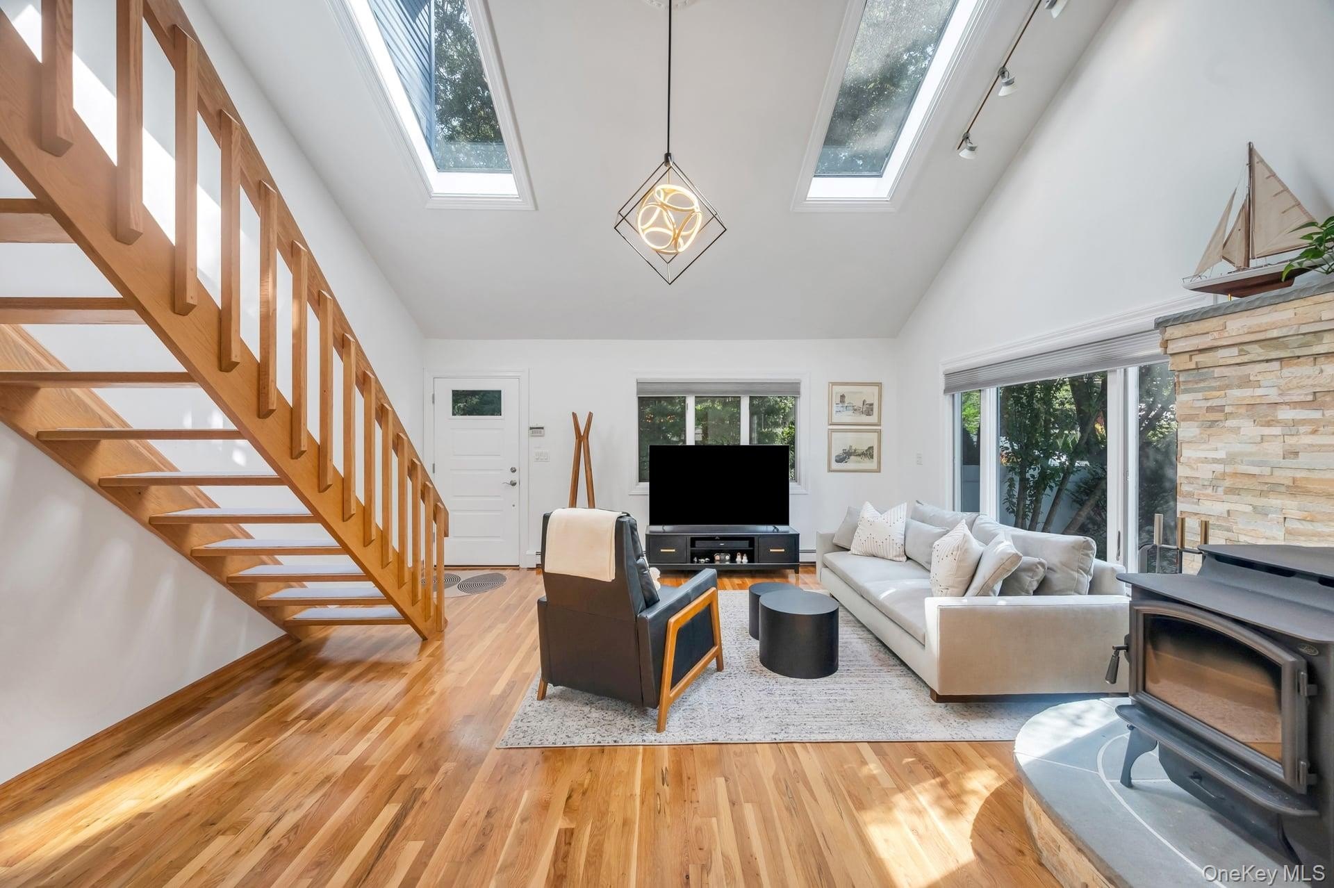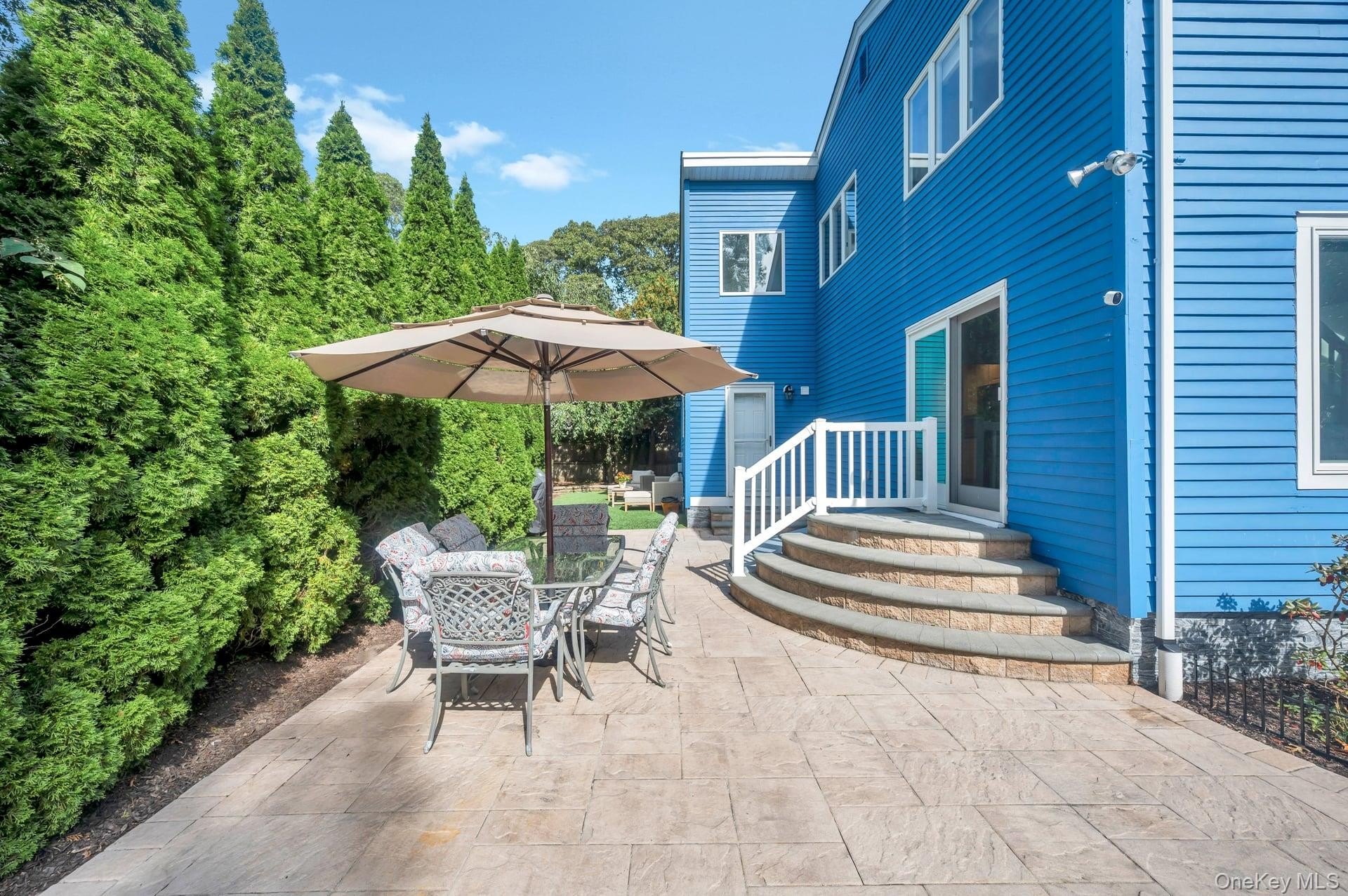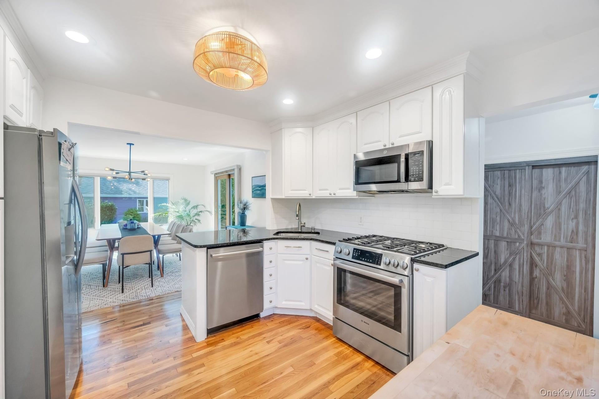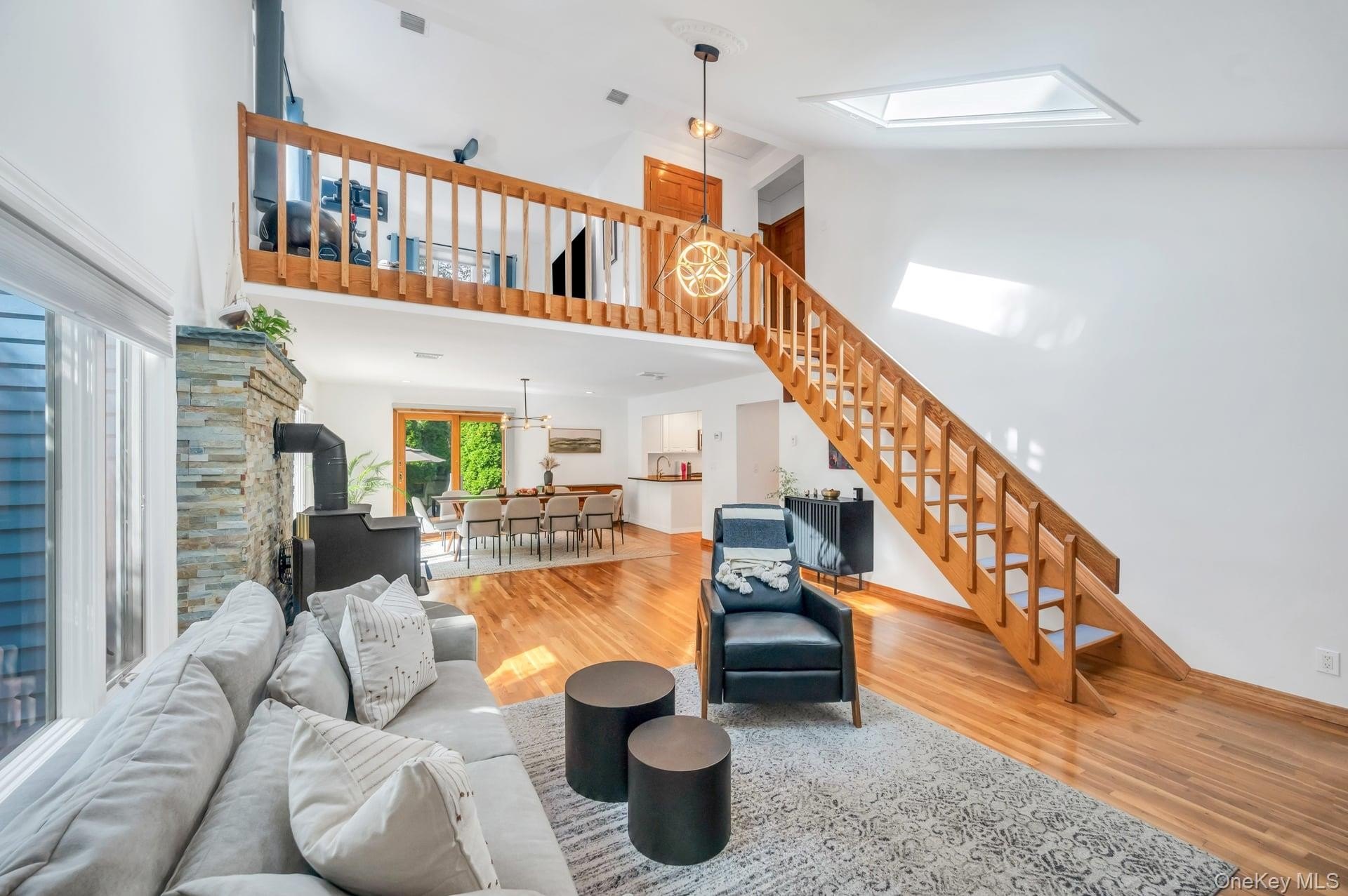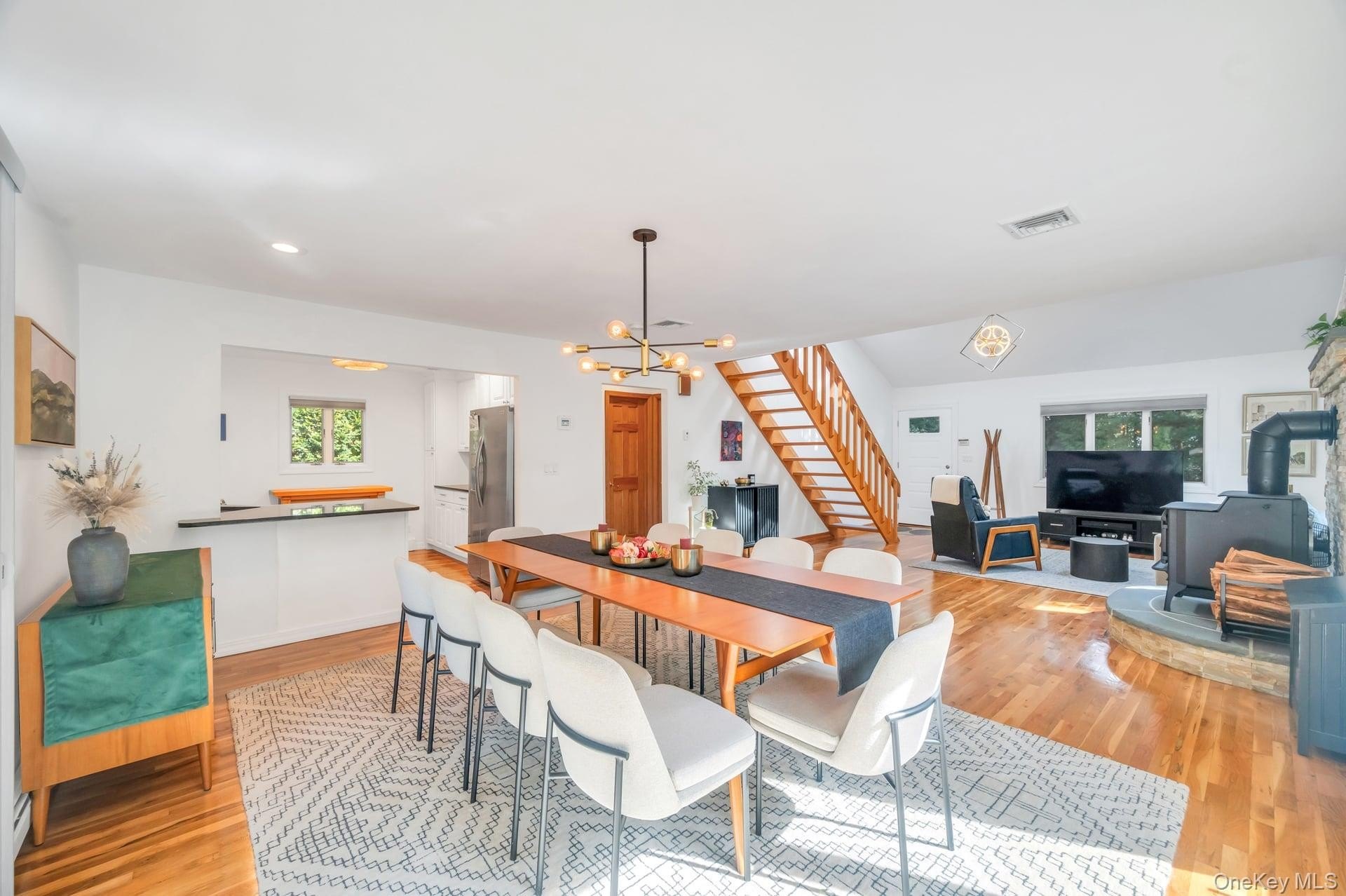 Incredible opportunity to own a magnificent newer-built home boasting a two-year-old roof, setback on the property with mature landscaping that creates privacy and seclusion from the moment you arrive. A long blacktop driveway with a Belgian block border leads to a two-car detached garage with electric, one large garage door, and white PVC fencing framing the grounds. The front approach is highlighted by a custom paver porch and beautiful cultured stone skirt wrapping the home, setting the tone for what's inside and out. The backyard is a true resort, featuring an enormous paver patio, heated saltwater inground pool, multiple entertaining spaces, a portion of the yard finished with Astroturf for low-maintenance beauty while the front yard remains lush grass, and several entrances into the home for seamless indoor-outdoor living. The pool is perfectly positioned between the house and garage, creating a tranquil, private oasis. Inside, a brand-new white front door with glass top opens into a dramatic two-story grand entry with soaring vaulted ceilings, recessed lighting, and oversized windows that fill the space with natural light. The formal living room is centered around a one-year-old Lopi Endeavor wood-burning stove set against a cultured stone wall, while the formal dining room is highlighted by a modern nine-bulb chandelier and a huge slider leading directly to the rear yard. The chef's kitchen is outfitted with white cabinetry, granite countertops, stainless steel Bosch stove and dishwasher, stainless steel refrigerator with water and ice, subway tile backsplash, and a breakfast bar, all flowing seamlessly into a brand-new mudroom complete with LG front-loading washer and dryer, white cabinetry, hanging storage, and yet another access point to the backyard. The first floor offers one bedroom, making it ideal for a home office, out-of-town guests, or extended family, along with a full bath featuring floor-to-ceiling tile, a glass stand-up shower, and modern fixtures. Upstairs you'll find a versatile den/bonus room or additional bedroom with updated hardwood floors and ceiling fan, plus an incredible primary suite with ceiling fan and a brand-new spa-like bath with glass tub and shower with built-in soap niches, custom tile flooring, and white vanity. A spacious additional bedroom with new flooring and a six-panel fog glass closet door rounds out the second floor. This home is packed with upgrades including 200-amp electrical service, Andersen windows, a less than one-year-old high-efficiency boiler, propane cooking, a separate cesspool and dry well, and a five-zone inground sprinkler system. Truly one-of-a-kind, this property combines modern finishes, meticulous updates, resort-style outdoor living, and every high-end feature today's buyer could want.