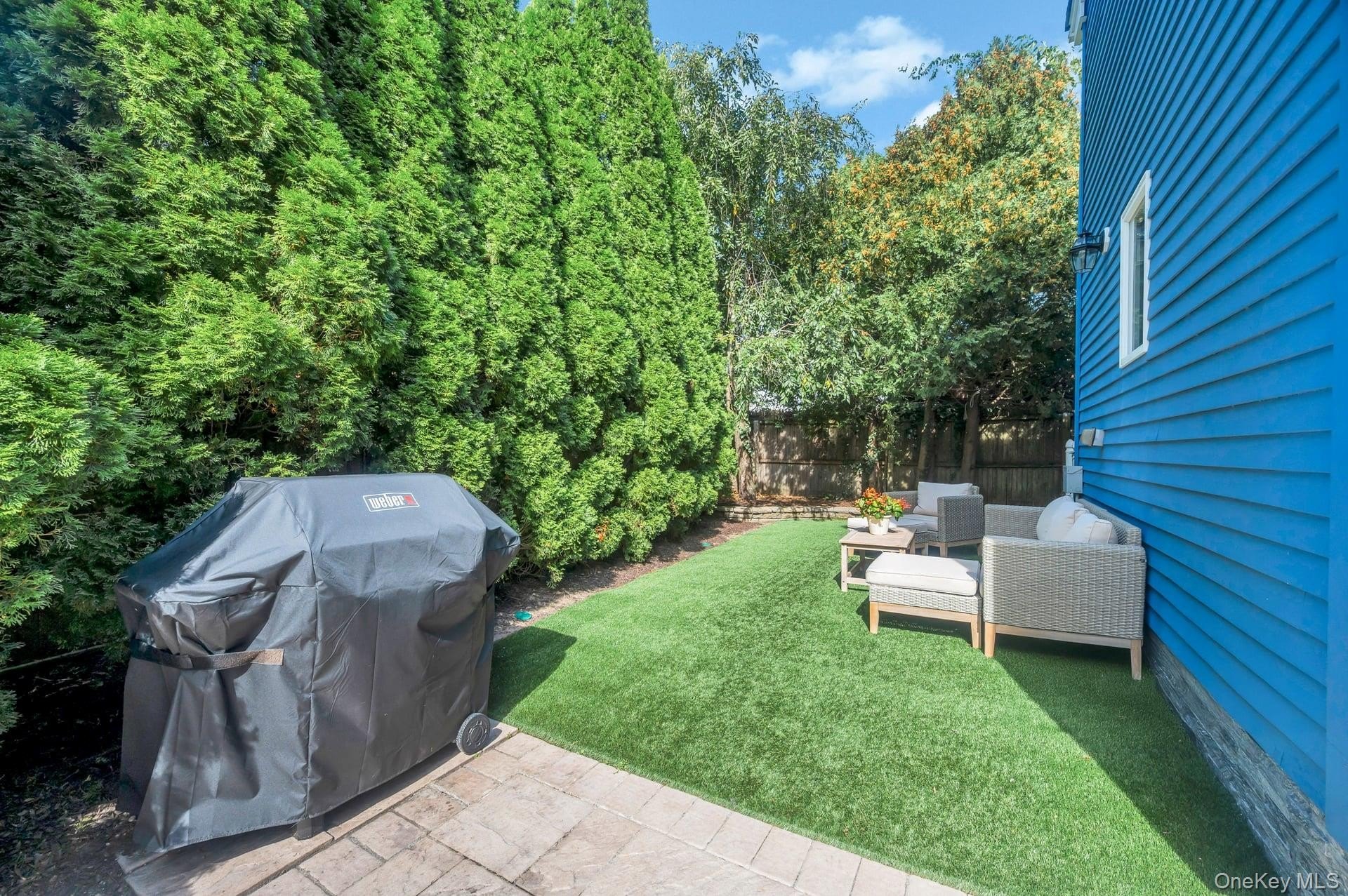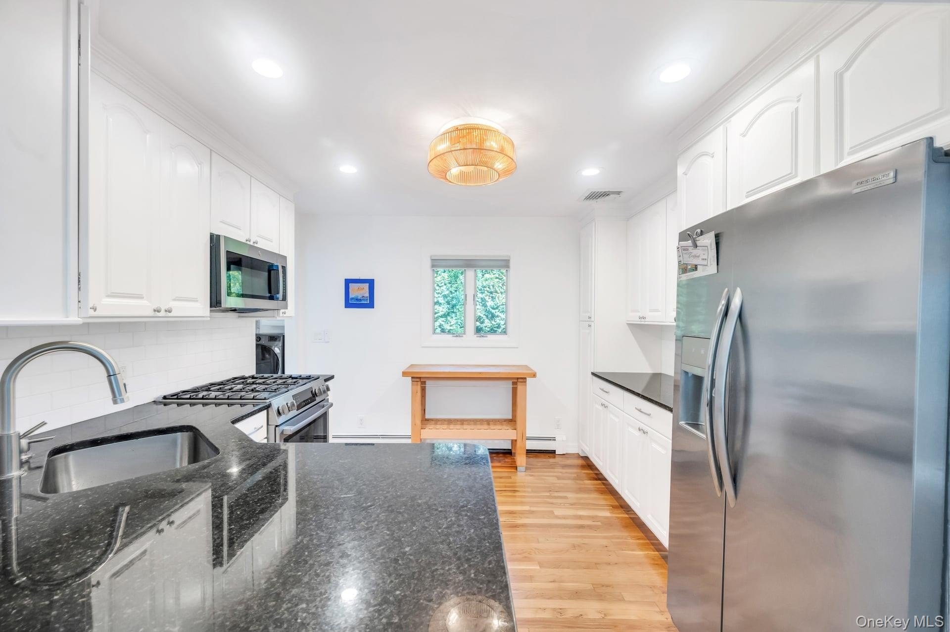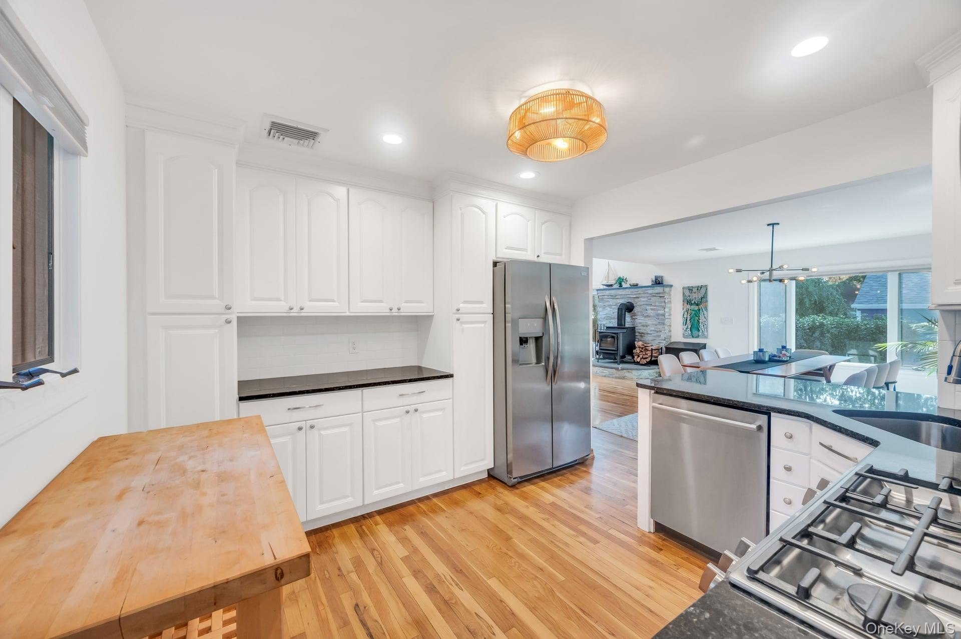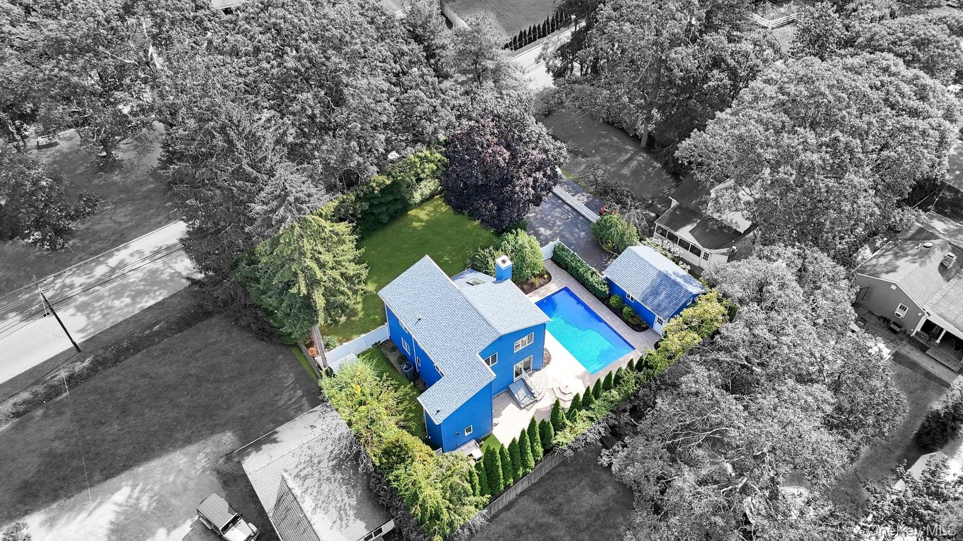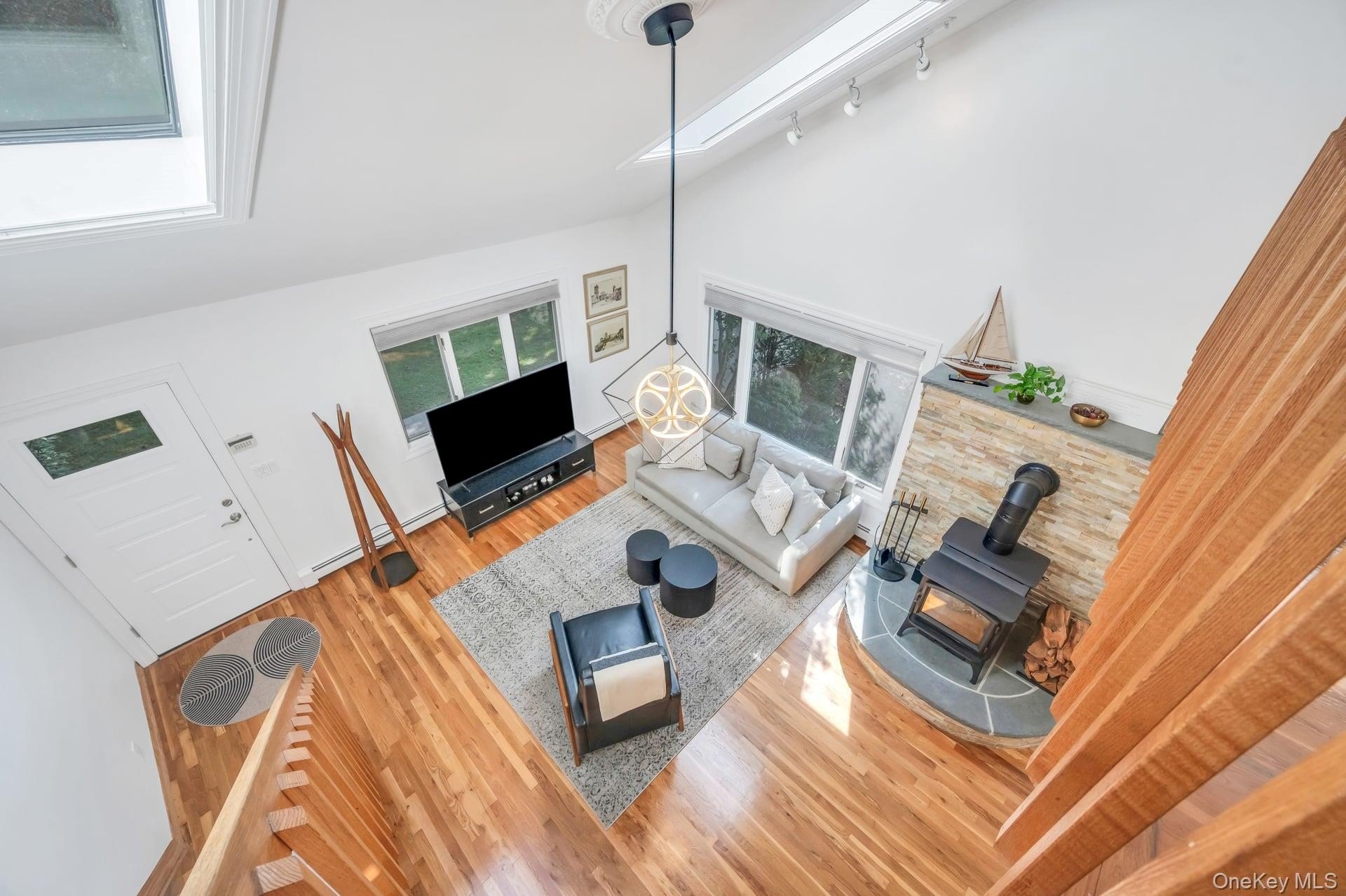 Incredible opportunity to own a magnificent newer-built home boasting a two-year-old roof, setback on the property with mature landscaping that creates privacy and seclusion from the moment you arrive. A long blacktop driveway with a Belgian block border leads to a two-car detached garage with electric, one large garage door, and white PVC fencing framing the grounds. The front approach is highlighted by a custom paver porch and beautiful cultured stone skirt wrapping the home, setting the tone for what's inside and out. The backyard is a true resort, featuring an enormous paver patio, heated saltwater inground pool, multiple entertaining spaces, a portion of the yard finished with Astroturf for low-maintenance beauty while the front yard remains lush grass, and several entrances into the home for seamless indoor-outdoor living. The pool is perfectly positioned between the house and garage, creating a tranquil, private oasis. Inside, a brand-new white front door with glass top opens into a dramatic two-story grand entry with soaring vaulted ceilings, recessed lighting, and oversized windows that fill the space with natural light. The formal living room is centered around a one-year-old Lopi Endeavor wood-burning stove set against a cultured stone wall, while the formal dining room is highlighted by a modern nine-bulb chandelier and a huge slider leading directly to the rear yard. The chef's kitchen is outfitted with white cabinetry, granite countertops, stainless steel Bosch stove and dishwasher, stainless steel refrigerator with water and ice, subway tile backsplash, and a breakfast bar, all flowing seamlessly into a brand-new mudroom complete with LG front-loading washer and dryer, white cabinetry, hanging storage, and yet another access point to the backyard. The first floor offers one bedroom, making it ideal for a home office, out-of-town guests, or extended family, along with a full bath featuring floor-to-ceiling tile, a glass stand-up shower, and modern fixtures. Upstairs you'll find a versatile den/bonus room or additional bedroom with updated hardwood floors and ceiling fan, plus an incredible primary suite with ceiling fan and a brand-new spa-like bath with glass tub and shower with built-in soap niches, custom tile flooring, and white vanity. A spacious additional bedroom with new flooring and a six-panel fog glass closet door rounds out the second floor. This home is packed with upgrades including 200-amp electrical service, Andersen windows, a less than one-year-old high-efficiency boiler, propane cooking, a separate cesspool and dry well, and a five-zone inground sprinkler system. Truly one-of-a-kind, this property combines modern finishes, meticulous updates, resort-style outdoor living, and every high-end feature today's buyer could want.