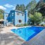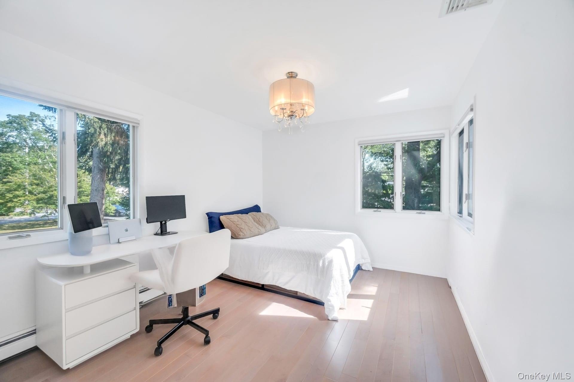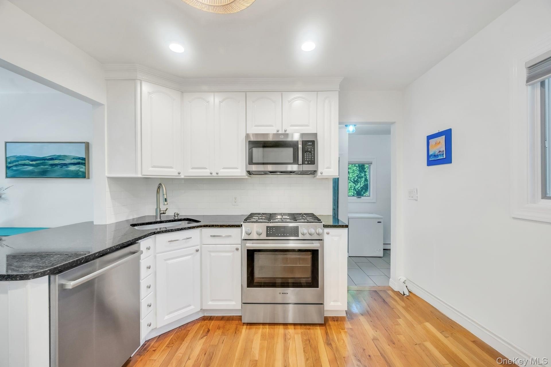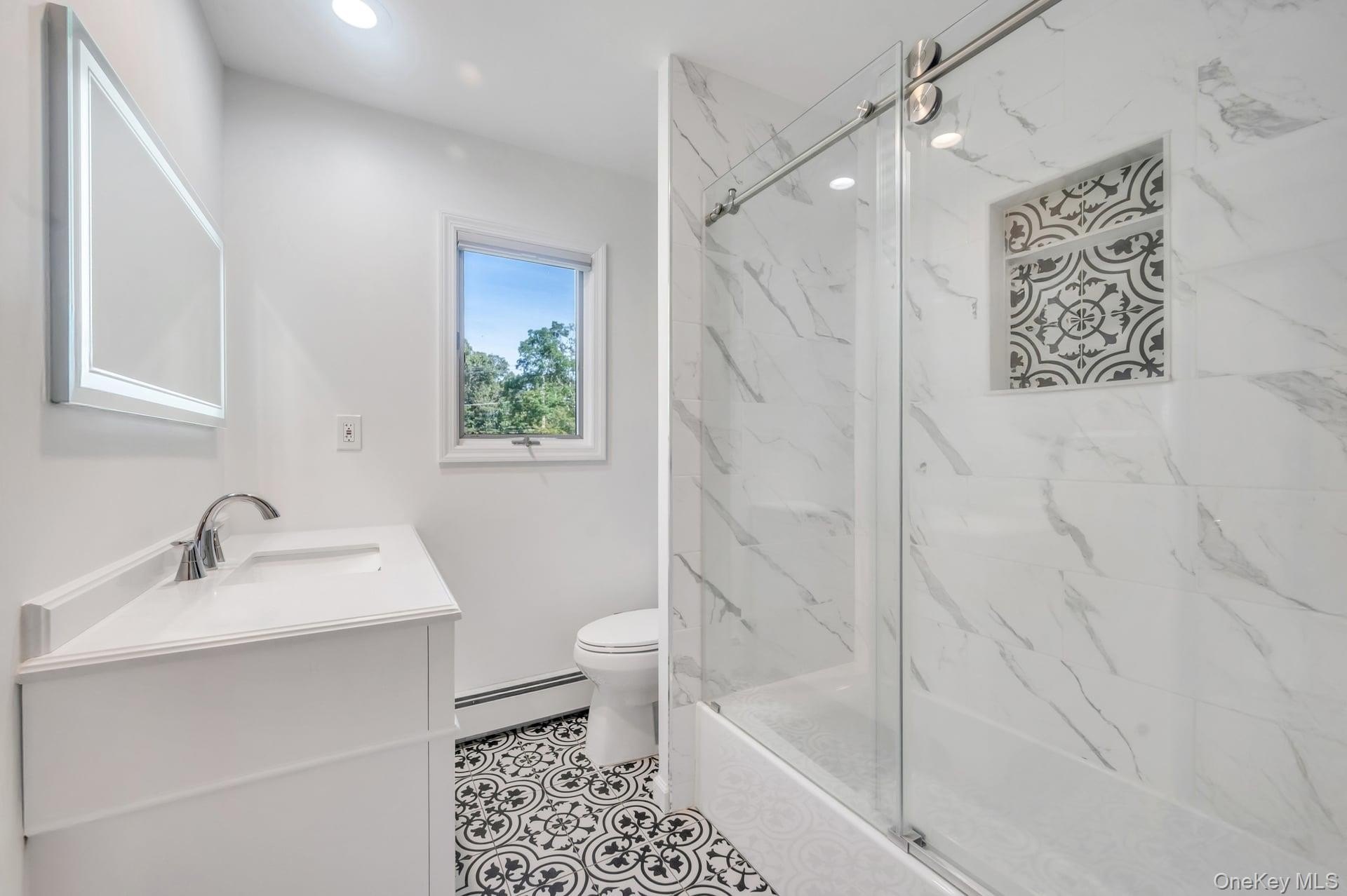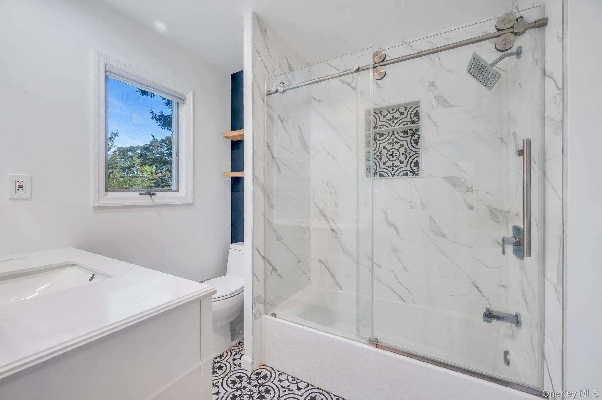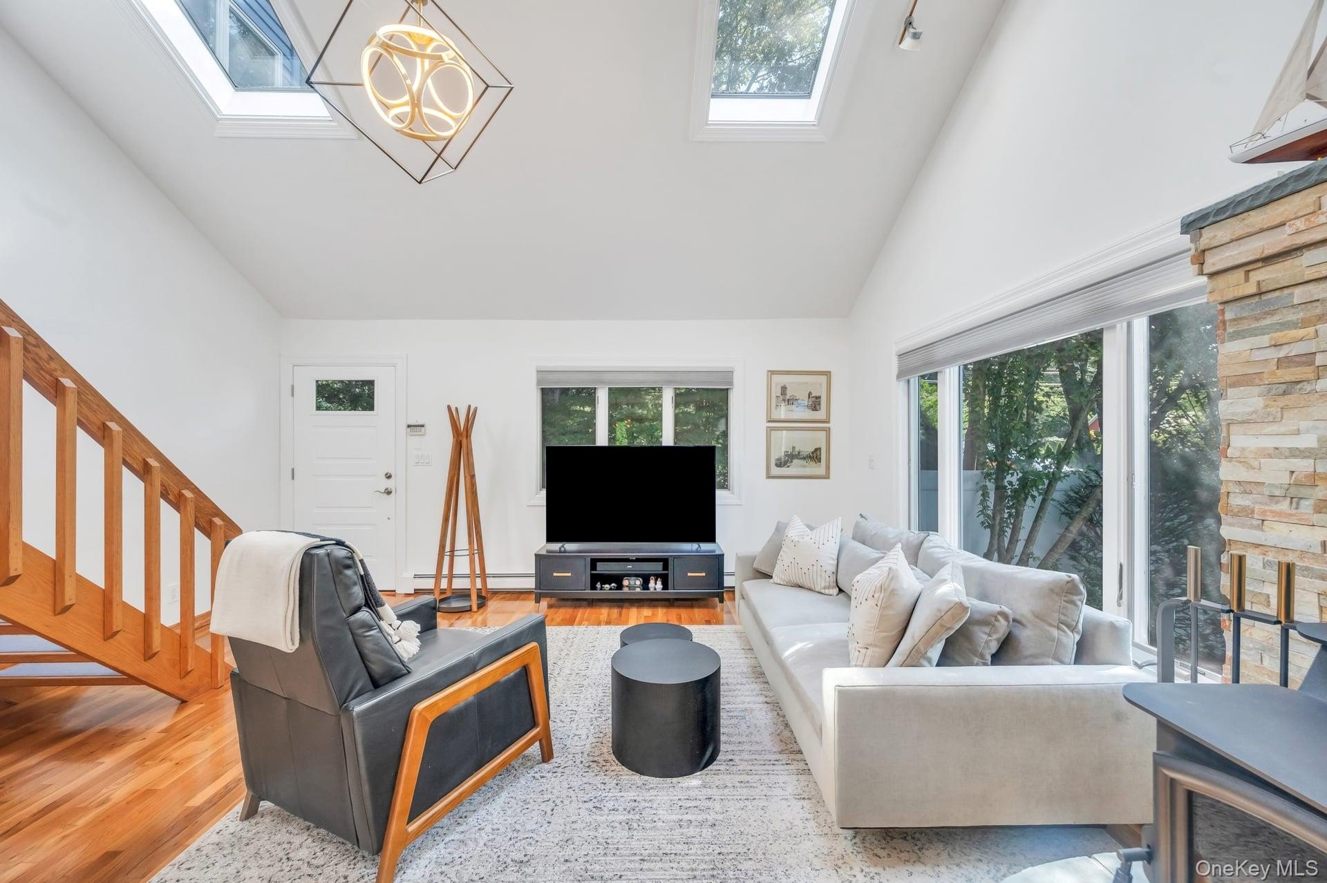 Incredible opportunity to own a magnificent newer-built home boasting a two-year-old roof, setback on the property with mature landscaping that creates privacy and seclusion from the moment you arrive. A long blacktop driveway with a Belgian block border leads to a two-car detached garage with electric, one large garage door, and white PVC fencing framing the grounds. The front approach is highlighted by a custom paver porch and beautiful cultured stone skirt wrapping the home, setting the tone for what's inside and out. The backyard is a true resort, featuring an enormous paver patio, heated saltwater inground pool, multiple entertaining spaces, a portion of the yard finished with Astroturf for low-maintenance beauty while the front yard remains lush grass, and several entrances into the home for seamless indoor-outdoor living. The pool is perfectly positioned between the house and garage, creating a tranquil, private oasis. Inside, a brand-new white front door with glass top opens into a dramatic two-story grand entry with soaring vaulted ceilings, recessed lighting, and oversized windows that fill the space with natural light. The formal living room is centered around a one-year-old Lopi Endeavor wood-burning stove set against a cultured stone wall, while the formal dining room is highlighted by a modern nine-bulb chandelier and a huge slider leading directly to the rear yard. The chef's kitchen is outfitted with white cabinetry, granite countertops, stainless steel Bosch stove and dishwasher, stainless steel refrigerator with water and ice, subway tile backsplash, and a breakfast bar, all flowing seamlessly into a brand-new mudroom complete with LG front-loading washer and dryer, white cabinetry, hanging storage, and yet another access point to the backyard. The first floor offers one bedroom, making it ideal for a home office, out-of-town guests, or extended family, along with a full bath featuring floor-to-ceiling tile, a glass stand-up shower, and modern fixtures. Upstairs you'll find a versatile den/bonus room or additional bedroom with updated hardwood floors and ceiling fan, plus an incredible primary suite with ceiling fan and a brand-new spa-like bath with glass tub and shower with built-in soap niches, custom tile flooring, and white vanity. A spacious additional bedroom with new flooring and a six-panel fog glass closet door rounds out the second floor. This home is packed with upgrades including 200-amp electrical service, Andersen windows, a less than one-year-old high-efficiency boiler, propane cooking, a separate cesspool and dry well, and a five-zone inground sprinkler system. Truly one-of-a-kind, this property combines modern finishes, meticulous updates, resort-style outdoor living, and every high-end feature today's buyer could want.