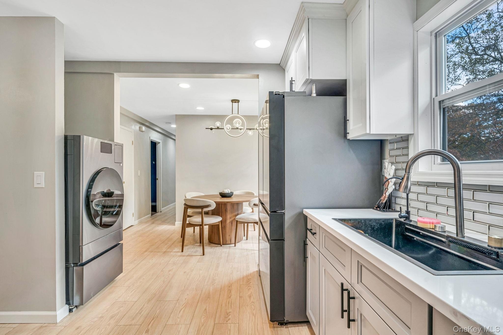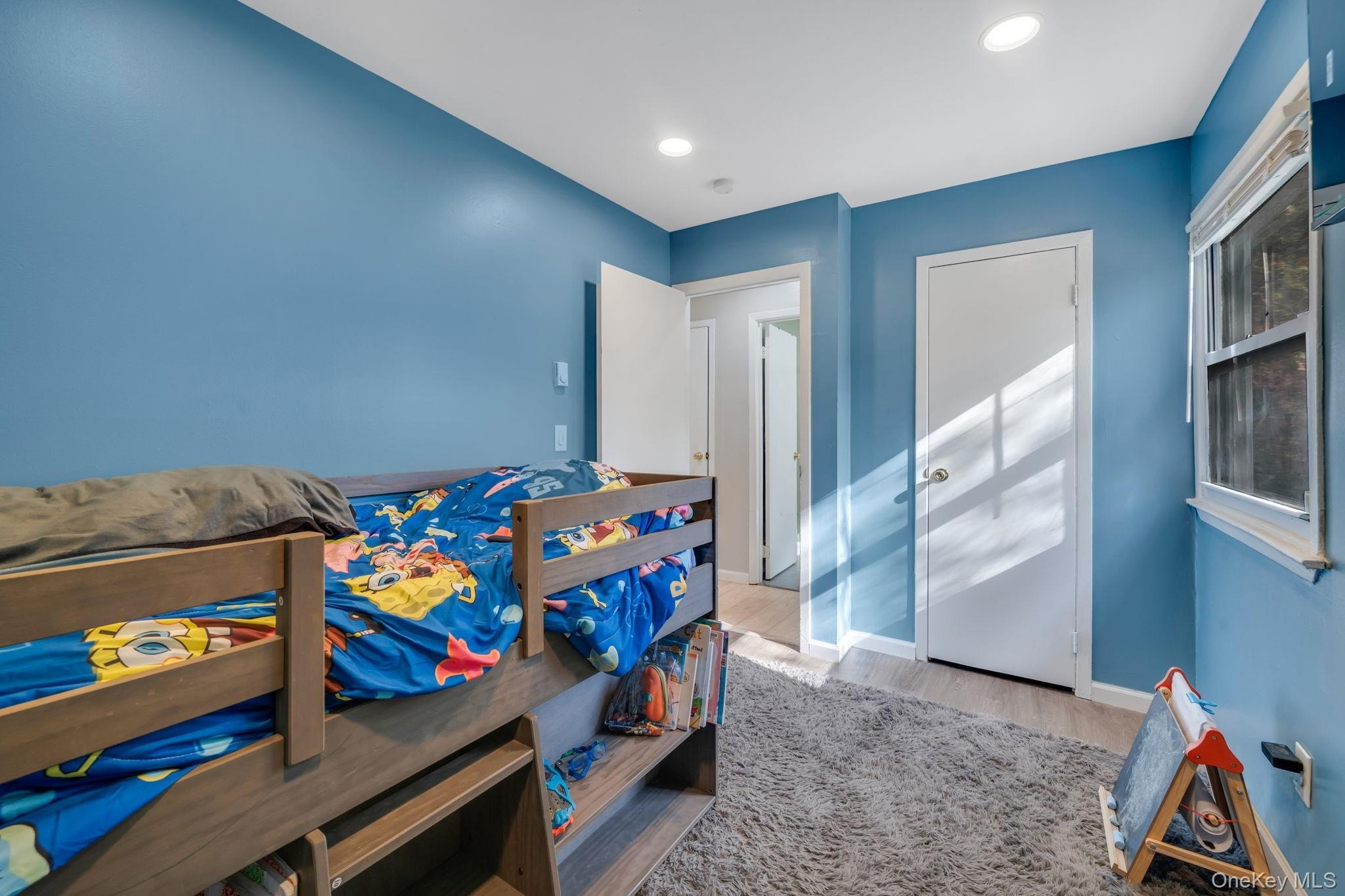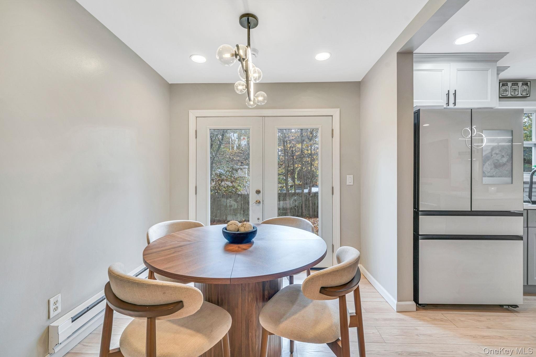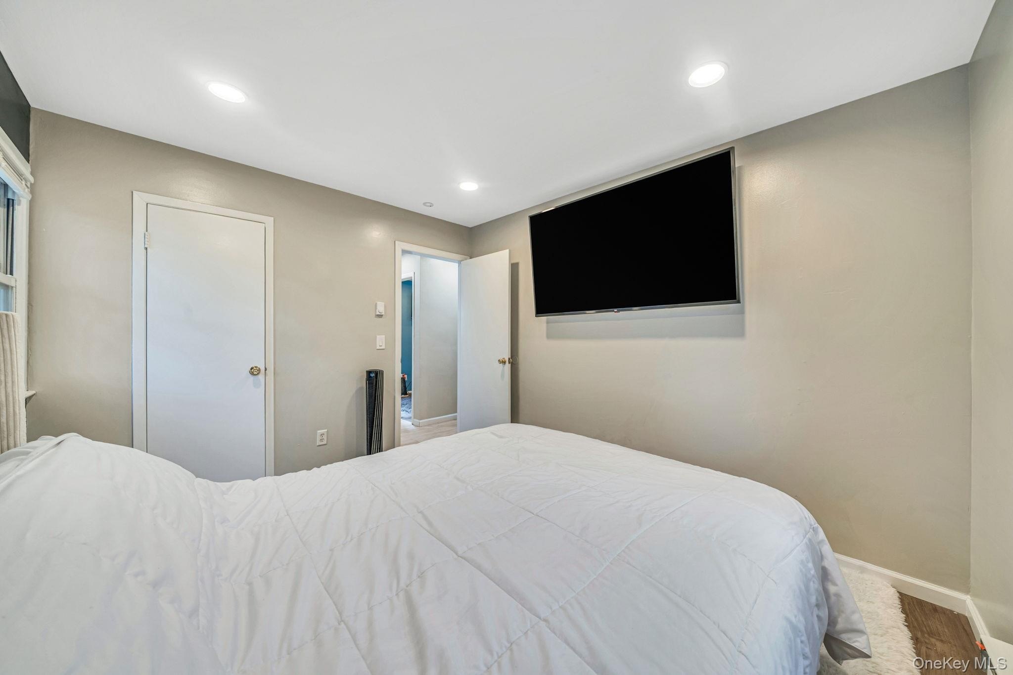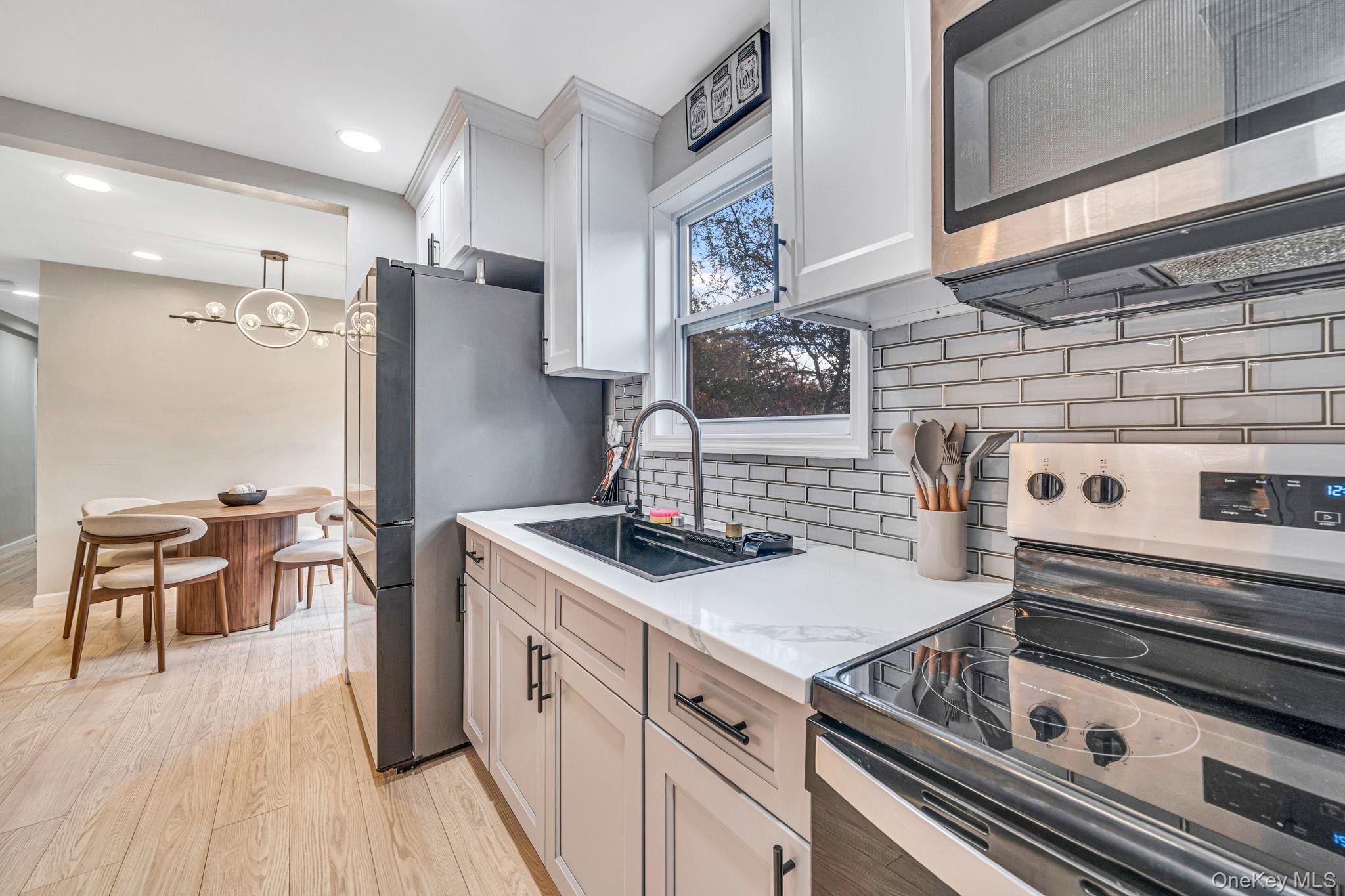 Welcome to this exquisite and renovated three-bedroom, one-bath ranch located on a peaceful, tree-lined block in Medford. Immaculately maintained and thoughtfully upgraded throughout, this home offers the perfect combination of modern design, comfort, and functionality. The renovated chef's kitchen features quartz countertops, a classic subway tile backsplash, slow-close cabinetry, a large island with pendant lighting and additional seating, and a multifunctional farmhouse sink. An open-concept living area creates a seamless flow, ideal for entertaining. Enjoy the warmth of the electric fireplace, a built-in storage system, recessed lighting, and luxury vinyl flooring throughout. The formal dining room features a modern pendant fixture and French doors that open to a private backyard oasis-perfect for gatherings or quiet relaxation. All three bedrooms are generously sized with large windows that fill the home with natural sunlight. The beautifully renovated bathroom showcases custom tile work, a rain shower head, sliding glass shower doors, a double vanity, a Broan vent fan/speaker with Bluetooth capability, and a smart mirror with built-in defogger. Additional updates include a new roof, vinyl siding, new windows, an eco-smart tankless water heater, and leased solar panels that offer energy efficiency with one convenient monthly payment and a fully transferable lease. With low taxes and a prime location close to shopping, major highways, and public transportation, this move-in-ready home truly checks all the boxes. Don't miss your chance to make this beautifully updated Medford ranch your new home!