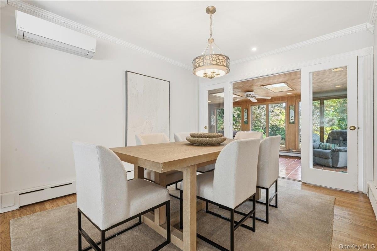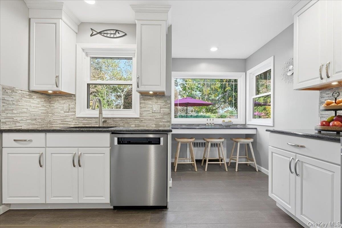 This beautifully maintained and well-appointed home is ready for its new owners! Nestled in the desirable Blue Harbor Estates within Babylon Village, this expanded Cape offers 3 spacious bedrooms, 2 full baths, and sits on a generously sized property. Step inside to discover a beautifully renovated kitchen featuring granite countertops, stainless steel appliances, and a breakfast bar overlooking the private, beautifully landscaped backyard. The formal dining room is perfect for gatherings, while the spacious living room with a wood-burning fireplace creates a warm and inviting atmosphere. Original hardwood floors, freshly refinished, add timeless charm throughout, complemented by fresh interior paint. The primary suite upstairs includes a private full bath, a walk-in closet, and a lofted office space-ideal for those who work from home. Two additional spacious bedrooms are located on the main floor, conveniently situated near the main hall bath. Enjoy year-round comfort with gas heating, a new furnace, and four mini-split air conditioning units for personalized climate control across three heating zones. Relax or entertain in the screened-in porch or on the bi-level patio, surrounded by a beautifully maintained fenced in yard with in-ground sprinklers. A circular driveway enhances curb appeal, while a 1-car attached garage adds convenience and additional storage. The unfinished basement offers great potential for future customization, and attic access provides extra space for organization and storage. Located in the heart of Babylon Village, you'll love being close to local shops, restaurants, parks, and the LIRR-offering the perfect blend of village living and modern convenience. Residents also enjoy Babylon Village amenities, including access to the Village Pool, Golf Course, Boat Slip, and Town of Babylon Beaches. Babylon Village Schools!