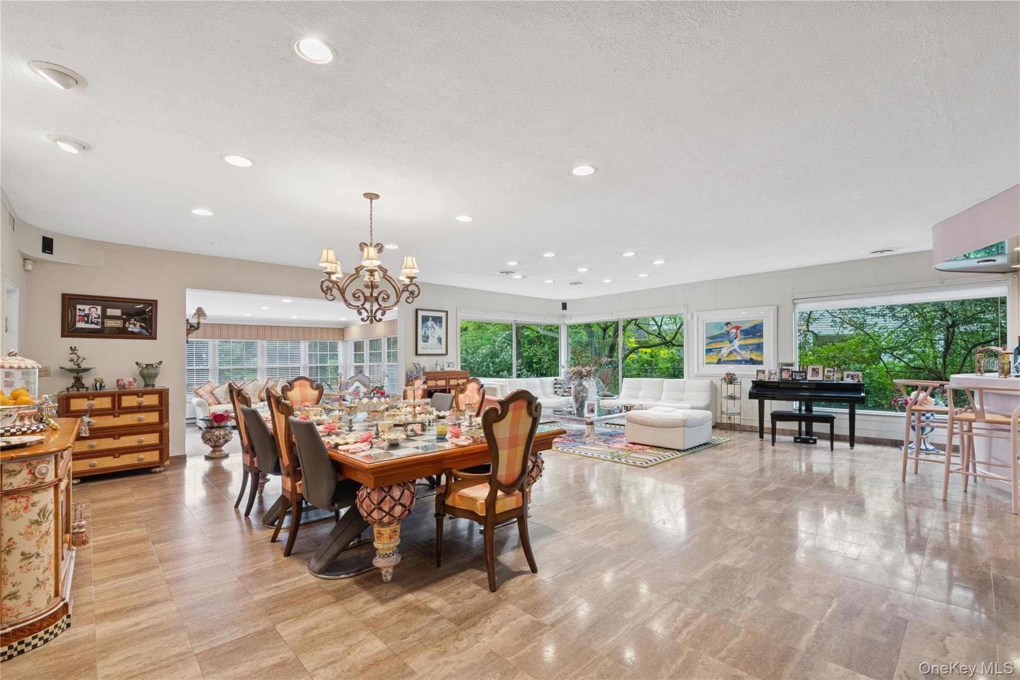Light-filled Hewlett Harbor entertainer's dream on a private, nearly half-acre corner lot. Step into a marbled foyer leading to an open living/dining area with a wall of glass and a 15x16 den framed by 11 windows. The eat-in kitchen features granite countertops, stainless steel appliances, and large picture windows overlooking the lush backyard. A double-sided fireplace and wet bar create a warm, inviting atmosphere. The first-floor primary suite boasts vaulted ceilings, two walk-in closets, and a spa-like bath with jetted tub and bidet. A second bedroom/office and full bath complete the main level. Upstairs offers two more large bedrooms, a full bath, and access to an unfinished attic ready for expansion if desired. Two-car attached garage with direct kitchen access and a separate laundry room. Enjoy outdoor living on a secluded 1,200 sq ft deck.