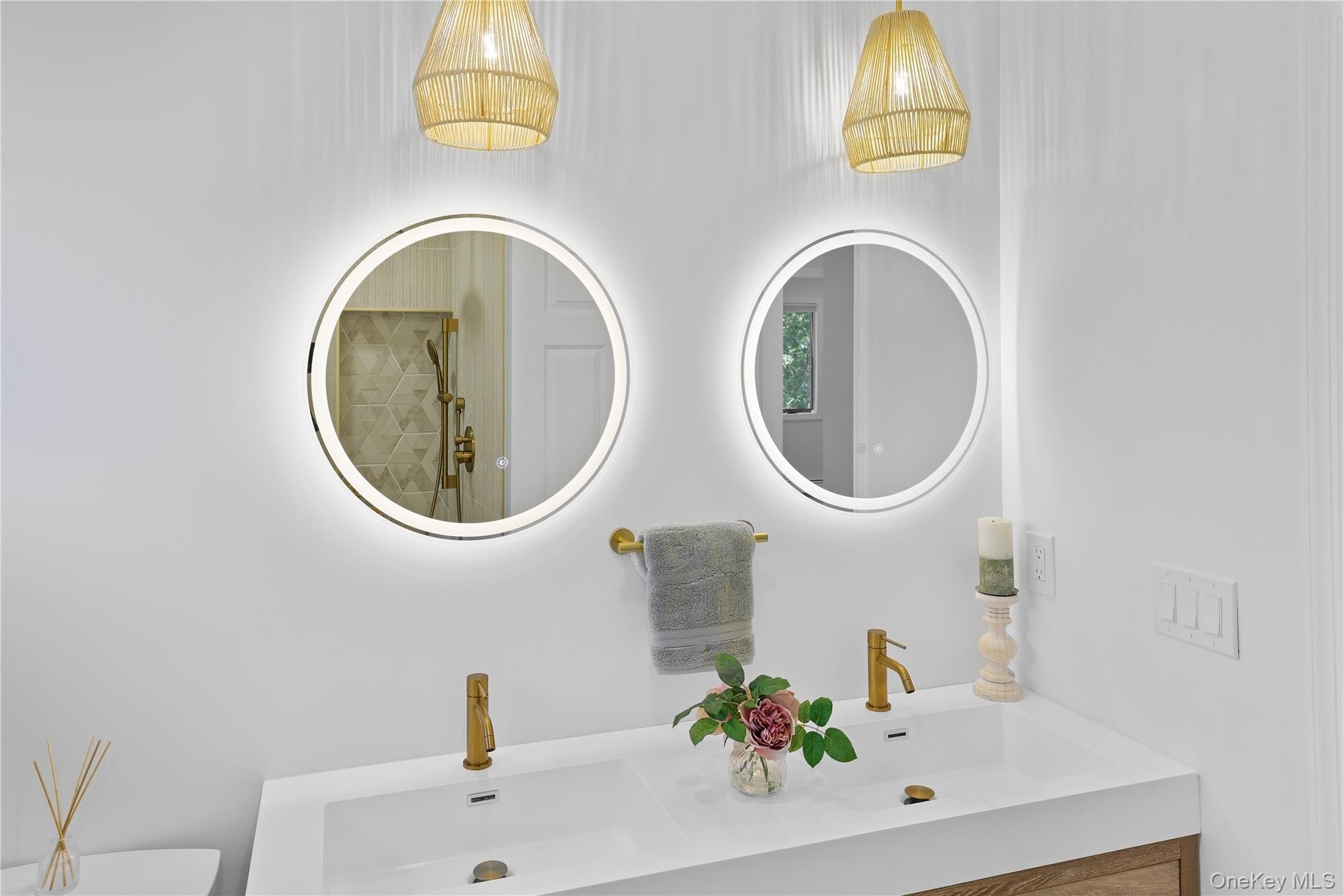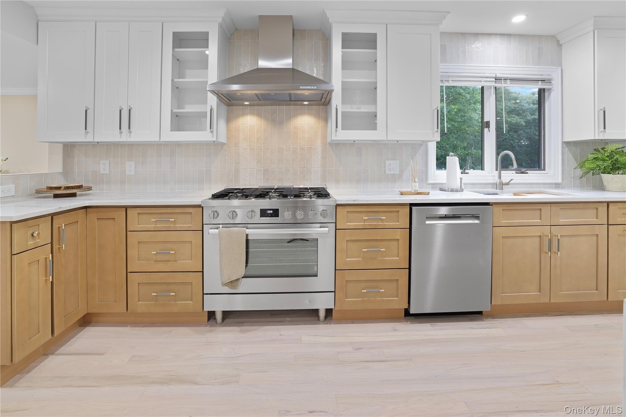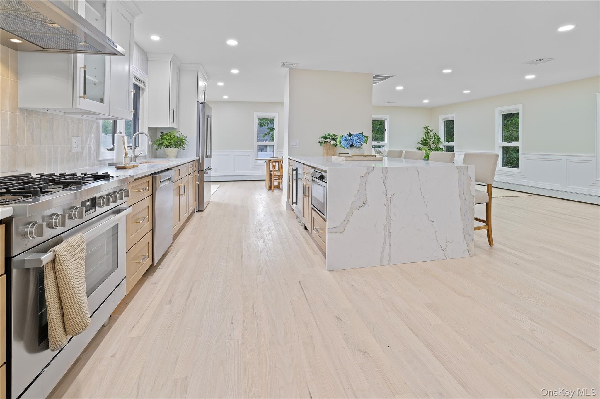 Stunning Fully Renovated Home in the Heart of Hampton Bays: where modern luxury meets everyday comfort. This beautifully renovated 4-bedroom, 3-bath home is thoughtfully designed for both relaxed living and stylish entertaining. At the heart of the home is a gourmet chef's kitchen, featuring top-of-the-line Bosch gas range, hood, quartz countertops, and an oversized 8' x 5' waterfall island with double-sided cabinetry-perfect for prep, dining, and conversation. Additional premium appliances include a French door refrigerator with freezer drawer, microwave drawer, dishwasher, and an XO wine cabinet for your favorite beverages. The open-concept layout flows effortlessly from the kitchen into the spacious dining and living areas, creating the perfect setting for gatherings. Step down into the cozy den with an electric fireplace, custom built-in shelving, and cabinets that add warmth and elegance. A full bath on the main level adds convenience for guests. Upstairs, you'll find four generously sized bedrooms. The primary suite is a private retreat with a spa-like ensuite bath featuring a soaking tub, double vanity, and a walk-in closet. A second full bath with double vanity serves the additional bedrooms. Additional Highlights: LOW TAXES ! Central air. Dedicated laundry/mudroom with sink, cabinetry, and direct access to the 2-car garage. Beautiful hardwood and luxury vinyl flooring throughout. Fully finished basement with a stylish wet bar; ideal for entertaining or bonus living space. Expansive backyard with multilevel deck and partial white vinyl fencing; perfect for outdoor entertaining and play. New roof! Energy-efficient stainless steel appliances. Low-maintenance, move-in-ready living. Located just minutes from the beach, marinas, shops, and dining, this turnkey home offers the perfect blend of coastal charm and modern design. Don't miss your opportunity to own this exceptional property in Hampton Bays!
