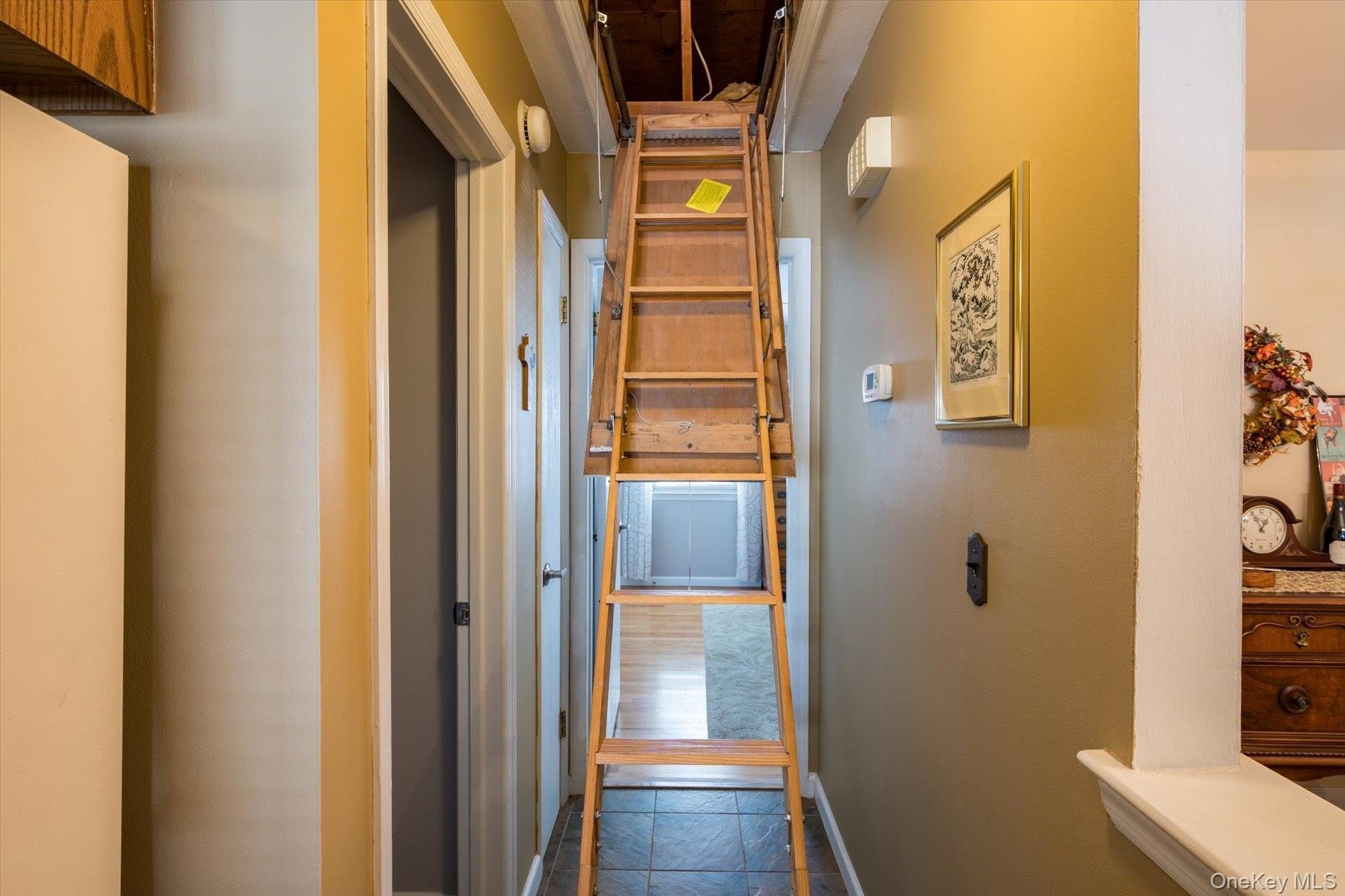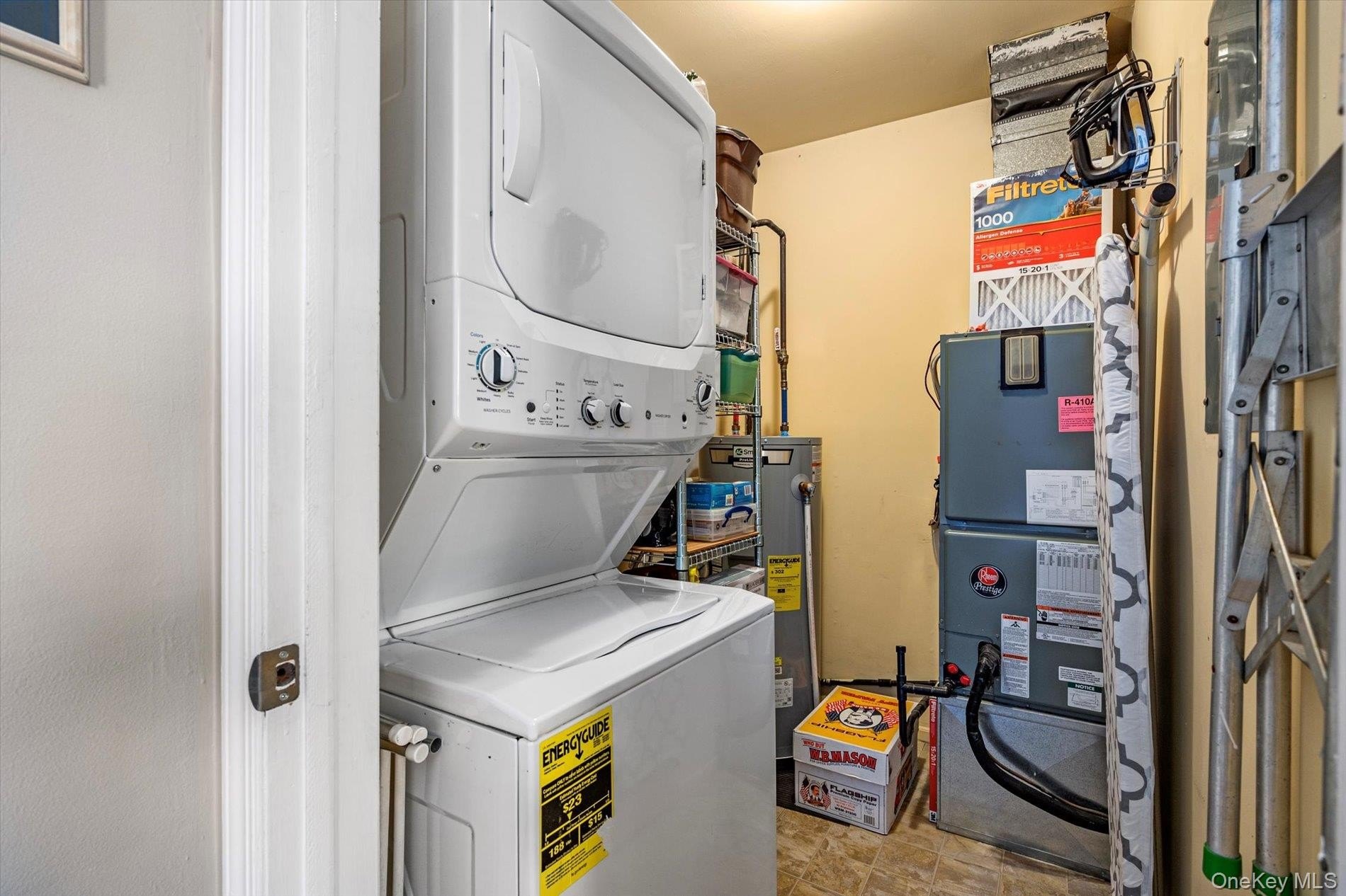 Enter this spacious 1 Bedroom, 1 Bath, Second floor unit filled with sunshine, which extends via pass thru to a well-appointed kitchen with a stainless steel electric range/oven and ample space for a table and chairs. There is also a more formal Dining Area with access via pass thru to the kitchen as well. Hardwood and Porcelain tile floors. The Bedroom is spacious and has a large Walk-in closet and a door to the Utility Area with a stackable Washer and Dryer. A very convenient location. There is a pull-down attic stair providing extra storage space. Located close to shopping, dining and major transportation - a 2 (two) yes 2 minute walk to the Farmingdale LIRR Station, 3 blocks from "trendy" Farmingdale Village and a short distance to the famed Bethpage Black Golf Course. This will not last long!