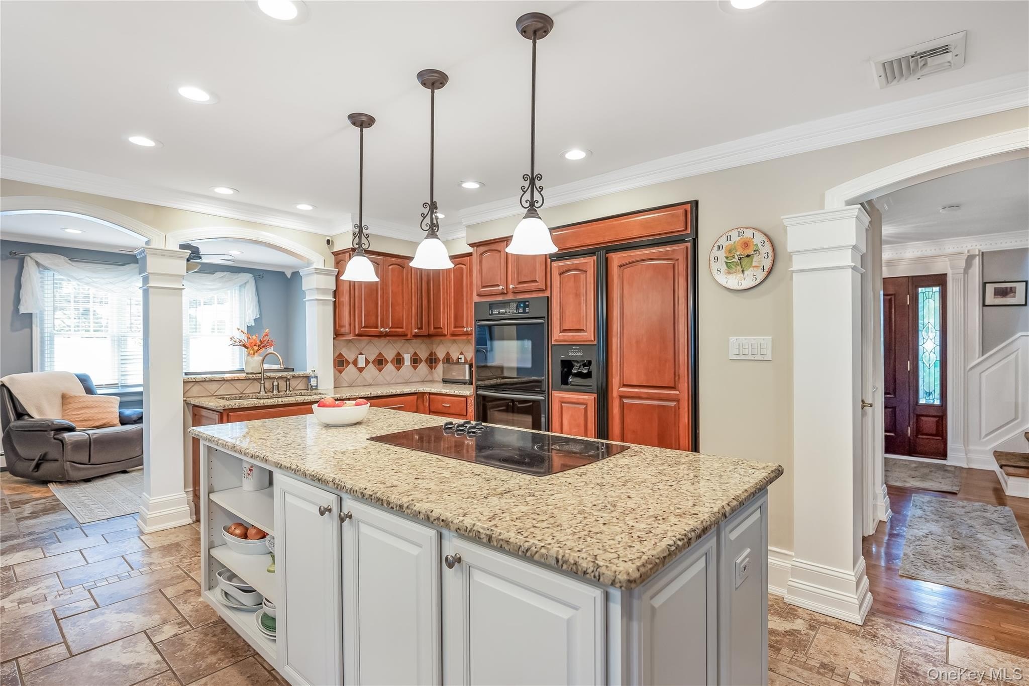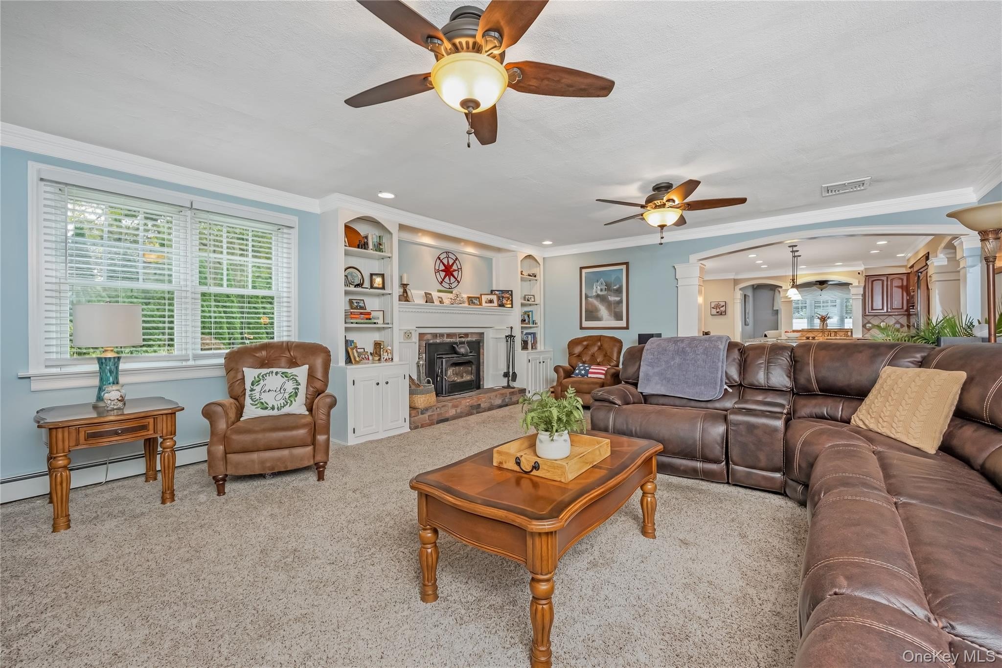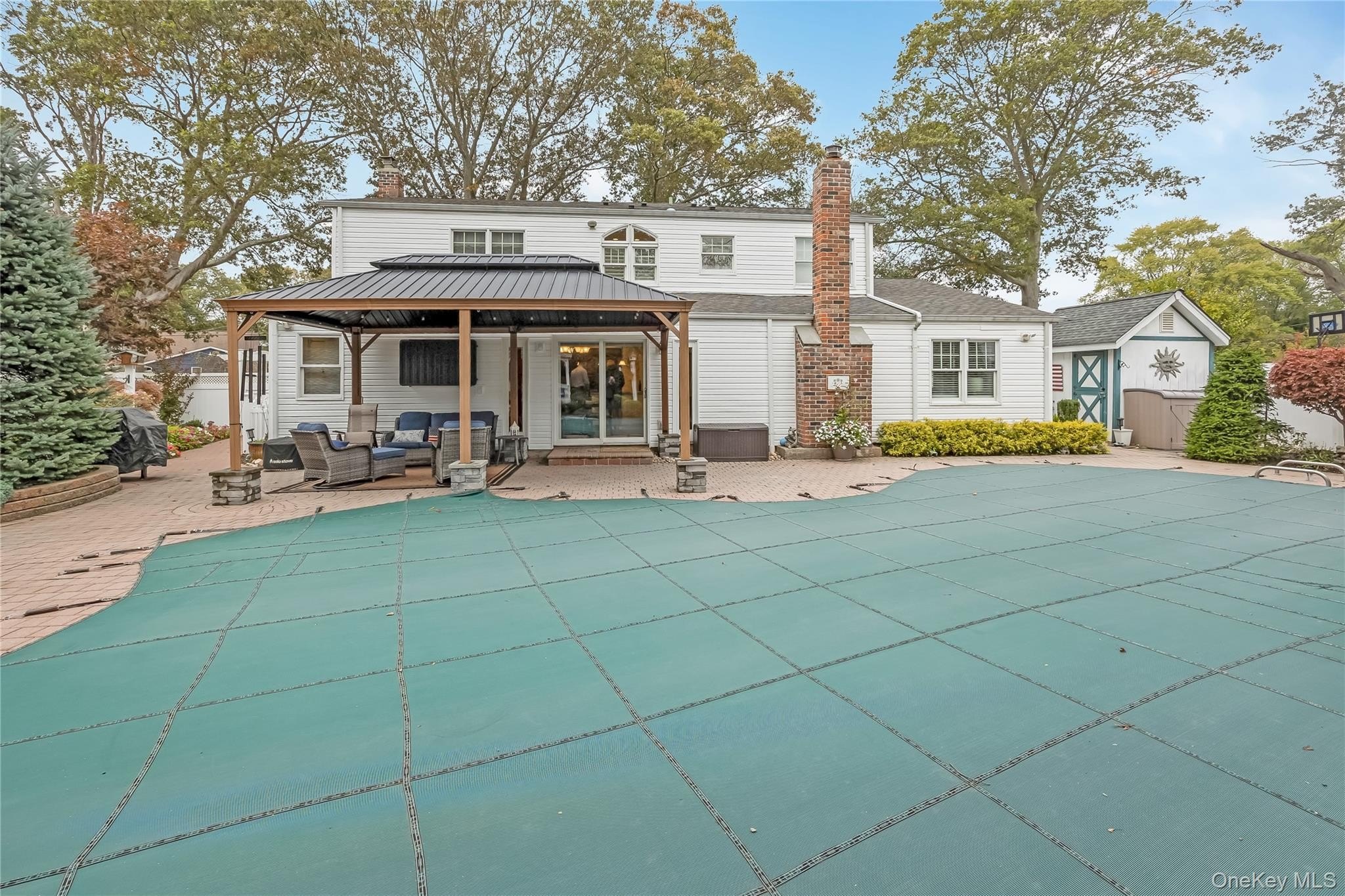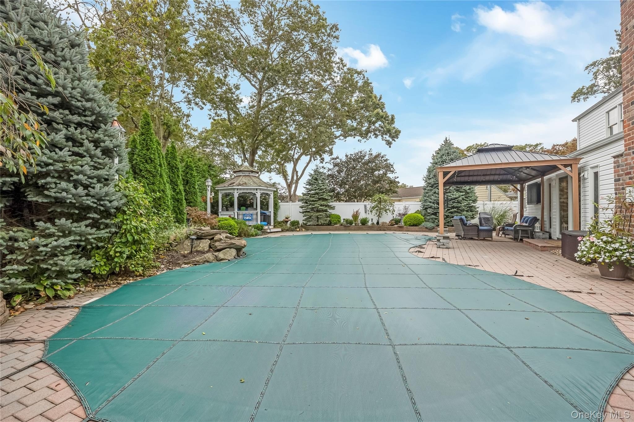 Welcome to this spacious 8 room, 4 bedroom, 2.5 bath colonial offering comfort, style, and plenty of room to entertain. A welcoming entry foyer leads to a large eat-in kitchen featuring granite countertops, a center island, and a walk-in pantry. The home features a formal dining room, living room, and a huge family room with a wood-burning fireplace and built-in bookshelves-perfect for gatherings. Quality craftsmanship is evident with hardwood floors, custom moldings, solid wood raised panels, Andersen windows, LED hi-hats, and fresh paint throughout. The primary suite provides a relaxing retreat with an ensuite bath and two closets. Modern updates include a new Peerless cast iron boiler and water heater (2022), central air conditioning, 200-amp electric service, and an in-ground sprinkler system. Outdoor living is exceptional, featuring an open bluestone front porch, Cambridge paver rear patio, heated saltwater inground pool with a 4-ton waterfall, pavilion, gazebo, and beautifully landscaped, vinyl-fenced grounds-all set on a charming, sidewalk-lined street. Located within the highly regarded National Blue Ribbon Award-Winning Sayville School District, this home truly offers an ideal setting inside and out.
