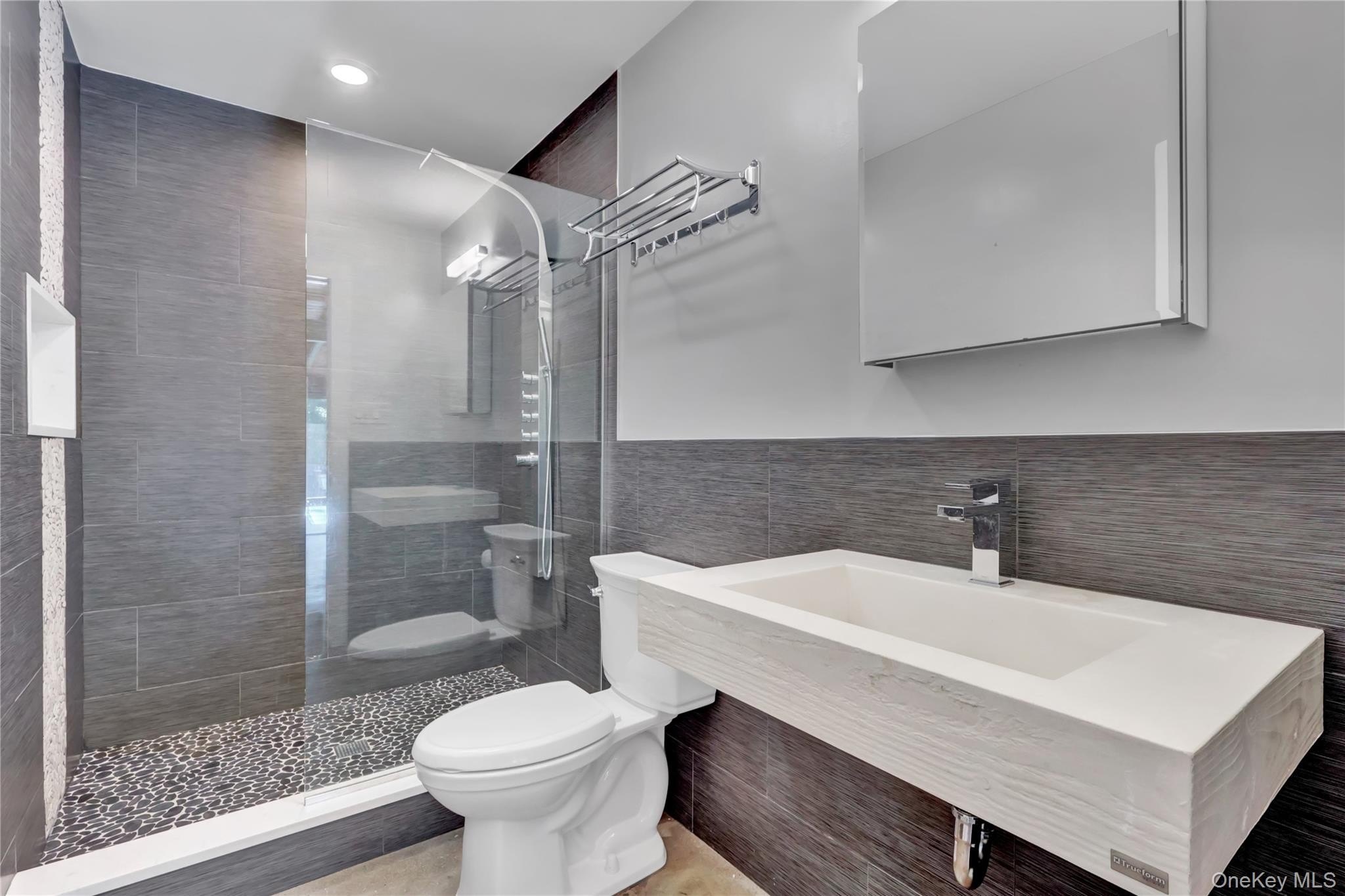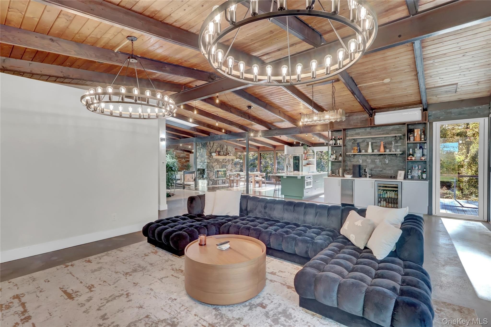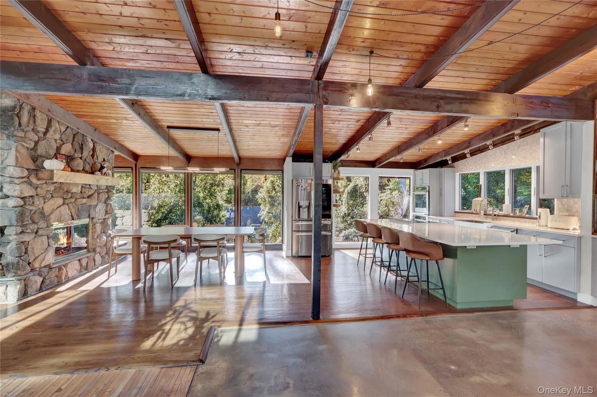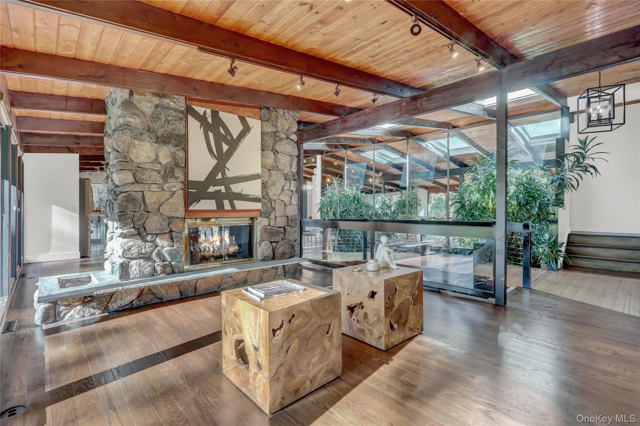 Perched atop a scenic hill in one of Smithtown's most prestigious enclaves, this architecturally distinctive ranch-style home offers an unmatched combination of total privacy, eco-conscious design, and serene natural beauty. Located within the award-winning Smithtown School District and surrounded by lush woodlands near the Nissequogue River, this exceptional home is a true retreat for those who value tranquility, style, and effortless indoor-outdoor living. From the moment you arrive, the home's striking exterior, expansive setting, and custom design features signal that this is no ordinary residence. Inside, the open-concept layout is both inviting and impressive, with a peaceful, zen vibe and a bridge over a one-of-a-kind custom koi pond. Soaring vaulted ceilings and radiant heated floors run through the main living areas. Walls of oversized sliding glass doors flood the interior with natural light and seamlessly connect the indoors to a sprawling Trex deck-perfect for entertaining on any scale. Cleverly hidden solar panels provide electricity at almost no monthly cost. At the heart of the home lies a beautifully appointed, modern kitchen featuring quartz countertops, an oversized center island, and sleek custom cabinetry. The space flows effortlessly into the expansive great room, creating a bright and airy living experience that feels both refined and relaxed. A two-sided fireplace enhances both the living and dining rooms. Step outside and discover a true entertainer's dream: a brand-new resort-style pool with a shallow sun bed lounge area, custom stone fire pit, and a vast deck ideal for hosting gatherings or simply enjoying peaceful mornings. A thoughtfully designed lower level includes a private guest suite with its own full bath and separate above-grade entrance-ideal for extended stays or multi-generational living. A fully equipped gym completes the lower level, with a ton of closets for storage. Propane generator. Unique in every sense, this residence is a rare find-a perfectly curated blend of modern comfort and natural serenity.