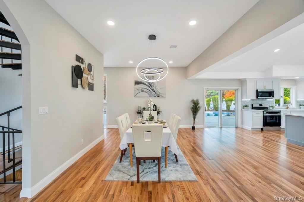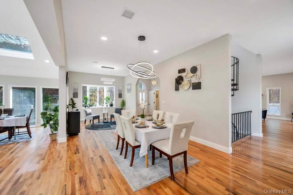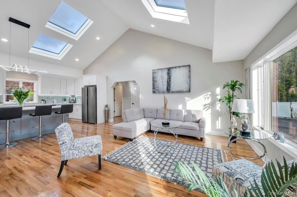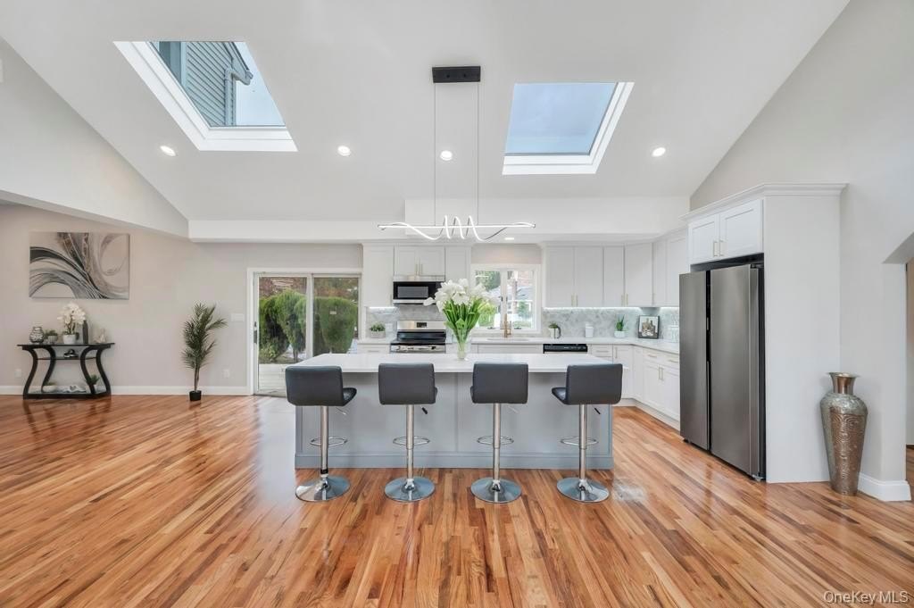 Welcome to 100 Old Northport Road in Kings Park. This 5-bedroom, 3.5-bath colonial in the Smithtown School District offers exceptional space, natural light, and an entertainer-friendly layout. The entire first floor features brand-new wood floors and high ceilings, creating an open and inviting flow across multiple sitting areas. The huge kitchen is the centerpiece, highlighted by impressively high vaulted ceilings, large skylights, modern finishes, and an oversized island. Two sliding doors from the main level lead out to a massive deck overlooking the in-ground pool. Upstairs, you'll find well-appointed bedrooms along with a renovated primary suite featuring a large walk-in shower. A fully finished basement adds valuable additional space for a variety of uses. Outside, enjoy the expansive deck, mature landscaping, an in-ground pool, and a U-shaped driveway providing easy access and ample parking. The home has been updated throughout, including a new roof, offering a complete indoor-outdoor setup ready for its next owner.