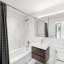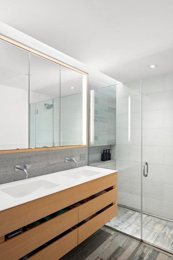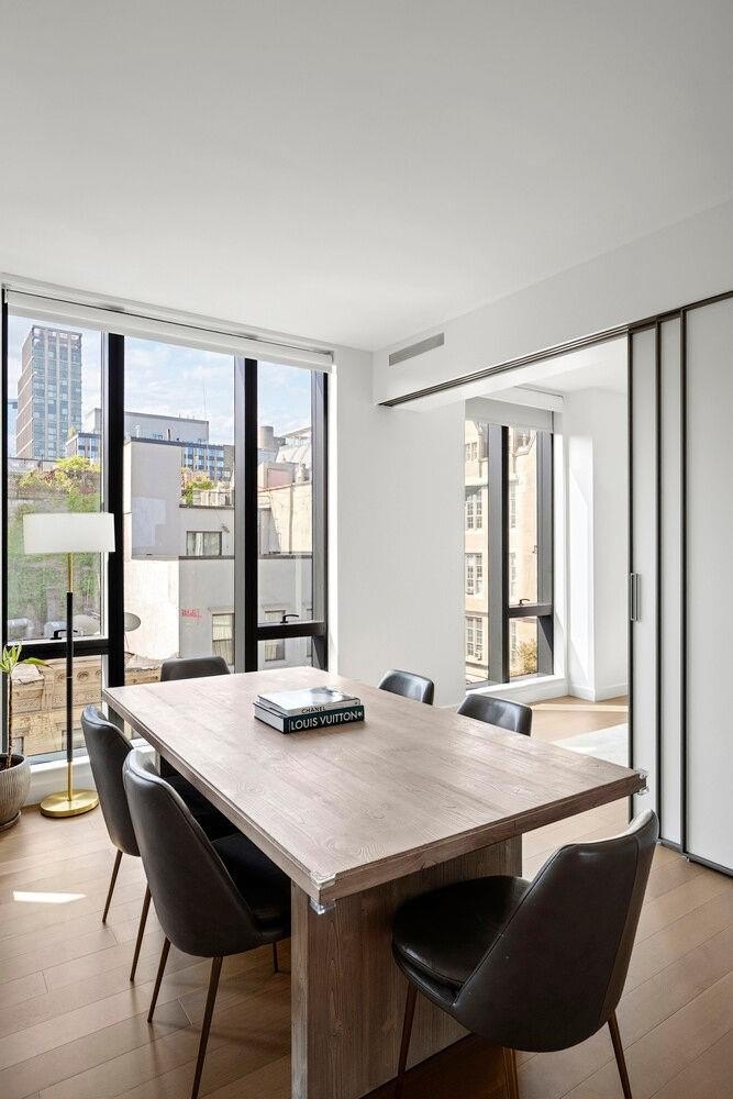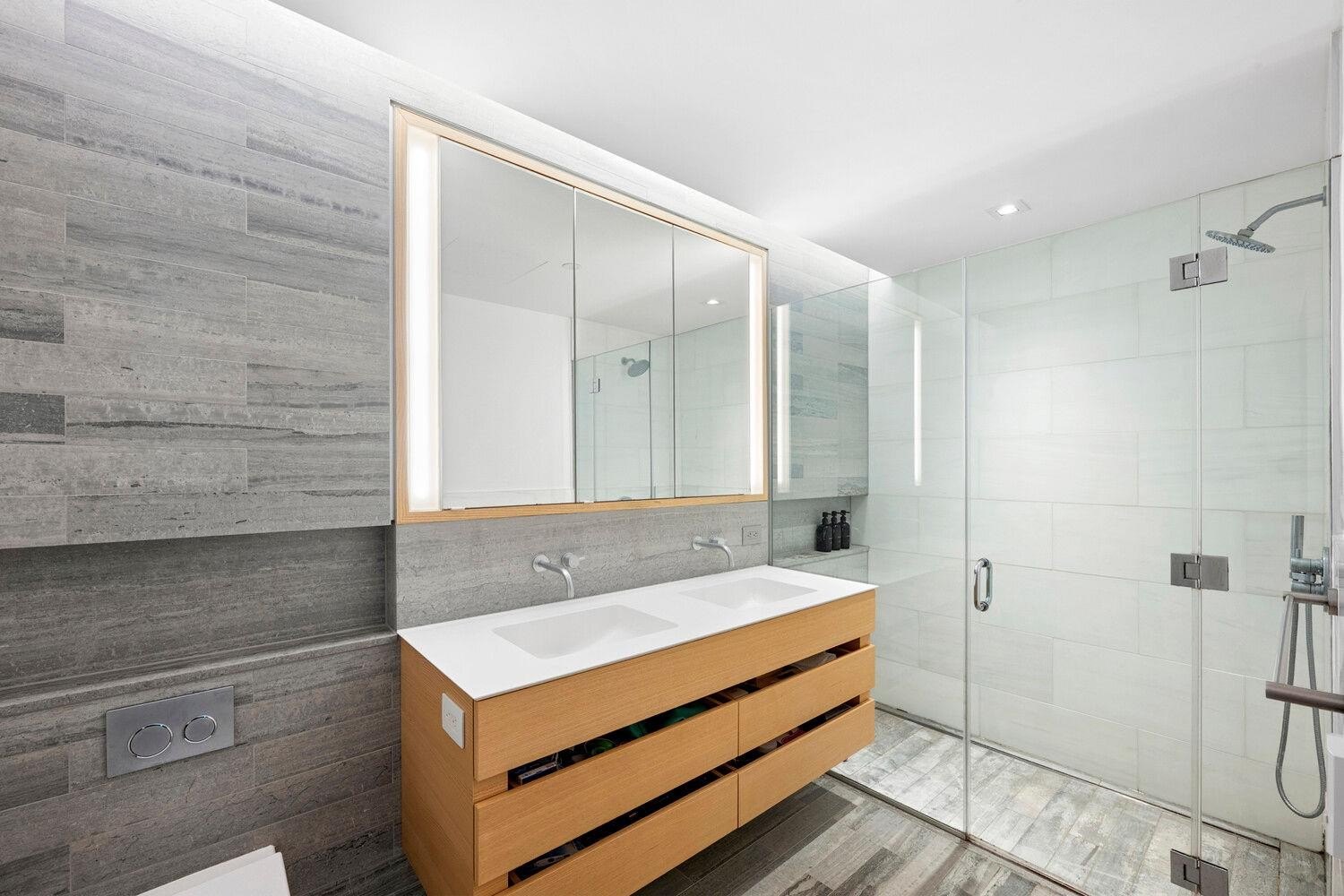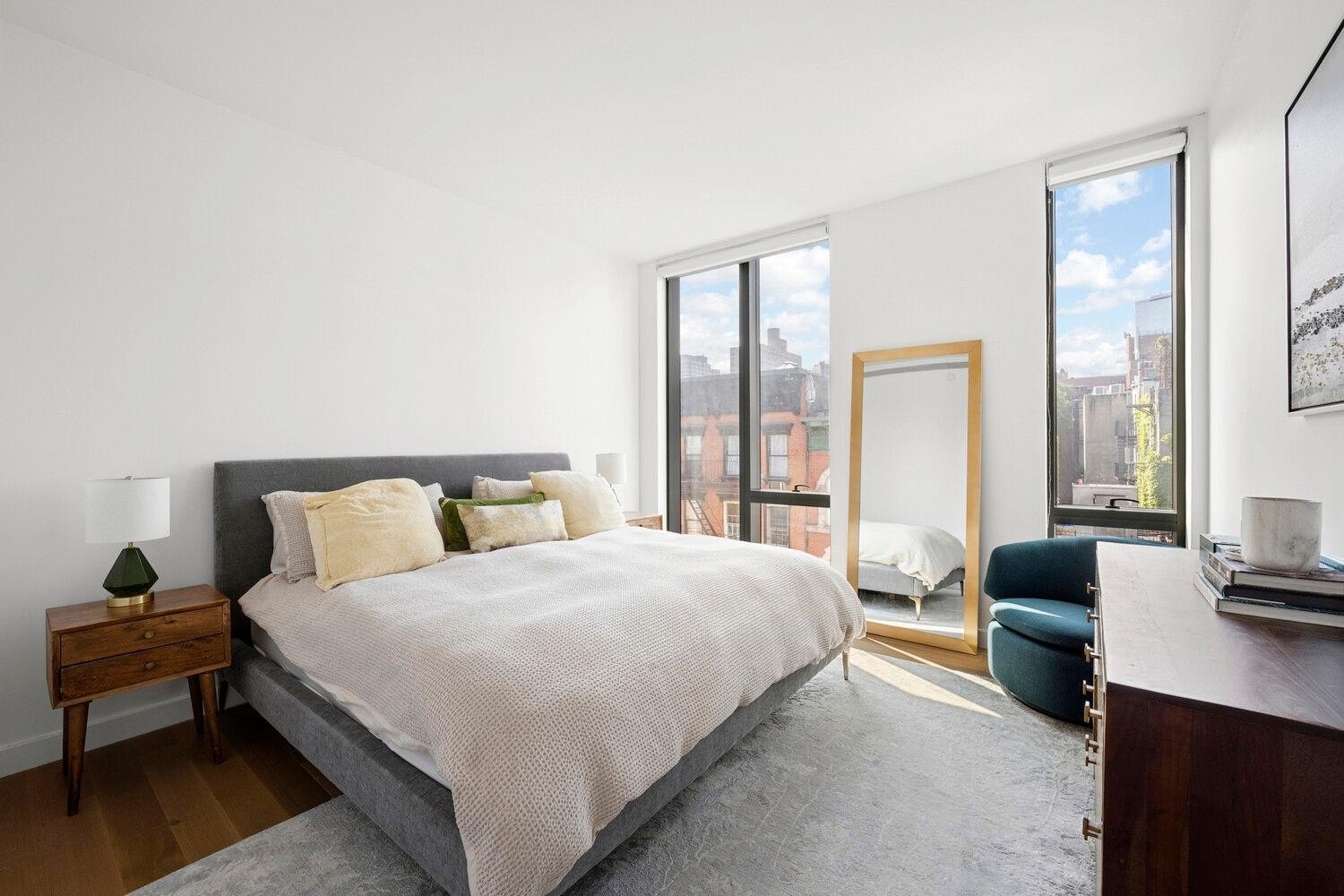 Stunning Contemporary Lower East Side Living at the Acclaimed 150 Rivington Luxurious, modern, and incredibly spacious, this sun-bathed 2-bedroom, 2.5-bathroom condo offers elevated Downtown living in one of the most sought-after residential buildings in the heart of the Lower East Side. Designed by the esteemed GLUCK+, this stylish residence is moments from exciting restaurants, popular bars, trendy cafes, and boutique shopping. It spans over 1,100 square feet with a wall of south-facing floor-to-ceiling windows and classic city views. Additional features include custom lighting, central heating and cooling, pre-wiring for a Crestron Smart Home system, and an in-unit Bosch washer and dryer. Residents are greeted by a lovely foyer with a powder room and coat closet. Beyond is a sprawling open-concept living room, dining room, and kitchen with wire-brushed oak floors and soaring ceilings approximately 10 feet high. A sleek waterfall-edge eat-in peninsula connects the living and dining areas to the beautiful chef's kitchen for seamless entertaining and day-to-day living. Custom Italian cabinetry complements Caesarstone countertops, and high-end appliances are fully integrated into the design. Both bedrooms enjoy privacy and comfort thanks to a thoughtful split-wing layout. The king-size primary suite boasts a custom walk-in closet and a pristine spa-like en-suite with a custom floating ash wood double vanity, wall-mounted Watermark faucets, Pelle Grigio marble tiles, radiant heated floors, and a walk-in rainfall shower. The large second bedroom enjoys an oversized reach-in closet and a full en-suite bathroom with a custom floating vanity, marble tiles, and a deep soaking tub. Additionally, Italian-made sliding Rimadesio doors provide flexibility should residents desire to extend the living area. 150 Rivington is a transformative, full-service boutique condominium with well-appointed amenities and a prime Lower East Side address. The building includes 24-hour door attendants, concierge service, a state-of-the-art fitness center, a bicycle room, private storage, and an inviting rooftop deck with lush planters, dining and lounge furniture, an outdoor kitchen, a fireplace, and panoramic city views. Residents are close to Sara D. Roosevelt Park, the East Village, the Bowery, Nolita, Chinatown, and trendy dining and nightlife scenes. Accessible subway lines include the 6, F, M, J, and Z.