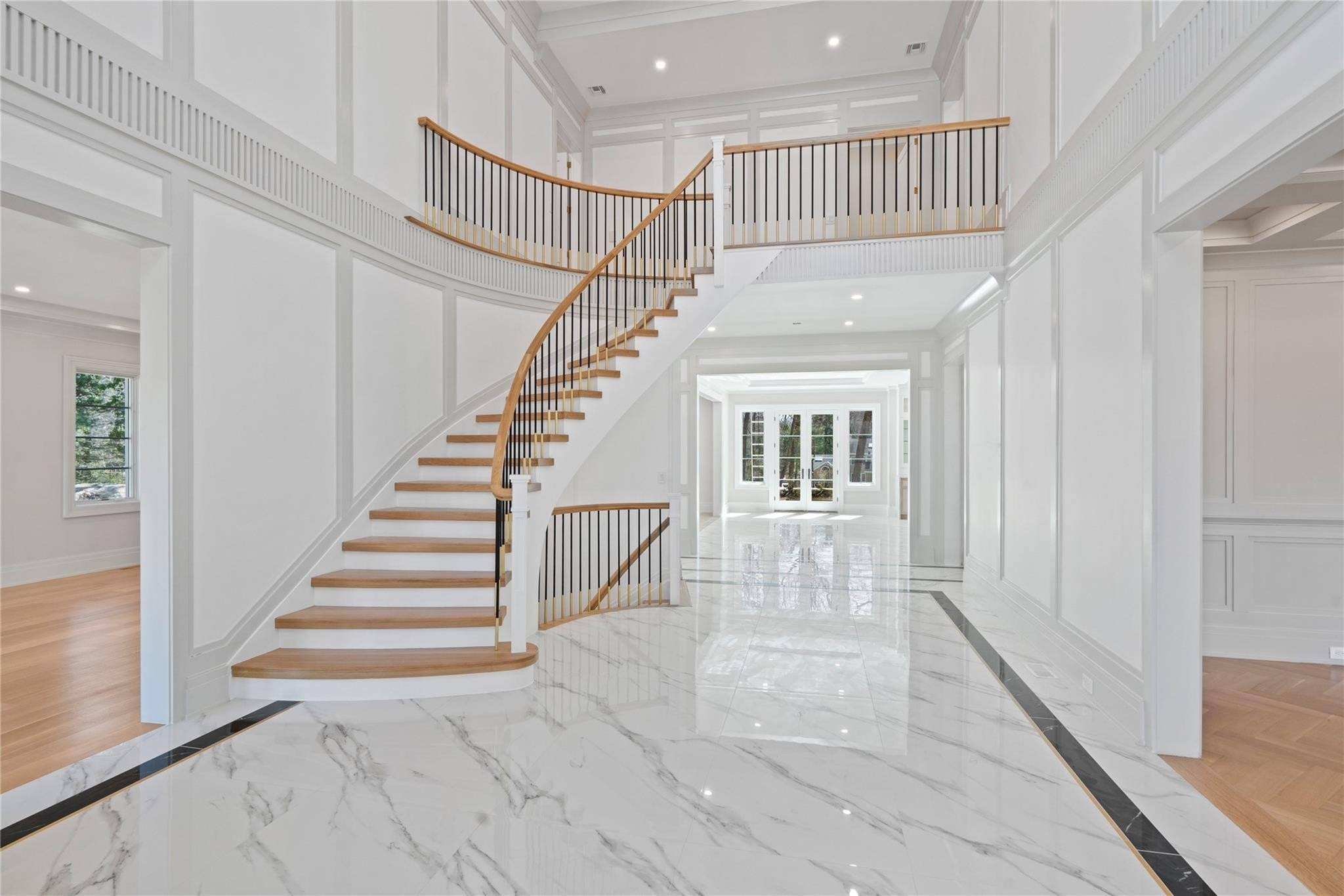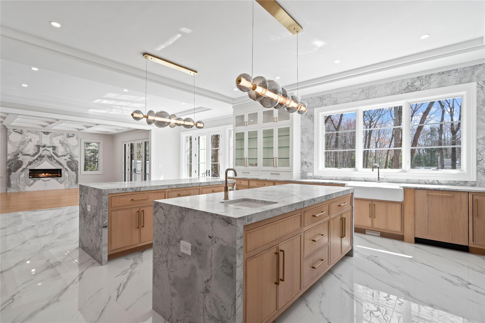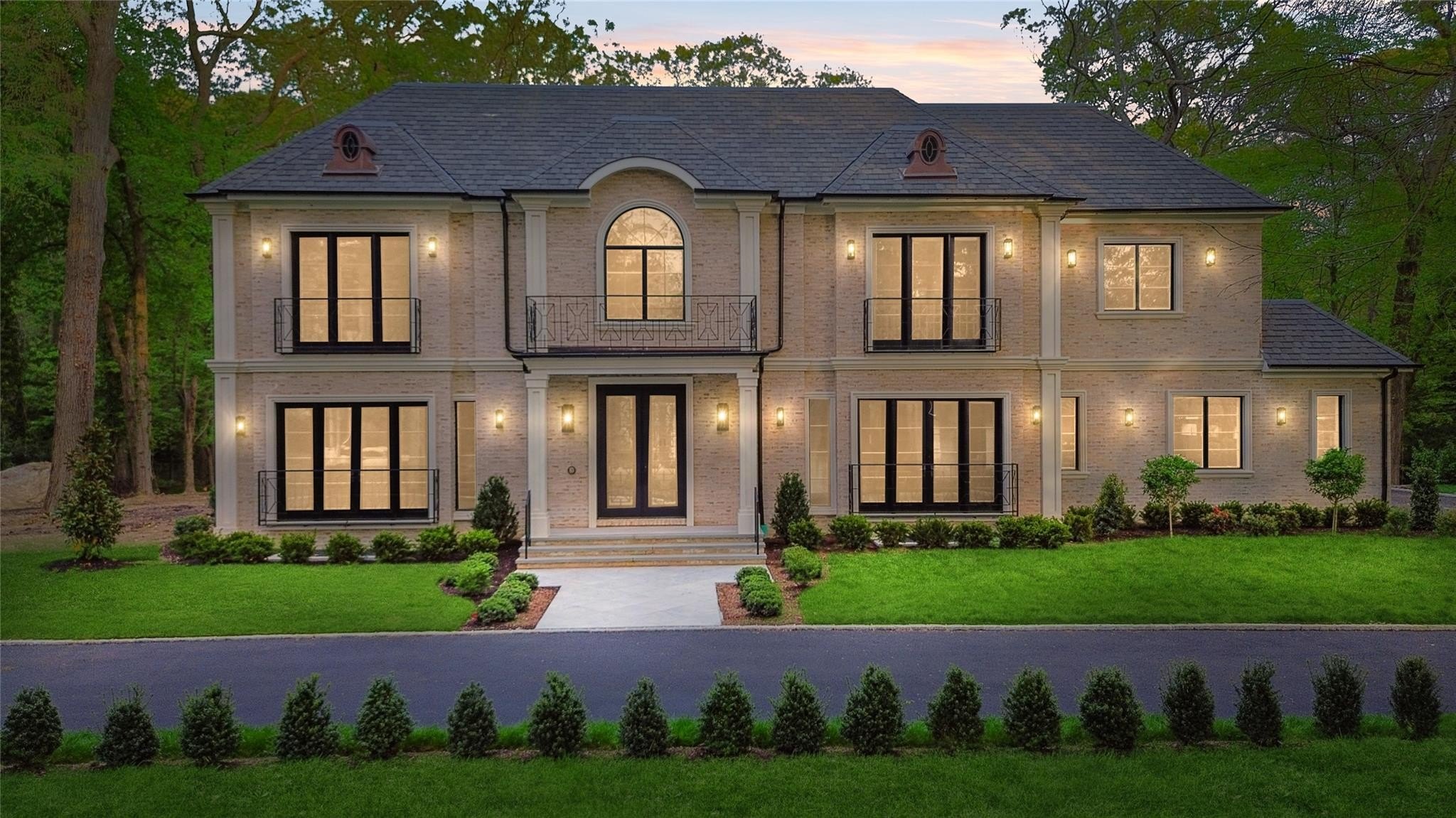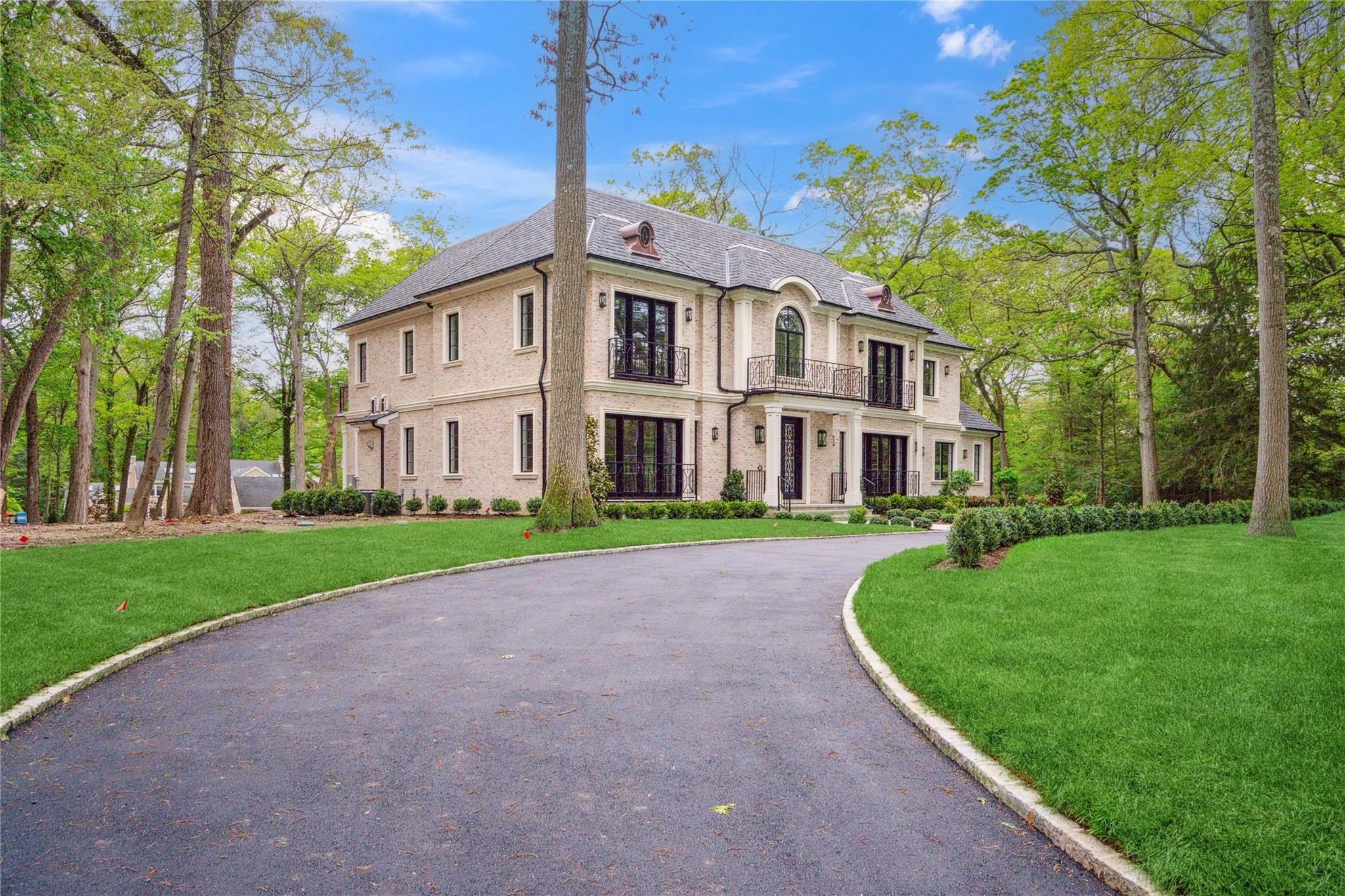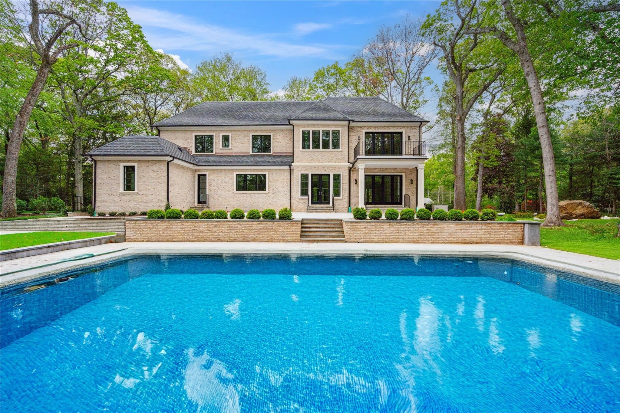 Muttontown Brand New Brick Center Hall Colonial | Set on over two private acres on a quiet cul-de-sac, 20 Knollwood Road is an exceptional new construction estate that blends timeless architecture with elevated, modern finishes. With six en-suite bedrooms, soaring 10-foot ceilings on every level, and thoughtfully designed indoor and outdoor spaces, this home is perfectly suited for refined living and grand entertaining. The main level showcases radiant porcelain tile, coffered ceilings, and custom millwork throughout. The kitchen is a true showpiece, featuring two oversized islands with seating and storage, marble countertops, paneled Sub-Zero appliances, a Wolf range and ovens, farmhouse sink, pot filler and more. A formal dining room with wet bar and herringbone floors complements the space, while a powder room finished in striking black marble adds a dramatic touch. The expansive living and entertaining areas flow seamlessly to the outdoors through French doors, opening to a porcelain-tiled patio and a heated Gunite saltwater pool with automatic cover, integrated spa, and lush surroundings. The home includes a full house generator powered by two 1,000-gallon propane tanks, three-zone HVAC, a space for a future elevator, and smart home wiring for speakers, alarm, and surveillance. Upstairs, the primary suite offers a private balcony, dual walk-in closets, and a spa-quality bath with double vanities and Toto fixtures. A junior suite with a Juliet balcony offers additional luxury, while a second-floor laundry room and central vacuum with hidden hose system provide modern convenience. All bedrooms feature en-suite baths, with elegant grey, white, and black marble finishes carried throughout. Additional highlights include a three-car garage with room for car lifts, a mudroom entry, baseboard outlets, flush floor vents, and a 300-pound chandelier motor lift. The home is clad in limestone stucco and brick, with black iron doors and Pella windows offering a sleek, modern exterior. The unfinished lower level leaves over 3,000 sq.ft. to the imagination - with full bathroom and second laundry room to cater to the pool. A rare offering in Muttontown-luxury, privacy, and craftsmanship converge at 20 Knollwood Road.