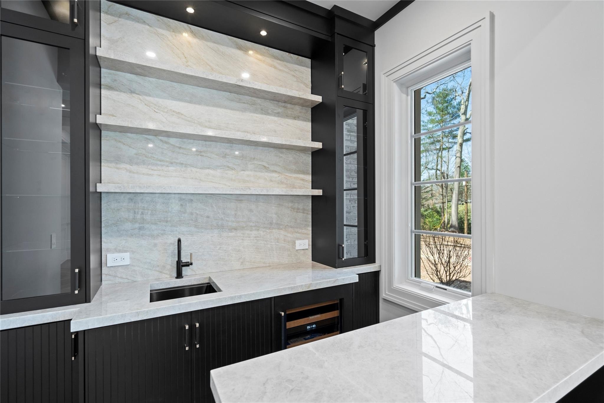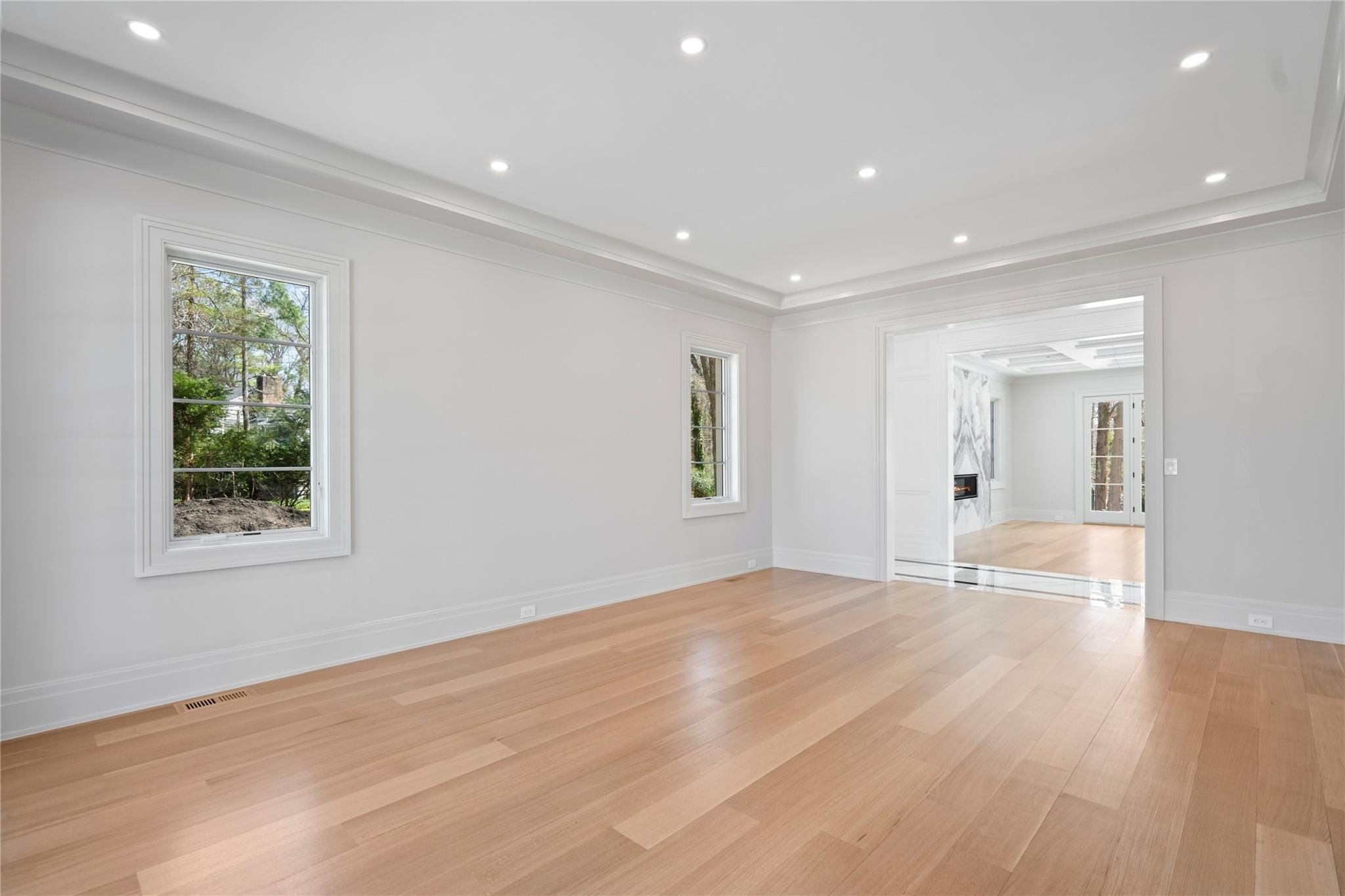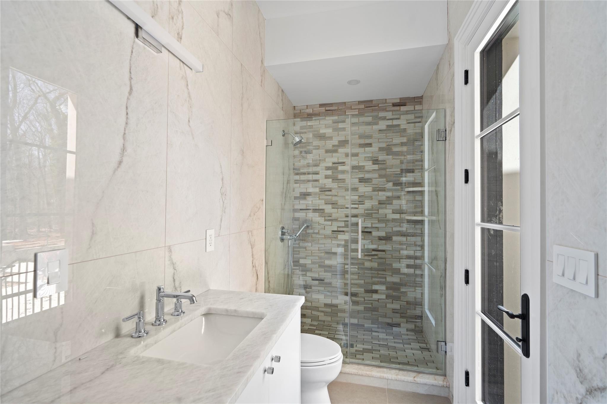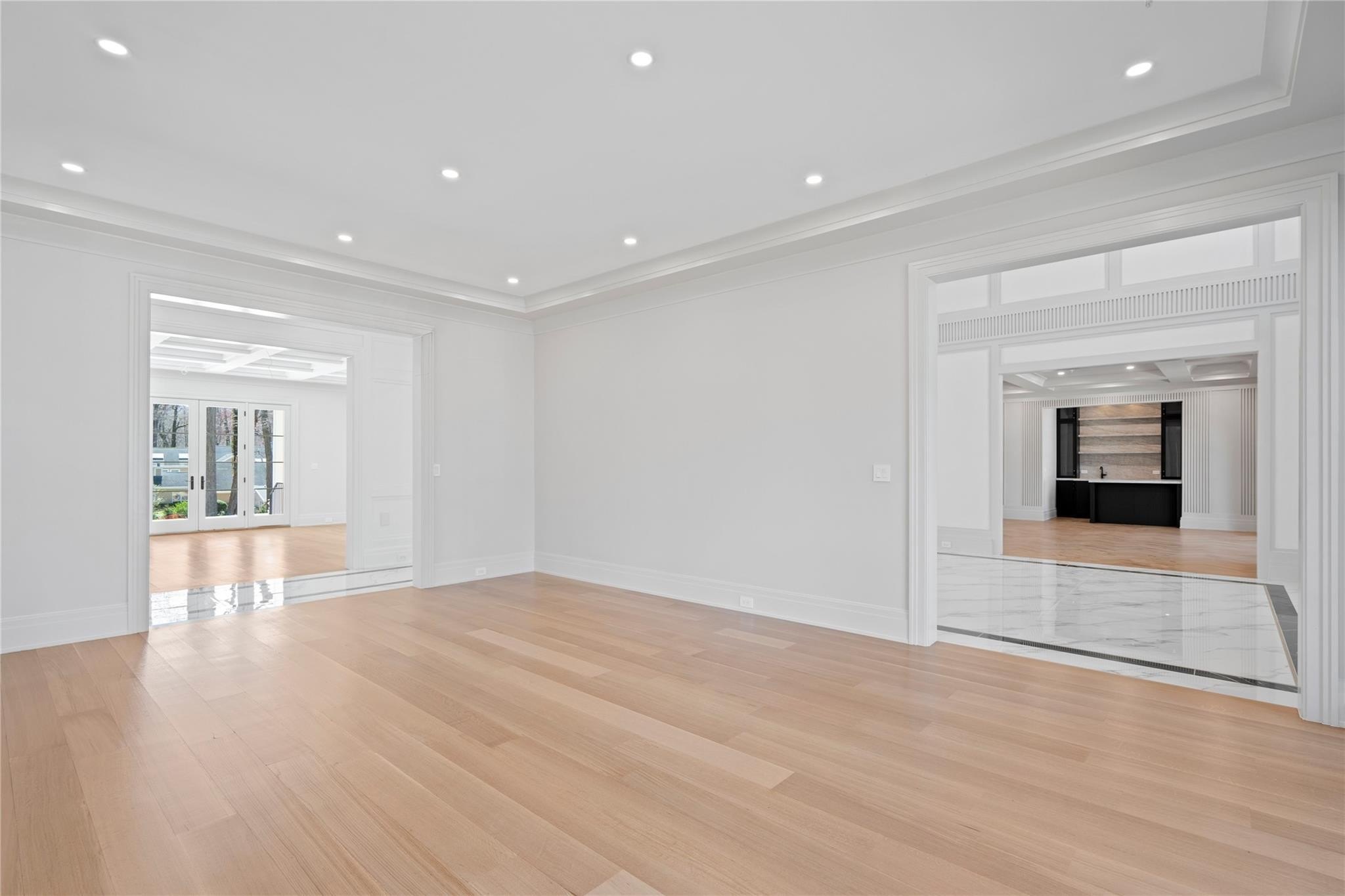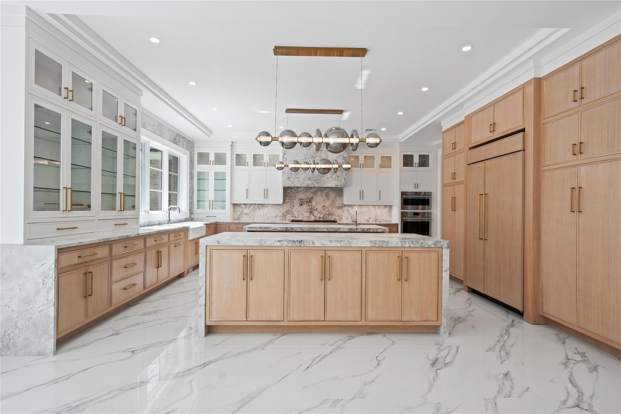 Muttontown Brand New Brick Center Hall Colonial | Set on over two private acres on a quiet cul-de-sac, 20 Knollwood Road is an exceptional new construction estate that blends timeless architecture with elevated, modern finishes. With six en-suite bedrooms, soaring 10-foot ceilings on every level, and thoughtfully designed indoor and outdoor spaces, this home is perfectly suited for refined living and grand entertaining. The main level showcases radiant porcelain tile, coffered ceilings, and custom millwork throughout. The kitchen is a true showpiece, featuring two oversized islands with seating and storage, marble countertops, paneled Sub-Zero appliances, a Wolf range and ovens, farmhouse sink, pot filler and more. A formal dining room with wet bar and herringbone floors complements the space, while a powder room finished in striking black marble adds a dramatic touch. The expansive living and entertaining areas flow seamlessly to the outdoors through French doors, opening to a porcelain-tiled patio and a heated Gunite saltwater pool with automatic cover, integrated spa, and lush surroundings. The home includes a full house generator powered by two 1,000-gallon propane tanks, three-zone HVAC, a space for a future elevator, and smart home wiring for speakers, alarm, and surveillance. Upstairs, the primary suite offers a private balcony, dual walk-in closets, and a spa-quality bath with double vanities and Toto fixtures. A junior suite with a Juliet balcony offers additional luxury, while a second-floor laundry room and central vacuum with hidden hose system provide modern convenience. All bedrooms feature en-suite baths, with elegant grey, white, and black marble finishes carried throughout. Additional highlights include a three-car garage with room for car lifts, a mudroom entry, baseboard outlets, flush floor vents, and a 300-pound chandelier motor lift. The home is clad in limestone stucco and brick, with black iron doors and Pella windows offering a sleek, modern exterior. The unfinished lower level leaves over 3,000 sq.ft. to the imagination - with full bathroom and second laundry room to cater to the pool. A rare offering in Muttontown-luxury, privacy, and craftsmanship converge at 20 Knollwood Road.