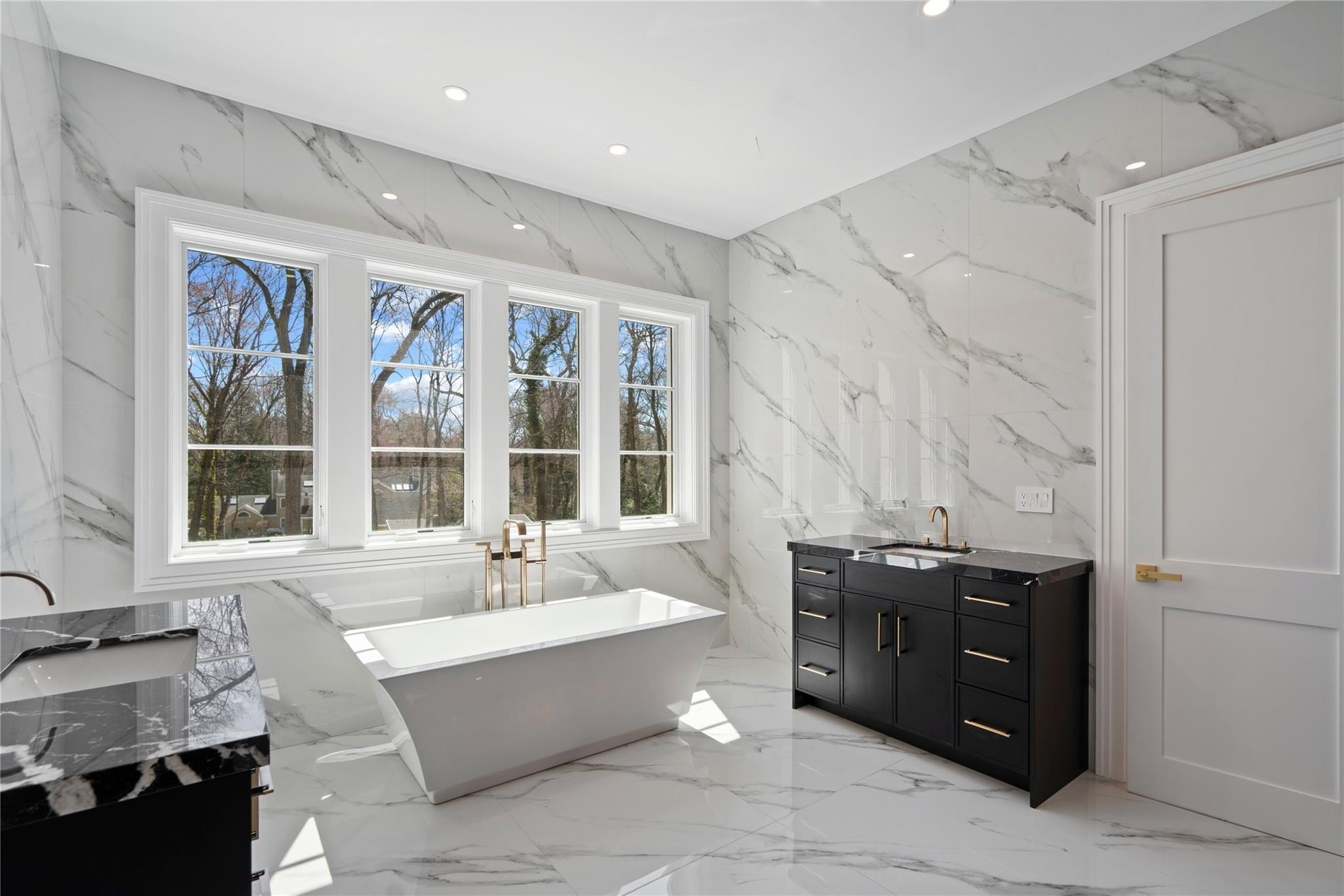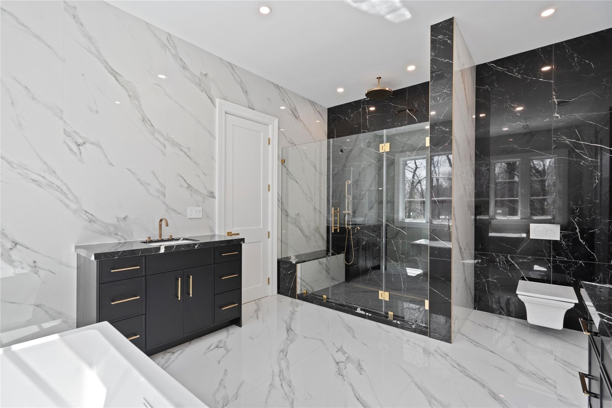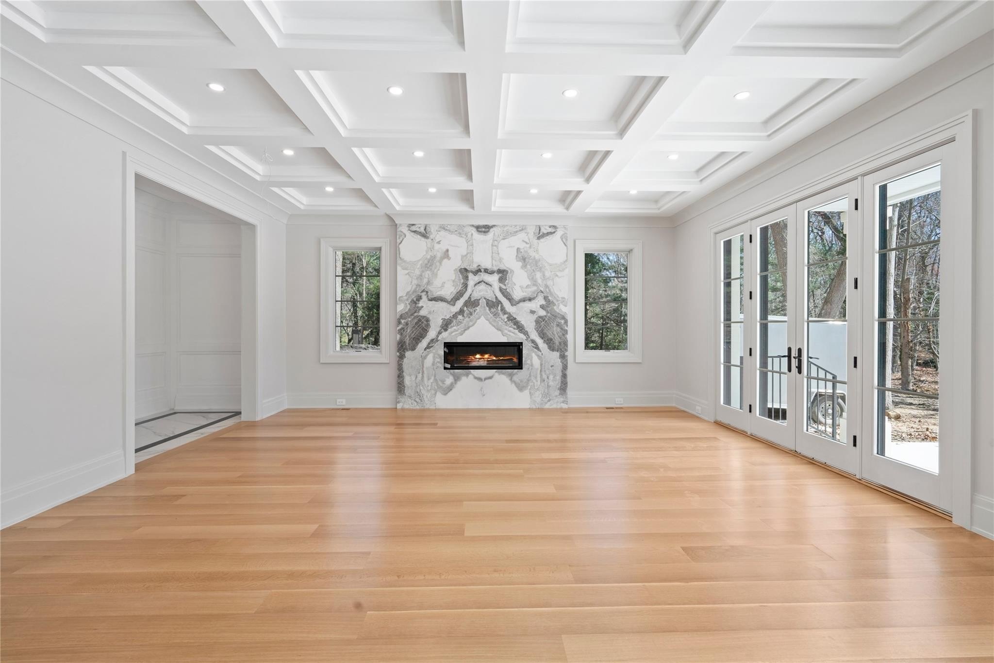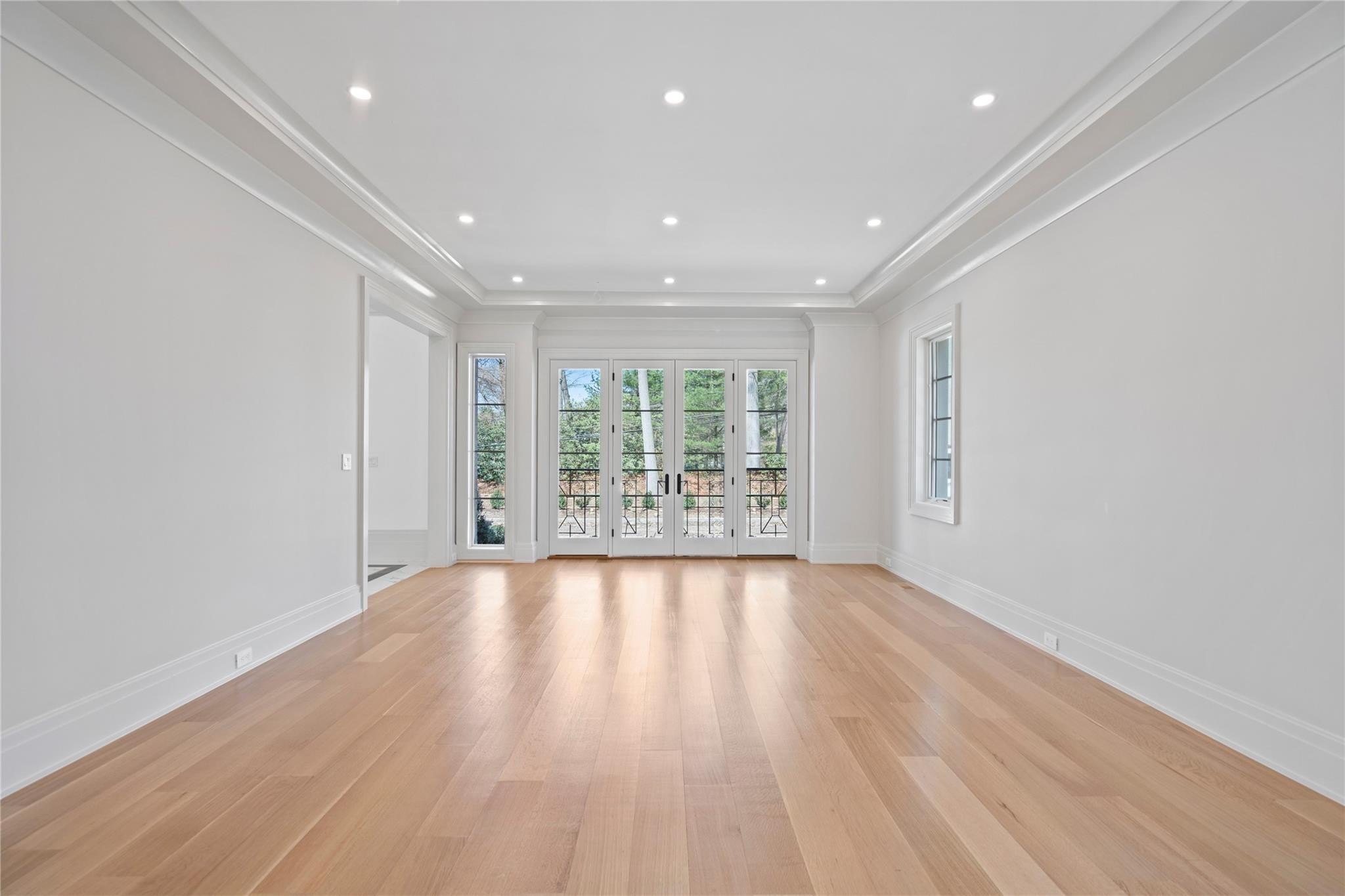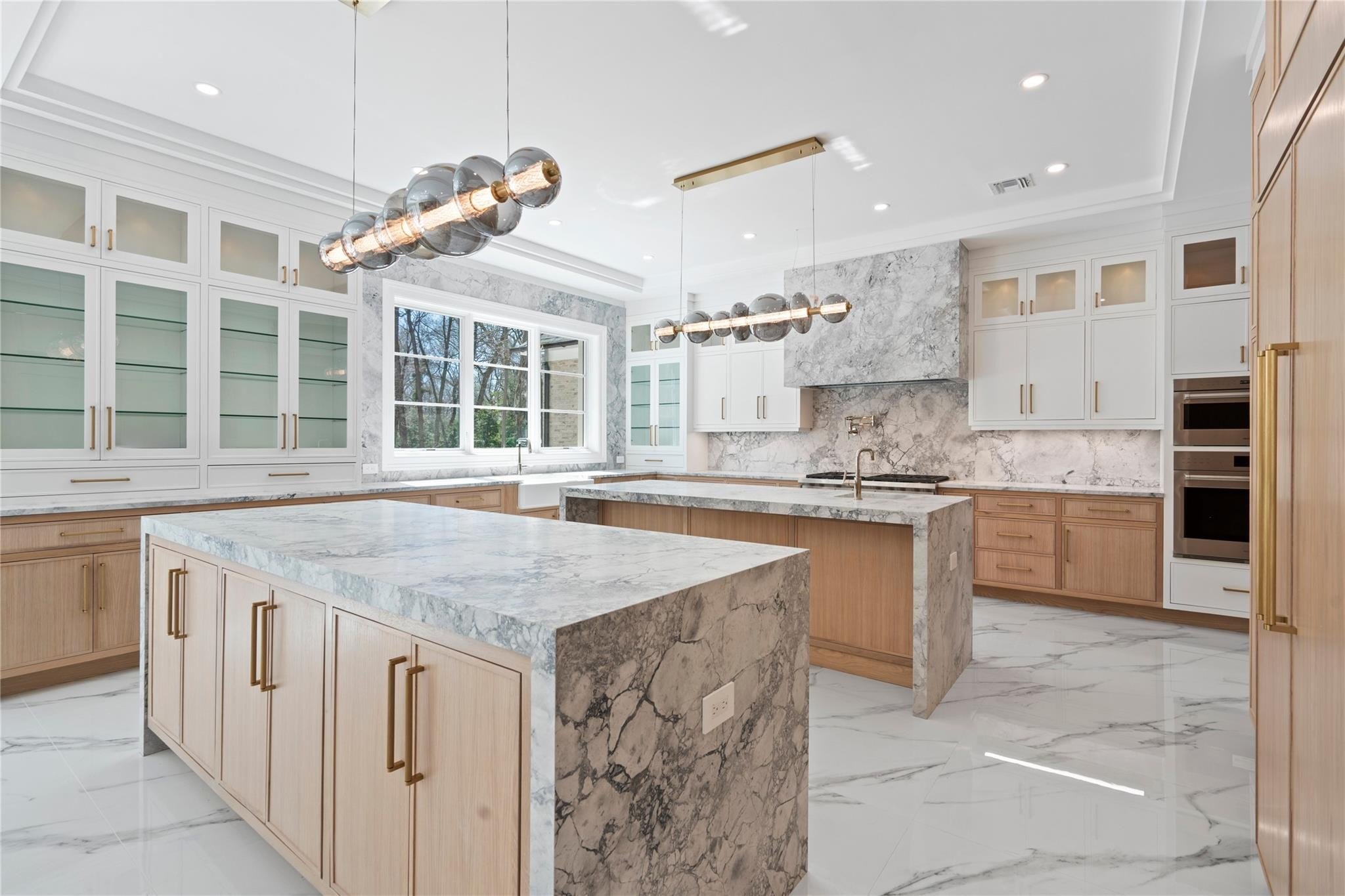Muttontown Brand New Brick Center Hall Colonial | Set on over two private acres on a quiet cul-de-sac, 20 Knollwood Road is an exceptional new construction estate that blends timeless architecture with elevated, modern finishes. With six en-suite bedrooms, soaring 10-foot ceilings on every level, and thoughtfully designed indoor and outdoor spaces, this home is perfectly suited for refined living and grand entertaining. The main level showcases radiant porcelain tile, coffered ceilings, and custom millwork throughout. The kitchen is a true showpiece, featuring two oversized islands with seating and storage, marble countertops, paneled Sub-Zero appliances, a Wolf range and ovens, farmhouse sink, pot filler and more. A formal dining room with wet bar and herringbone floors complements the space, while a powder room finished in striking black marble adds a dramatic touch. The expansive living and entertaining areas flow seamlessly to the outdoors through French doors, opening to a porcelain-tiled patio and a heated Gunite saltwater pool with automatic cover, integrated spa, and lush surroundings. The home includes a full house generator powered by two 1,000-gallon propane tanks, three-zone HVAC, a space for a future elevator, and smart home wiring for speakers, alarm, and surveillance. Upstairs, the primary suite offers a private balcony, dual walk-in closets, and a spa-quality bath with double vanities and Toto fixtures. A junior suite with a Juliet balcony offers additional luxury, while a second-floor laundry room and central vacuum with hidden hose system provide modern convenience. All bedrooms feature en-suite baths, with elegant grey, white, and black marble finishes carried throughout. Additional highlights include a three-car garage with room for car lifts, a mudroom entry, baseboard outlets, flush floor vents, and a 300-pound chandelier motor lift. The home is clad in limestone stucco and brick, with black iron doors and Pella windows offering a sleek, modern exterior. The unfinished lower level leaves over 3,000 sq.ft. to the imagination - with full bathroom and second laundry room to cater to the pool. A rare offering in Muttontown-luxury, privacy, and craftsmanship converge at 20 Knollwood Road.