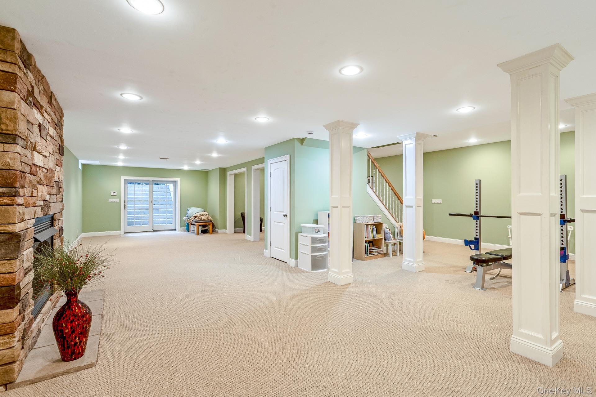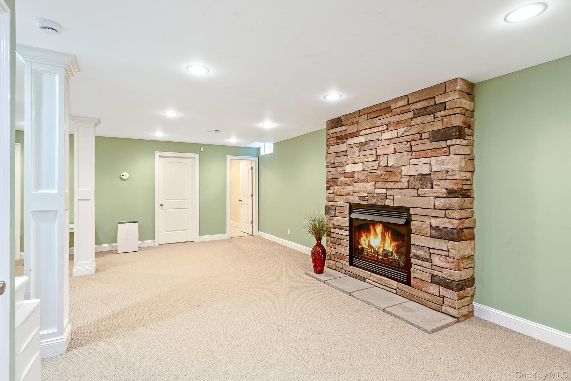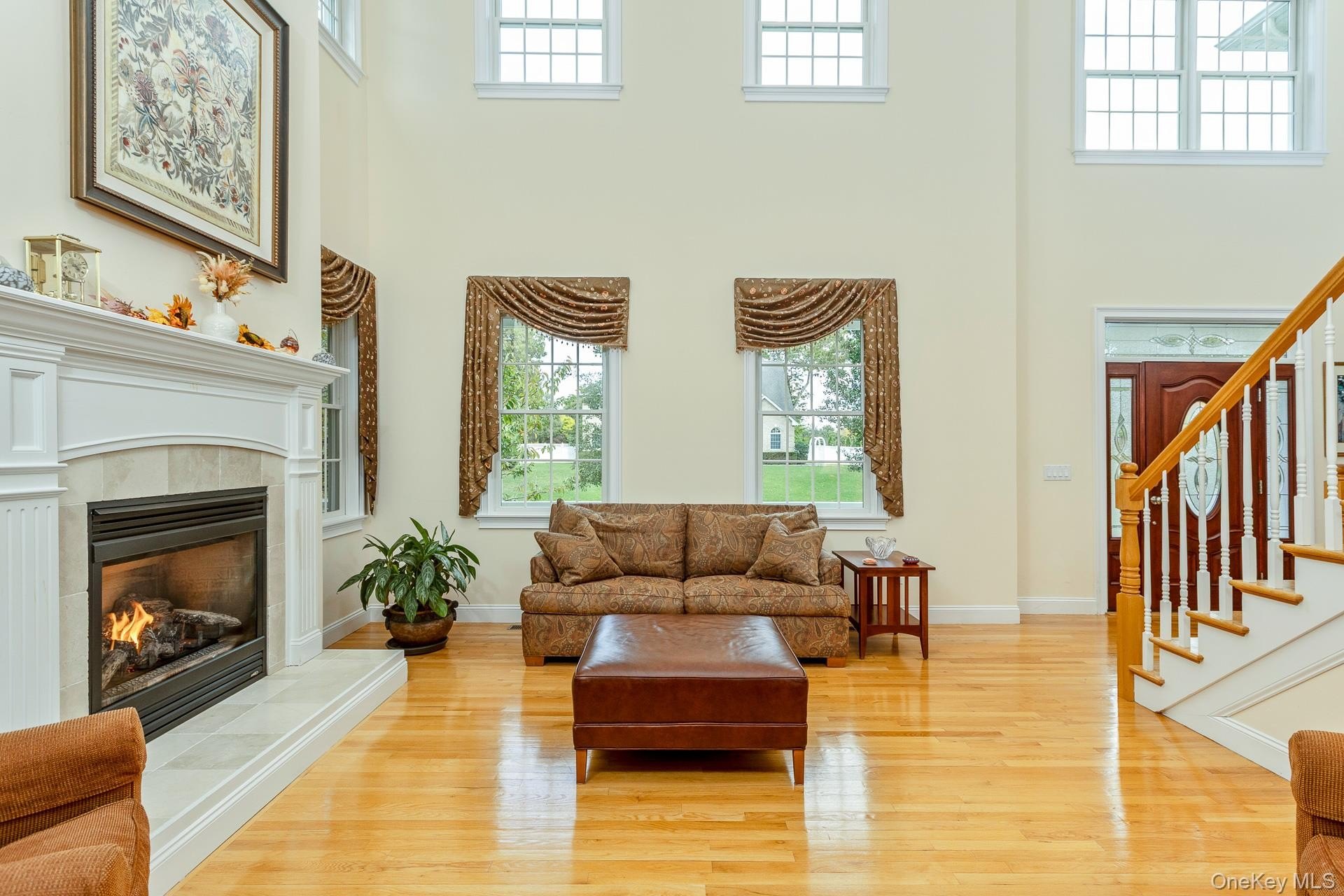Welcome home! Set on a premium .96-acre parcel on a cut-de-sac with in the Counter Manor Estates this elegant traditional home with a wraparound porch blends classic charm with resort-style living. Featuring over 3,400 sq. ft. of open, sun-filled space with hardwood floors, crown molding, and custom details throughout. The chef's kitchen boasts granite countertops, custom cherry 40' cabinetry, stainless steel appliances (2-year-old dishwasher). Along with a 6-burner natural gas cooktop, marble backsplash stunning porcelain tile floors and a large center island that flows into the breakfast area and great room. Entertain with ease in the formal dining room with butler's pantry and relax by the gas fireplace in the living room. Main-floor laundry and mudroom for everyday convenience. Upstairs, the primary suite offers two walk-in closets and a spa-style bath with Jacuzzi tub and glass shower, plus three additional bedrooms and a full hall bath. Andersen windows throughout provide comfort and efficiency. Step outside to your private backyard oasis featuring an expansive stone patio with built-in fire pit and gas grill, overlooking a stone waterfall pool (4 year old liner), surrounded by lush landscaping. The finished walk-out basement with 9-ft ceilings, gas fireplace, full bath, and lounge/media zones adds incredible living space. Extras: 50-year roof, full HVAC, 200-amp electric 40 breaker, central vac, natural gas, public water, cesspool. Located in the Shoreham-Wading River School District, close to beaches, parks & shop & restaurants!
