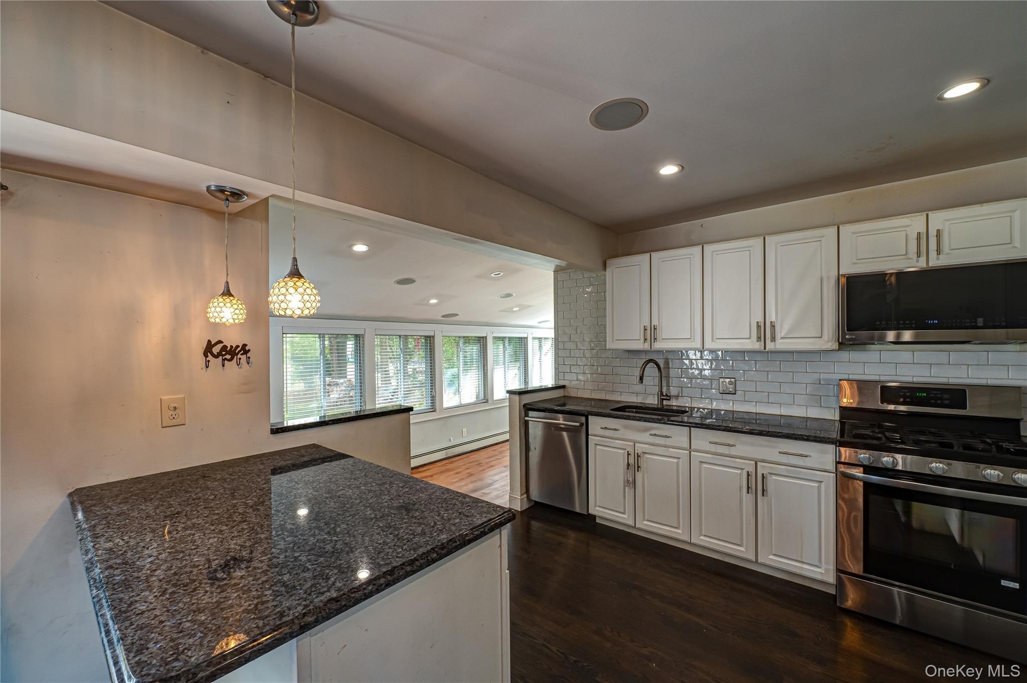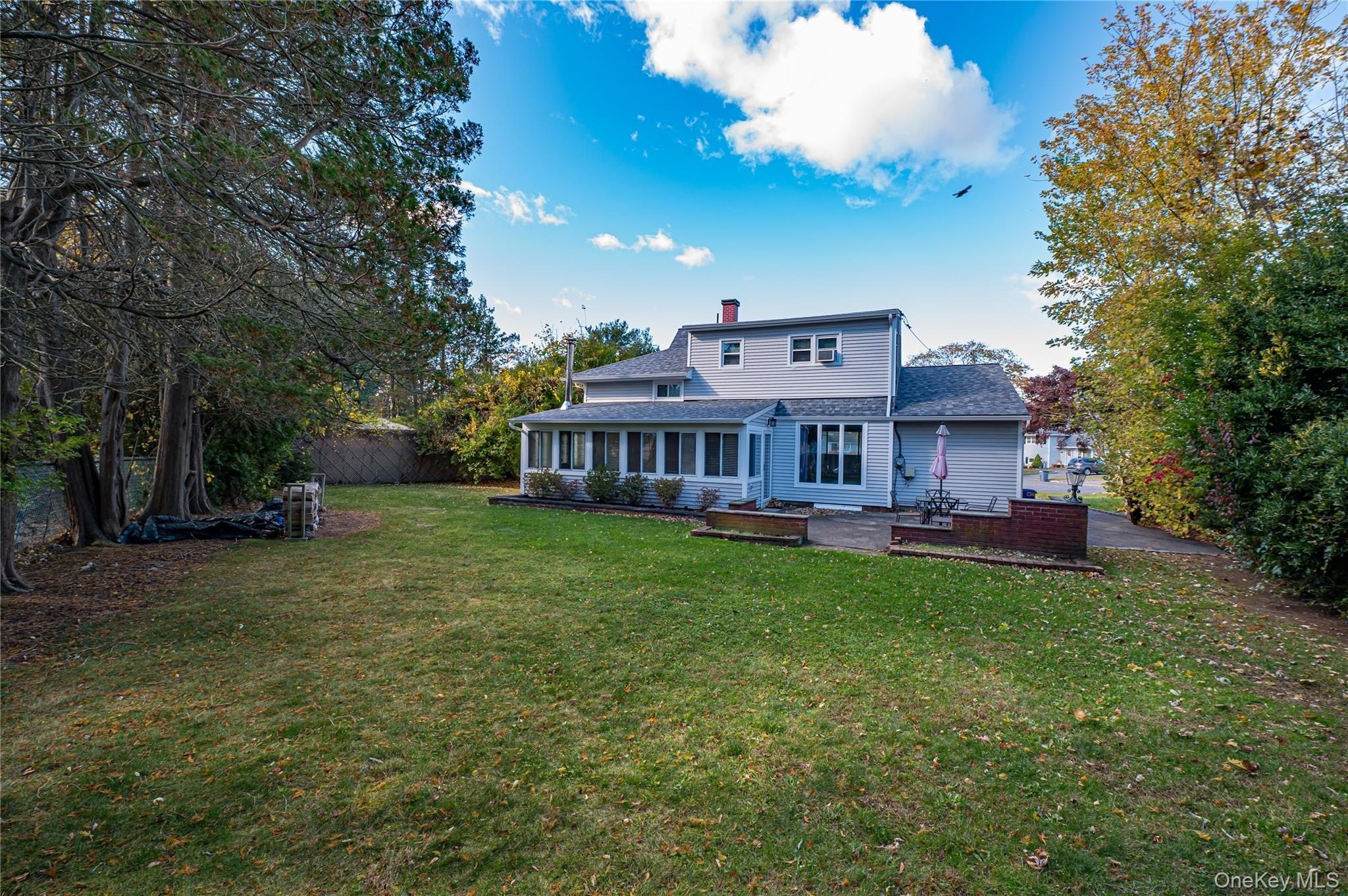 Welcome to this lovely expanded Split-Level home, perfectly nestled on a peaceful cul-de-sac within the Commack School District. Featuring 3 spacious bedrooms, 2 full baths, and a bright Sunroom/Den, this home offers the ideal blend of comfort and functionality. Conveniently located near shops, restaurants, and just minutes from the Long Island Rail Road (8 miles), you'll enjoy both tranquility and accessibility. The open-concept living and dining rooms flows into the updated kitchen, complete with granite countertops and stainless steel appliances. From the kitchen, step into the inviting Den/Sunroom featuring a cozy wood-burning stove, providing a warm and relaxing space to enjoy year-round with views of the landscaped backyard. The fully fenced yard includes a brick patio and in-ground sprinkler system - ideal for outdoor dining, entertaining, and summer fun. Additional highlights include hardwood floors, new siding, central air, a new hot water heater, and natural gas heating. Charming, spacious, and move-in ready, this home truly has it all - comfort, style, and a prime location in a quiet, family-friendly neighborhood.