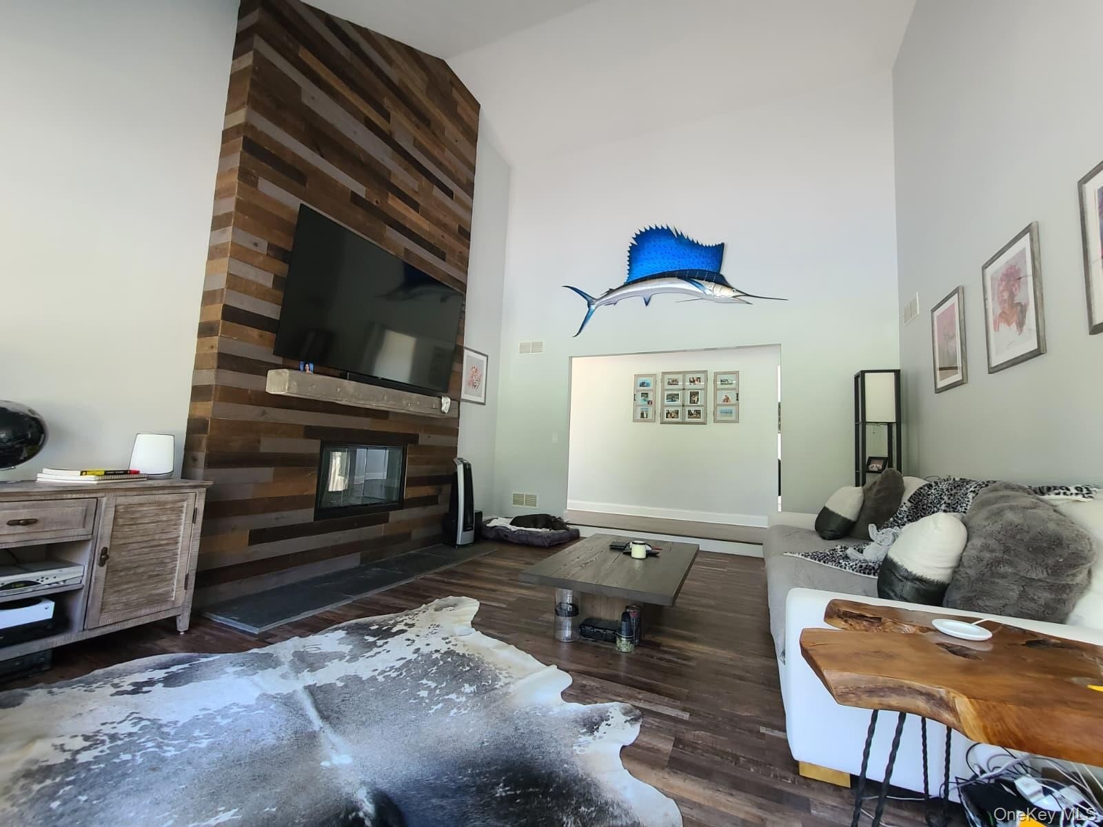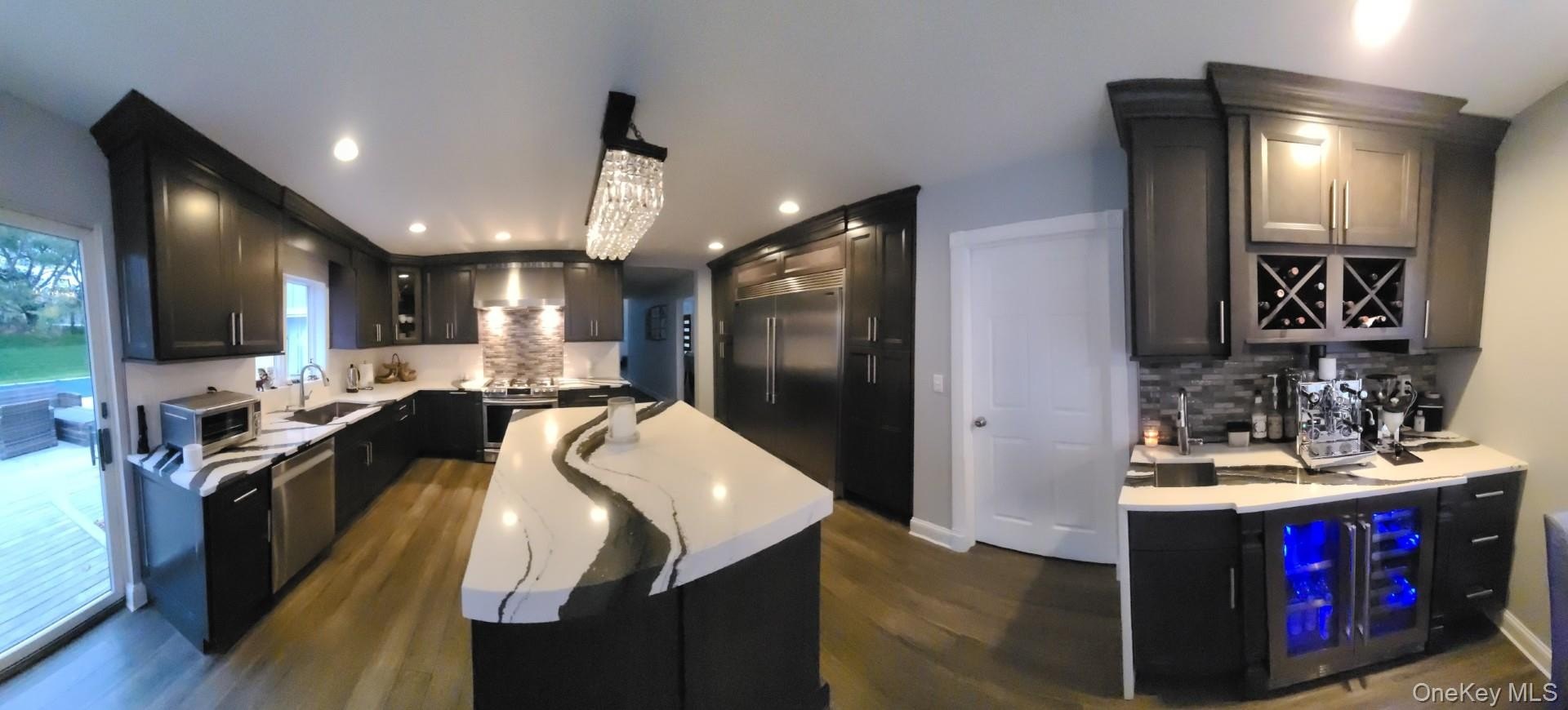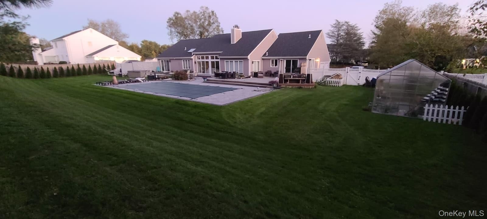 Beautifully updated center hall ranch in the Miller Farms section of Miller Place. Approximately 2900 sq ft plus semi-finished lower level with gym, sauna, and guest quarters. Huge 2900 sq ft basement. Cathedral ceilings up to 16 ft throughout most of the home. Features 3 bedrooms, 2.5 baths, bamboo hardwood floors, LED lighting, and dual-sided fireplace. Kitchen with Cambria quartz, 72" refrigerator/freezer, and custom coffee/wine station. Primary suite opens to deck with sunken hot tub. Exterior updates include newer roof, siding, furnace, hot-water heater, and 2-zone central AC. Newer heated saltwater inground pool with approx. 1,900 sq ft of pavers, Bull outdoor kitchen, greenhouse, and raised garden beds. New double-width driveway (2024), 11-zone sprinklers, solar system, universal EV charger, video security, and vinyl-fenced yard. Minutes to Trader Joe's, Starbucks, Stop & Shop, and North Shore beaches. Truly a turn-key luxury home.