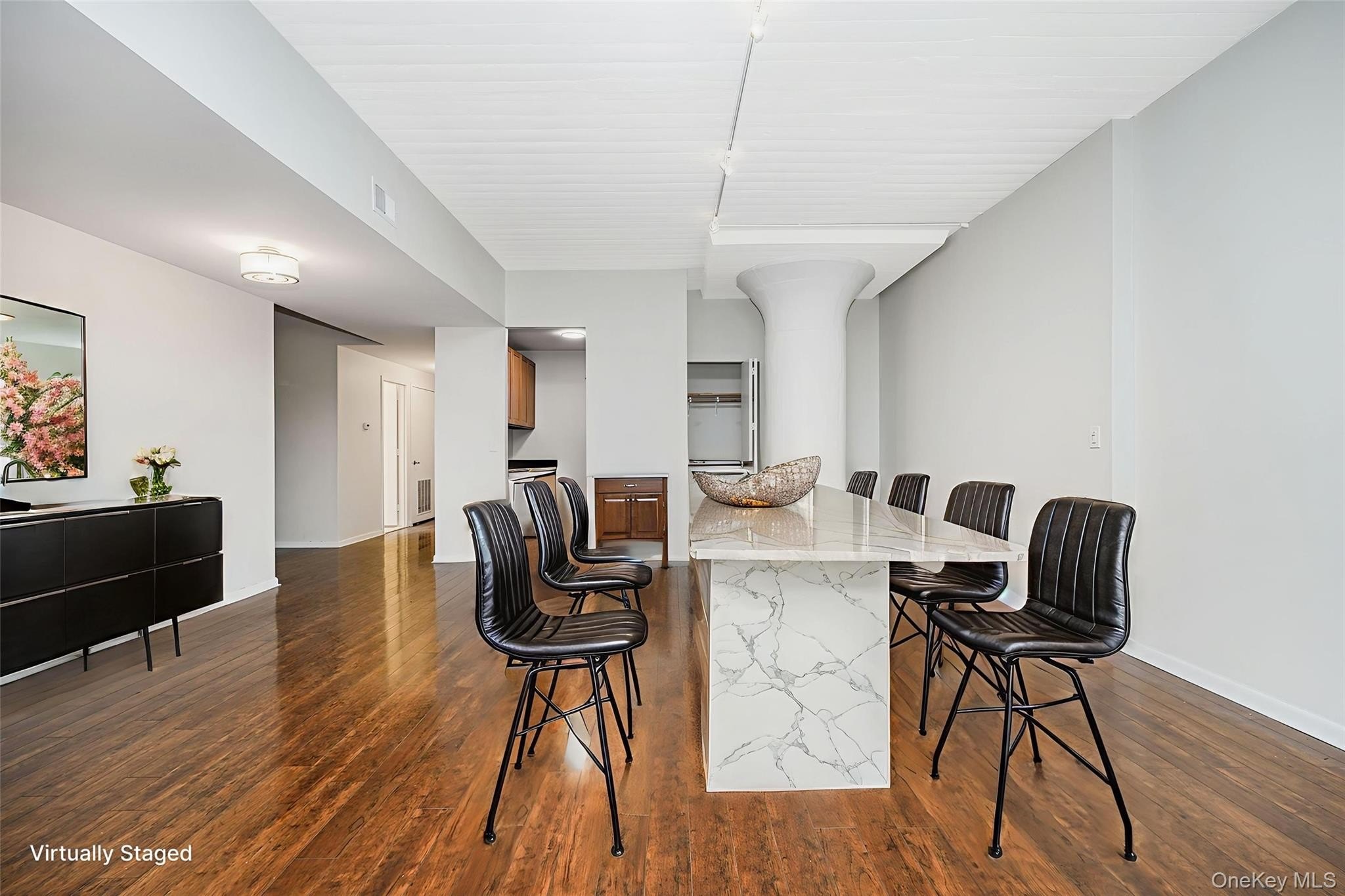 3K, located in Bayview Tower Condominium, within the gated waterfront Bay Street Landing community, is a 1,306 sq ft 1BR/1.5 Bth home with a private covered patio. The views are of the glistening Manhattan and Brooklyn Skylines. Bayview Tower, just steps from the ferries, is a converted warehouse. Architectural detail is resplendent with columns that define, high ceilings and wide open space. If you enjoy quiet, this is for you. The layout permits for the possibility of a 2nd Br. This condo has 24 Hr Concierge, accepts pkgs, has a live-in super, Central AC and great closets. Parking is included. The community has a gym, tennis/pickle ball courts, EV chargers, great lawns, dog runs, a basketball hoop, children's playground and more. Beautifully maintained cherry wood-laminate floors extend throughout the apartment. The kitchen has wood cabinetry and stone counters. The King++ size BR can has an en-suite Mbath with a dressing area. The 1/2 bath awaits your design. Located in a gated community 6 minutes walk to the NYC fast Ferry to mid-town or the free SI ferry to FIDI. Buy now before the promenade waterfront park is completed!! Call today for an appointment.