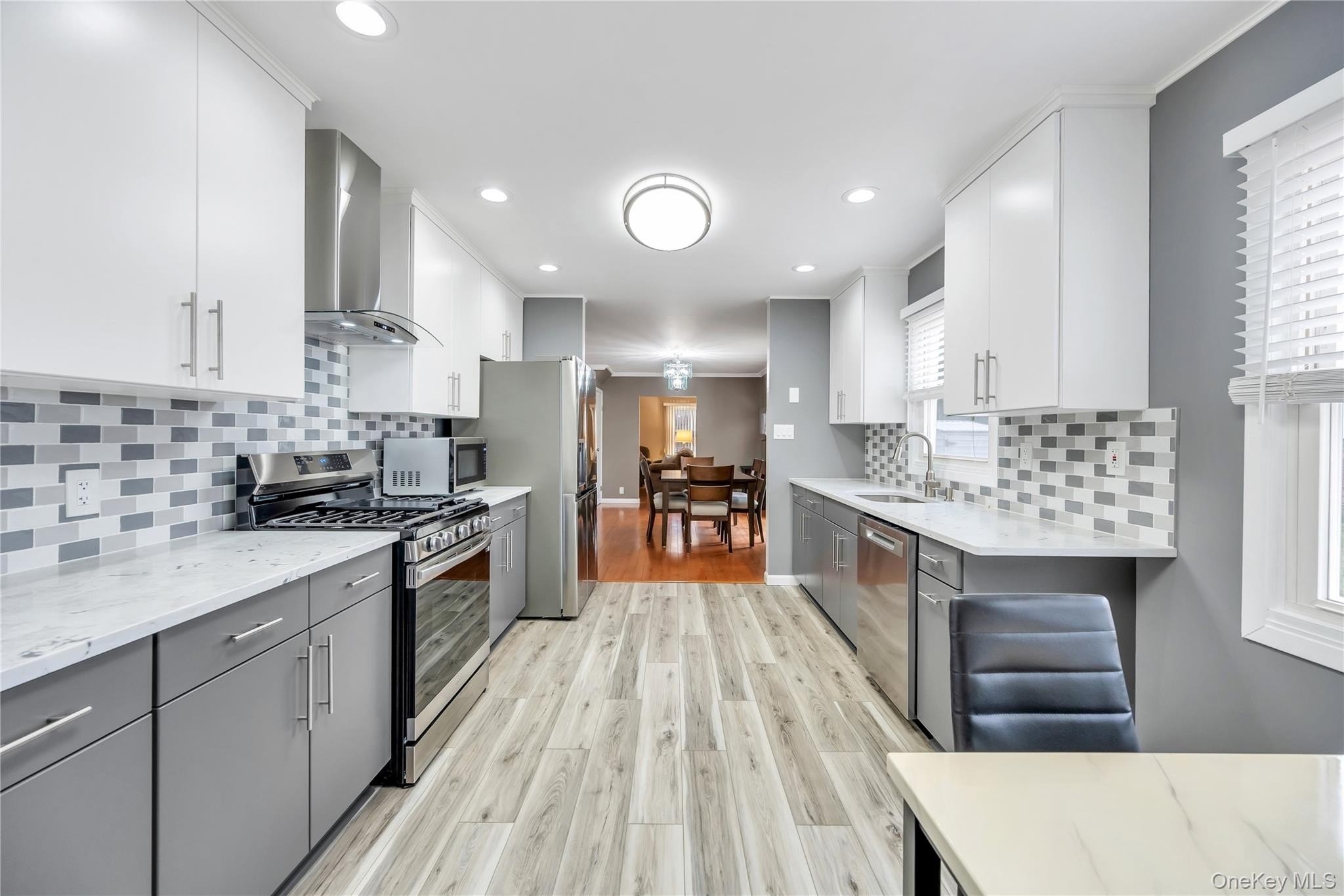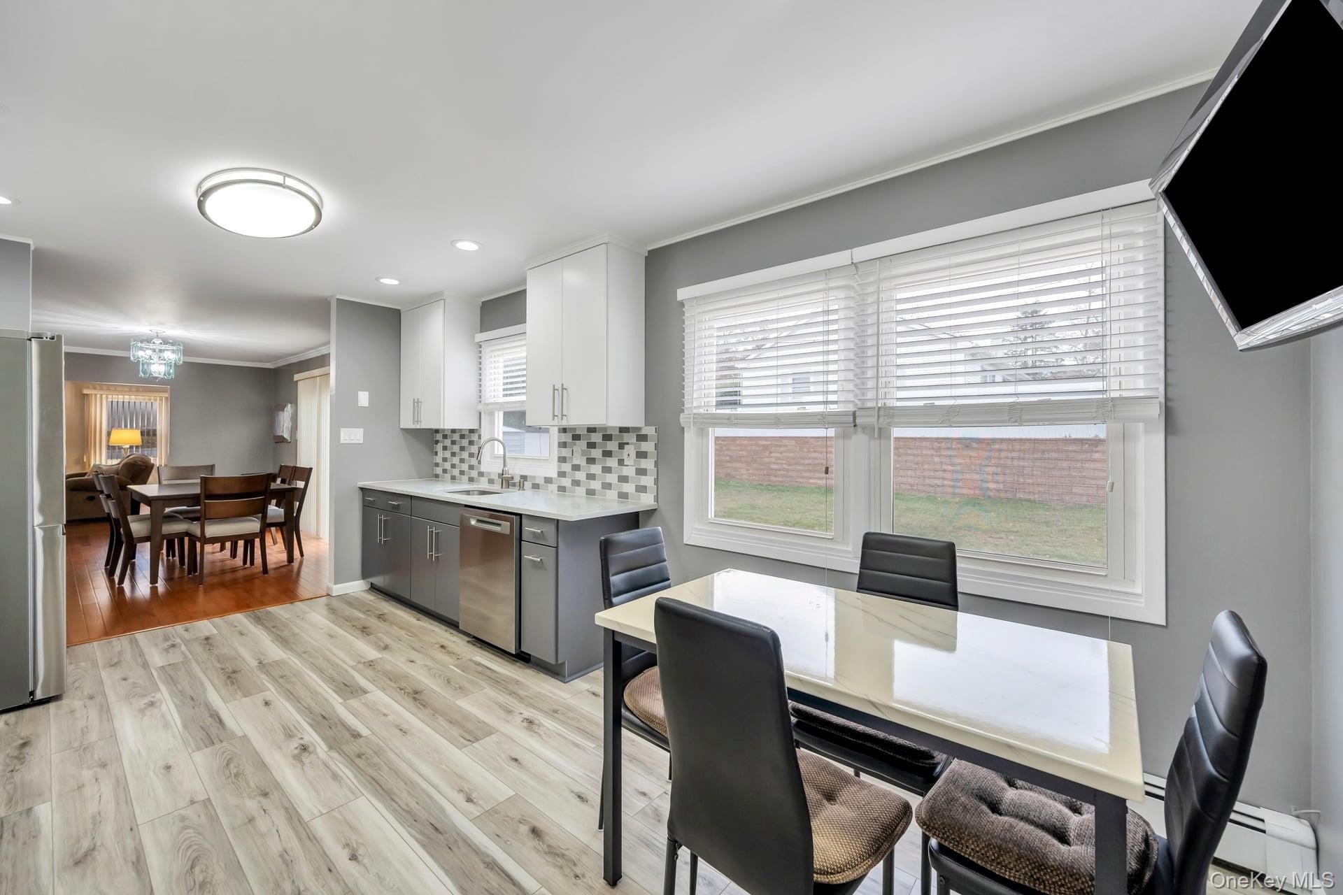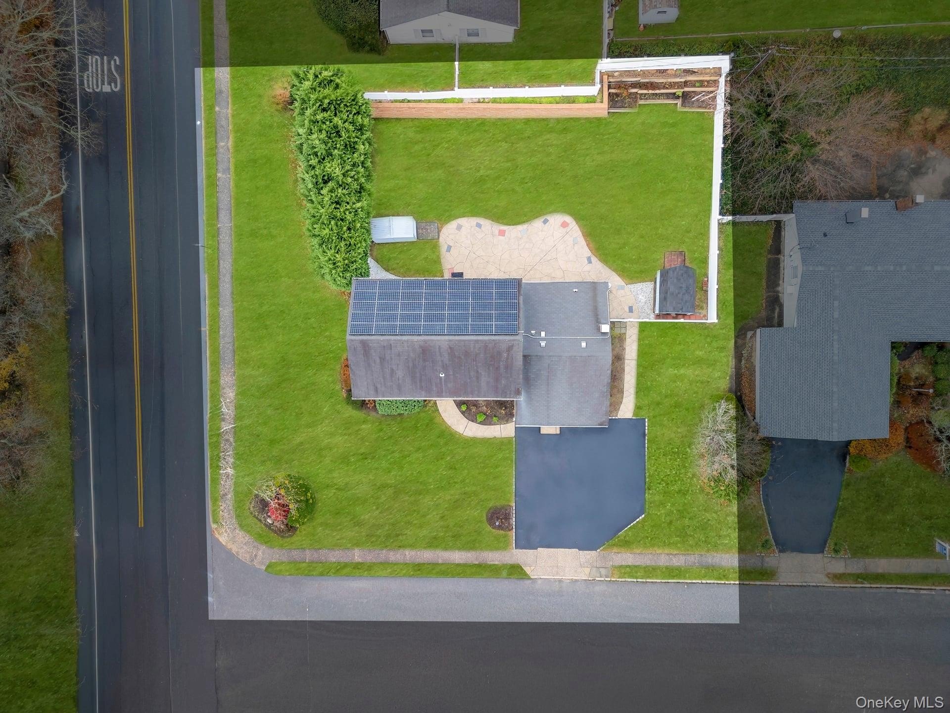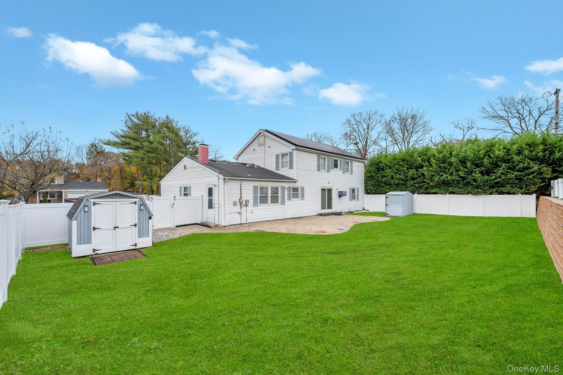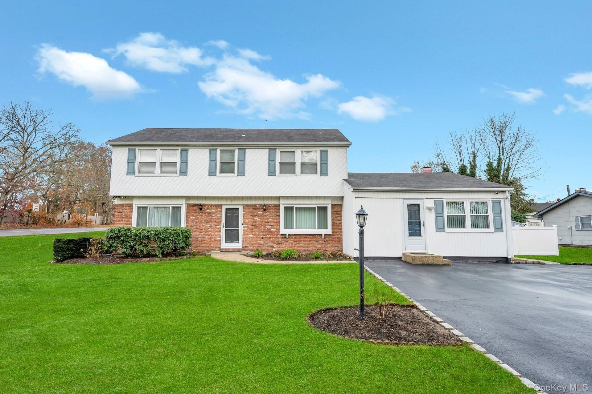 Incredible opportunity in the highly desirable Lake Grove Village, perfectly positioned in the sought-after T-section, offering sewer and sidewalks on an oversized corner lot. This expanded colonial immediately impresses with beautiful vinyl siding, a brick front facade, and a garage conversion with its own separate entrance, full bathroom, and certificate of occupancy-ideal for extended living or flexible use. The gorgeous home features real owned outright solar panels, practically off the grid. The property features an expanded blacktop driveway with Belgium block border and cement skirt, providing exceptional off-street parking. The private backyard is fully enclosed with beautiful vinyl fencing and enhanced by mature landscaping, a large stamped concrete patio perfect for entertaining, a stone retaining wall, and two oversized storage sheds. Inside, the open floor plan showcases beautiful hardwood floors throughout, a formal living room, custom molding and recessed lighting throughout, a spacious dining room, and an updated chef's kitchen with grey bottom and white top cabinets, subway tile backsplash, quartz countertops, stainless steel appliances, an LG refrigerator, and a propane 5-burner stove. The first floor also offers a dedicated mudroom with washer and dryer and a separate entrance, plus an additional half bath off the kitchen. Upstairs, the enormous primary suite features hardwood floors, double closets and an updated primary bath with a glass stand-up shower, while the additional bedrooms are generously sized with hardwood floors and the hallway bath includes a tub and glass shower. Additional home features include professionally updated windows in select areas including the bathrooms and front of the house, one electric meter, three heating zones, pull-down attic stairs, a four-zone sprinkler system, 150-amp electrical service, a full unfinished basement with high ceilings and updated windows, a Weil-McLain boiler with Riello head and water storage tank only two years old, white PVC fencing, LED lighting, crown molding, cameras and alarms, and excellent closet space within the garage conversion. This rare offering delivers space, flexibility, and tremendous value in one of the most desirable pockets of Lake Grove.