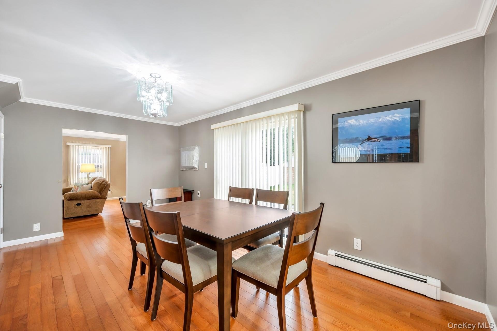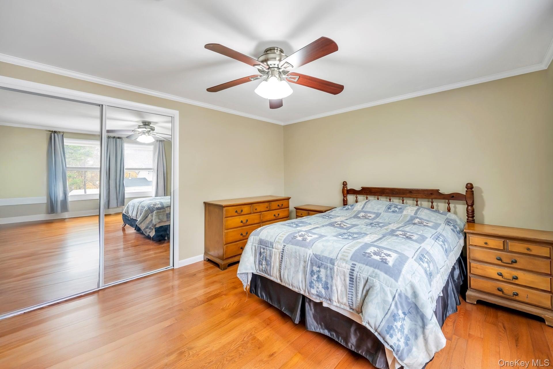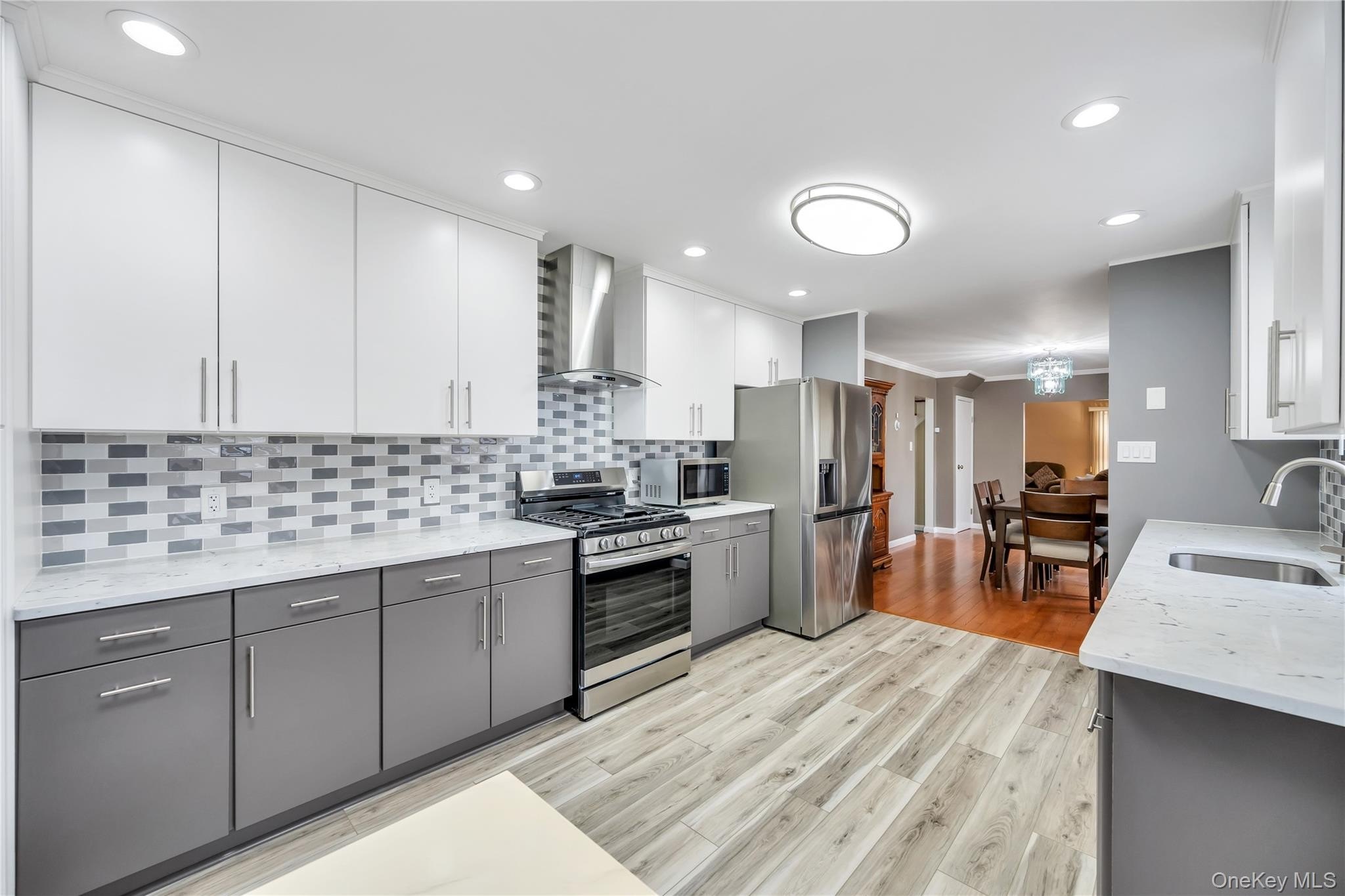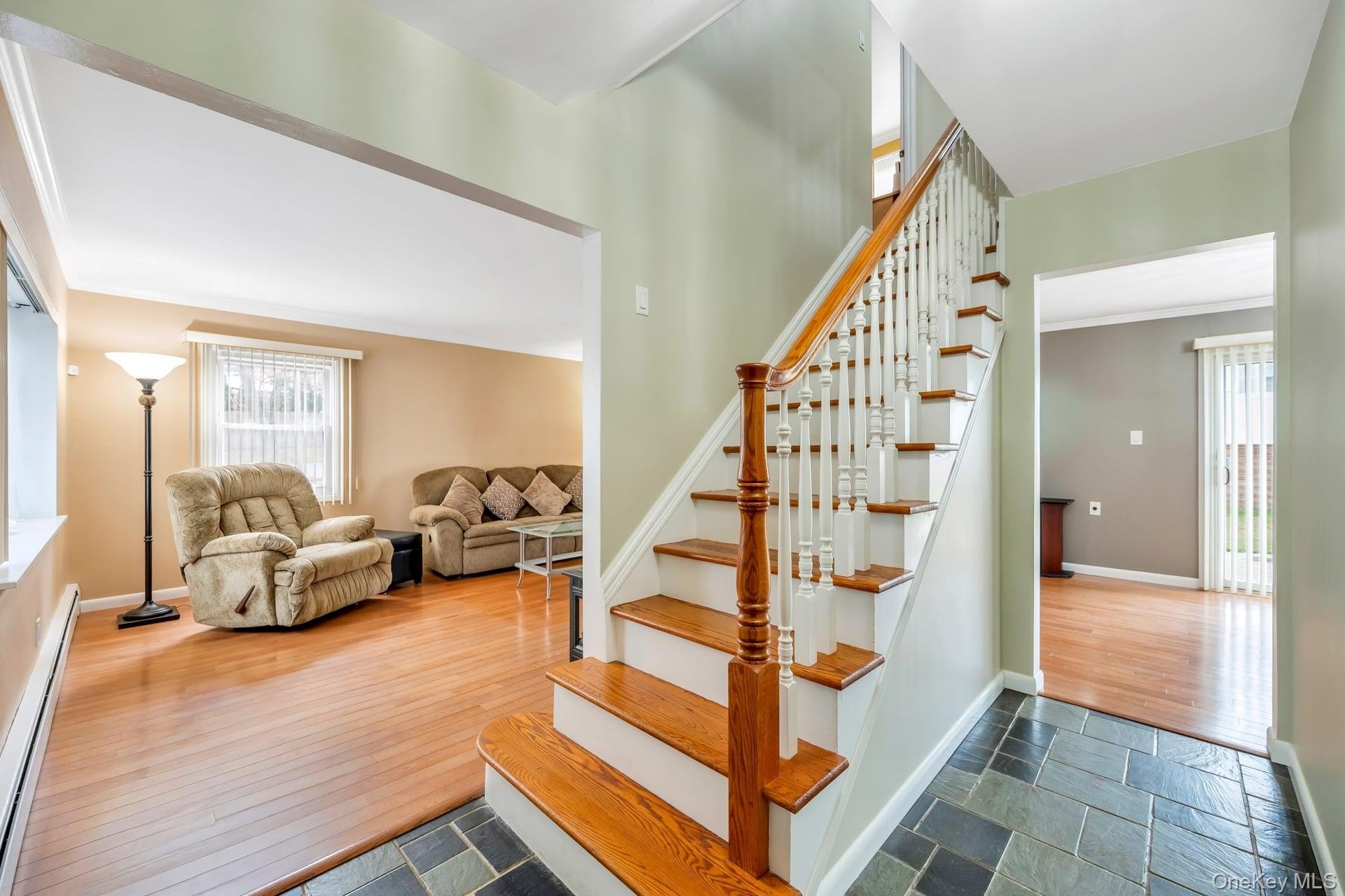 Incredible opportunity in the highly desirable Lake Grove Village, perfectly positioned in the sought-after T-section, offering sewer and sidewalks on an oversized corner lot. This expanded colonial immediately impresses with beautiful vinyl siding, a brick front facade, and a garage conversion with its own separate entrance, full bathroom, and certificate of occupancy-ideal for extended living or flexible use. The gorgeous home features real owned outright solar panels, practically off the grid. The property features an expanded blacktop driveway with Belgium block border and cement skirt, providing exceptional off-street parking. The private backyard is fully enclosed with beautiful vinyl fencing and enhanced by mature landscaping, a large stamped concrete patio perfect for entertaining, a stone retaining wall, and two oversized storage sheds. Inside, the open floor plan showcases beautiful hardwood floors throughout, a formal living room, custom molding and recessed lighting throughout, a spacious dining room, and an updated chef's kitchen with grey bottom and white top cabinets, subway tile backsplash, quartz countertops, stainless steel appliances, an LG refrigerator, and a propane 5-burner stove. The first floor also offers a dedicated mudroom with washer and dryer and a separate entrance, plus an additional half bath off the kitchen. Upstairs, the enormous primary suite features hardwood floors, double closets and an updated primary bath with a glass stand-up shower, while the additional bedrooms are generously sized with hardwood floors and the hallway bath includes a tub and glass shower. Additional home features include professionally updated windows in select areas including the bathrooms and front of the house, one electric meter, three heating zones, pull-down attic stairs, a four-zone sprinkler system, 150-amp electrical service, a full unfinished basement with high ceilings and updated windows, a Weil-McLain boiler with Riello head and water storage tank only two years old, white PVC fencing, LED lighting, crown molding, cameras and alarms, and excellent closet space within the garage conversion. This rare offering delivers space, flexibility, and tremendous value in one of the most desirable pockets of Lake Grove.