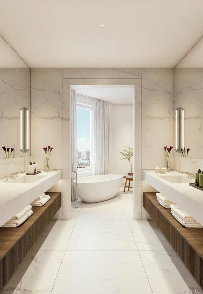 32 Walker is a collection of 5 bespoke residences nestled in a historic landmark district. This architectural gem features natural limestone and historic cast iron facades, blending timeless elegance with modern luxury. Residents enjoy exclusive amenities, including a state-of-the-art fitness center with a custom infrared wood sauna, private elevator access via grand entrance gallery into the homes, bicycle storage, full-time doorman, a package room, and private storage available for purchase, all designed to elevate your living experience. Residence Four is a 3 bedroom with a home office featuring expansive 10" White European oak flooring, paired effortlessly with flush bases and natural travertine stone surroundings for doors. With ceiling heights soaring up to an astounding 13'6", the expansive spaces radiate opulence. Floor-to-ceiling French doors bathe great rooms in natural light, and bedrooms, feature monumental, simulated double-hung windows for an unmatched living experience. Indulgences extend even further with en-suite night bar in primary suites and fully equipped laundry rooms, featuring sinks and large-capacity washers with vented dryers. Designed for the discerning chef, the custom Molteni Italian kitchens are a masterwork of craftsmanship and materiality. Floor-to-ceiling eucalyptus cabinetry with bronze-finished hardware provides a seamless, sculptural aesthetic, while Cristallo quartzite slabs are used for both the countertops and backsplashes, creating a rich, cohesive look. A suite of premier appliances includes a Wolf 36" double-oven cooker, a fully integrated 36" Sub-Zero refrigerator and freezer, Miele dishwasher, and Sub-Zero wine coolers. A double-basin stainless steel sink with Waterworks fixtures completes this exceptional culinary space where refined design meets functional perfection. The five-fixture primary bath is a study in timeless elegance, wrapped in honed Venus White marble across the wet walls and floors. A fluted glass shower and water closet enclosure add texture and privacy, complemented by radiant heated floors for year-round comfort. An oversized alcove soaking tub serves as the room's serene focal point, paired with a custom fluted walnut vanity topped in honed Venus White marble. Polished nickel fixtures by Waterworks and a wall-hung Toto toilet complete this refined, spa-like retreat. Secondary bathrooms are adorned with hones travertine wet walls, floors, and countertops.