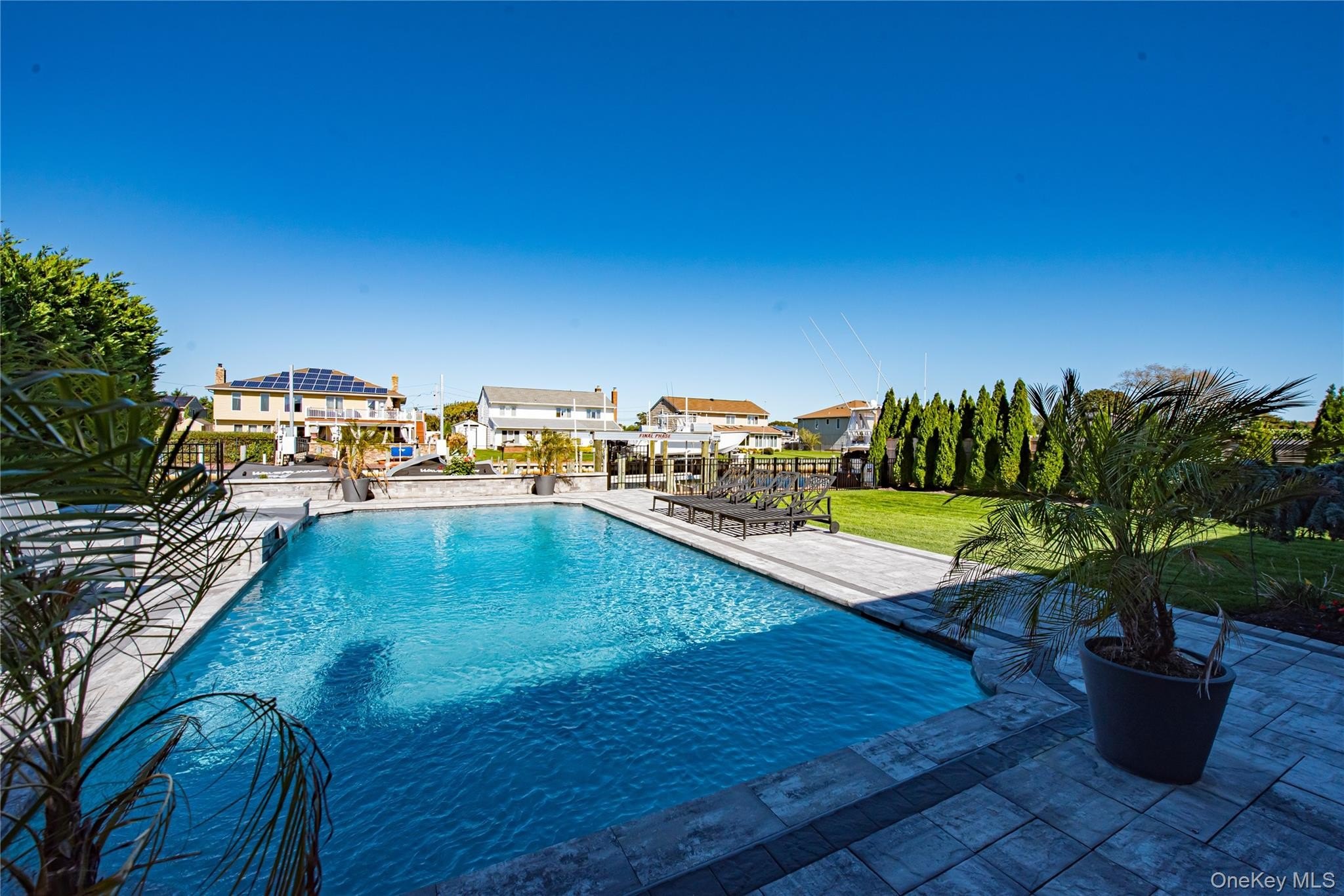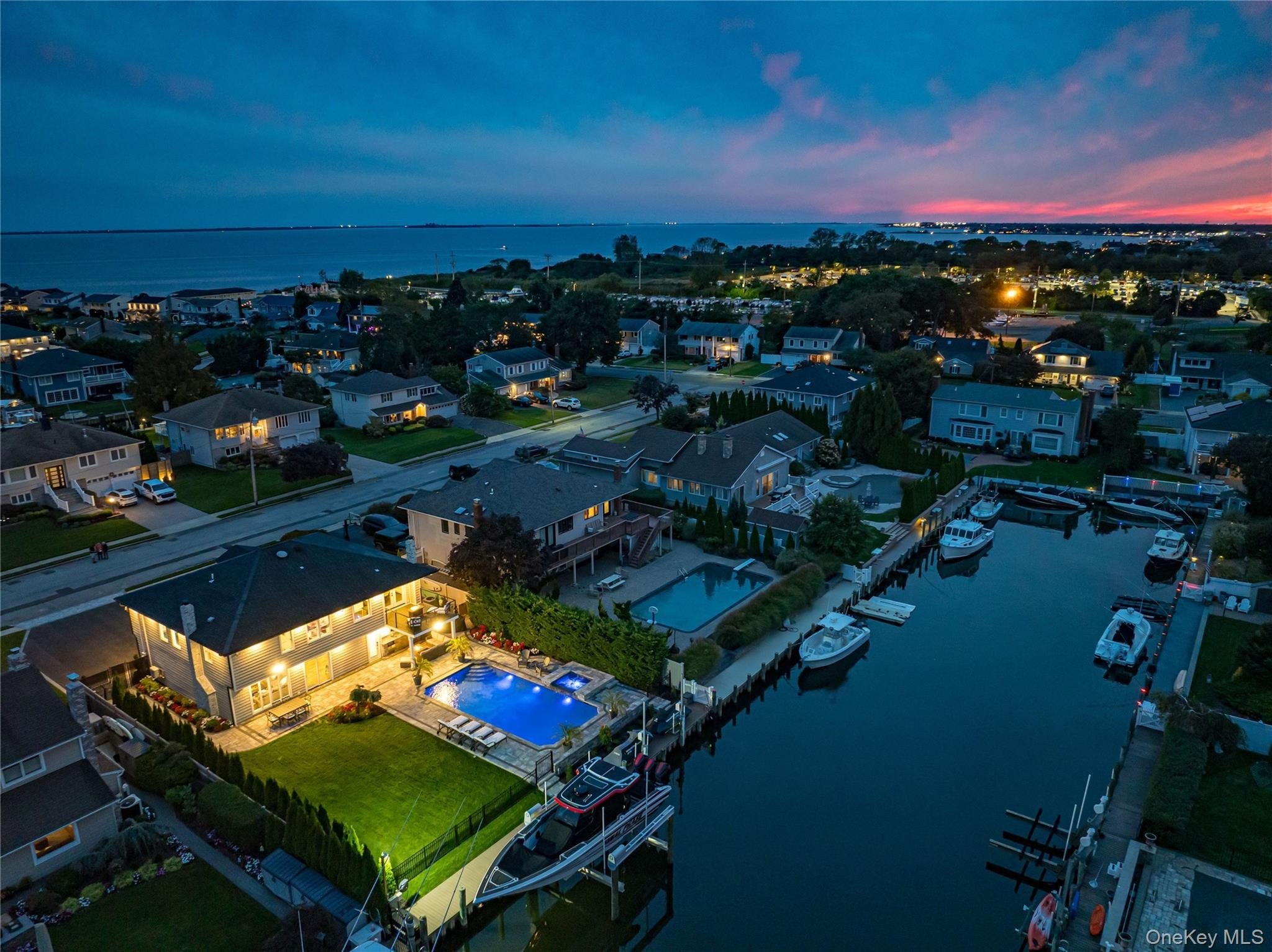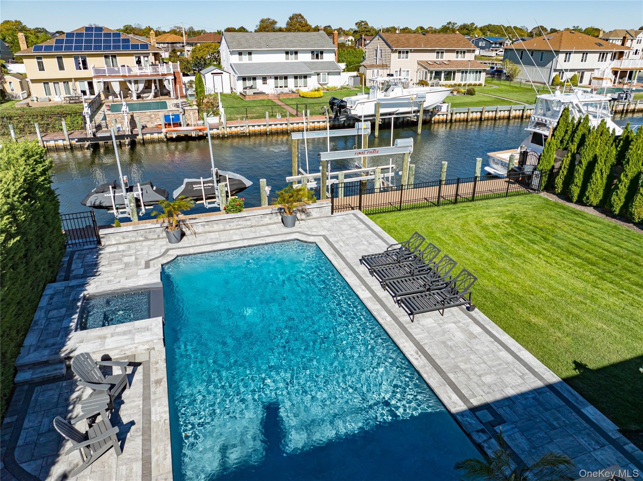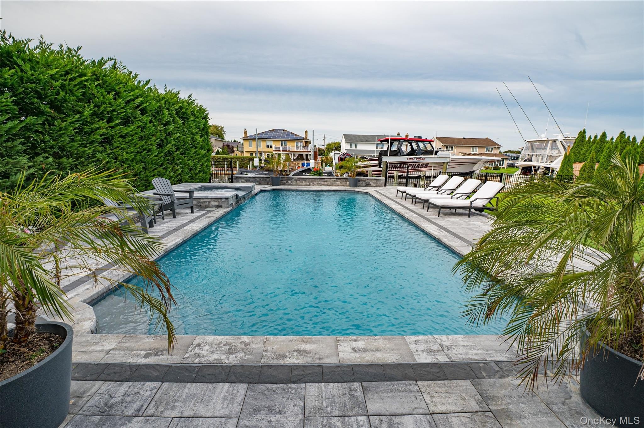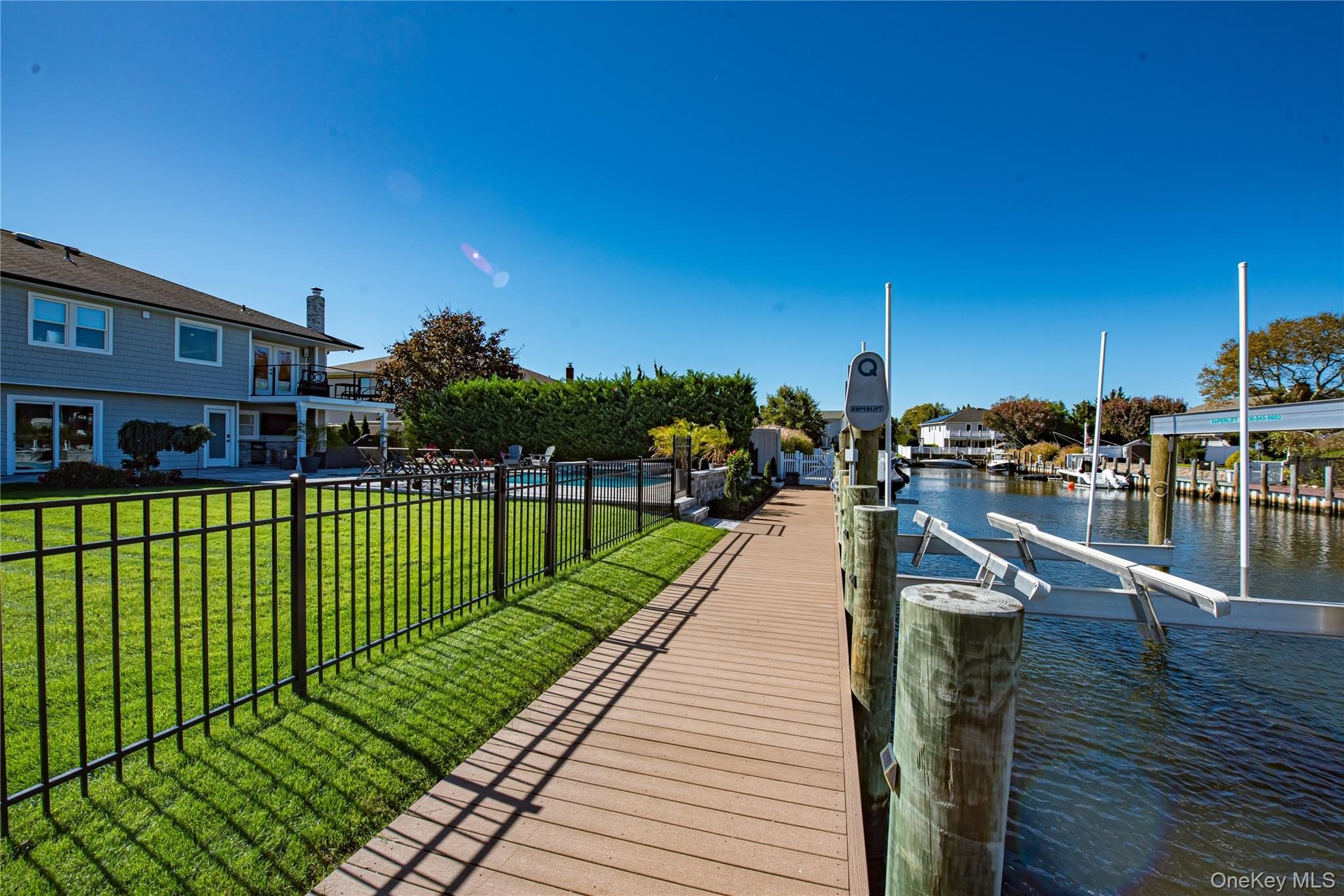 Located on a quiet, private cul-de-sac, this pristine wide-line Hi Ranch offers the perfect blend of luxury, privacy, and waterfront living. The entry foyer leads to a spacious living room with an electric fireplace, formal dining room with access to a second-story balcony overlooking the yard, saltwater gunite pool, hot tub, and 75' of waterfront. The custom center-island kitchen includes a large pantry, with stainless steel and Energy Star appliances. The primary suite features a luxurious private bath and an adjacent lavish, custom-designed walk-in wardrobe. Two additional bedrooms and a full bath complete the upper level, which boasts dark walnut-stained hardwood floors. Radiant heat floors are found in all bathrooms and the laundry room. The lower level includes a large bedroom, den with a wood-burning fireplace and ceramic flooring, full bath, cedar closet, oversized laundry room with dual washers/dryers and a custom built in dog washing station to keep your four-legged friends clean and pampered without leaving home, and access to a heated 2-car garage. Upgrades include all new Andersen windows (except three rear), 2023 updates throughout, central air with an additional ductless unit in the primary suite, and a whole-home H2O system. The 75' bulkhead (replaced in 2015) includes a 22,000-lb boat lift, one jet ski lift, and a dedicated 100-amp dock panel. Flood insurance and elevation certificate available upon request. This home is truly in immaculate, nearly "unlived-in" condition-an exceptional waterfront opportunity.
