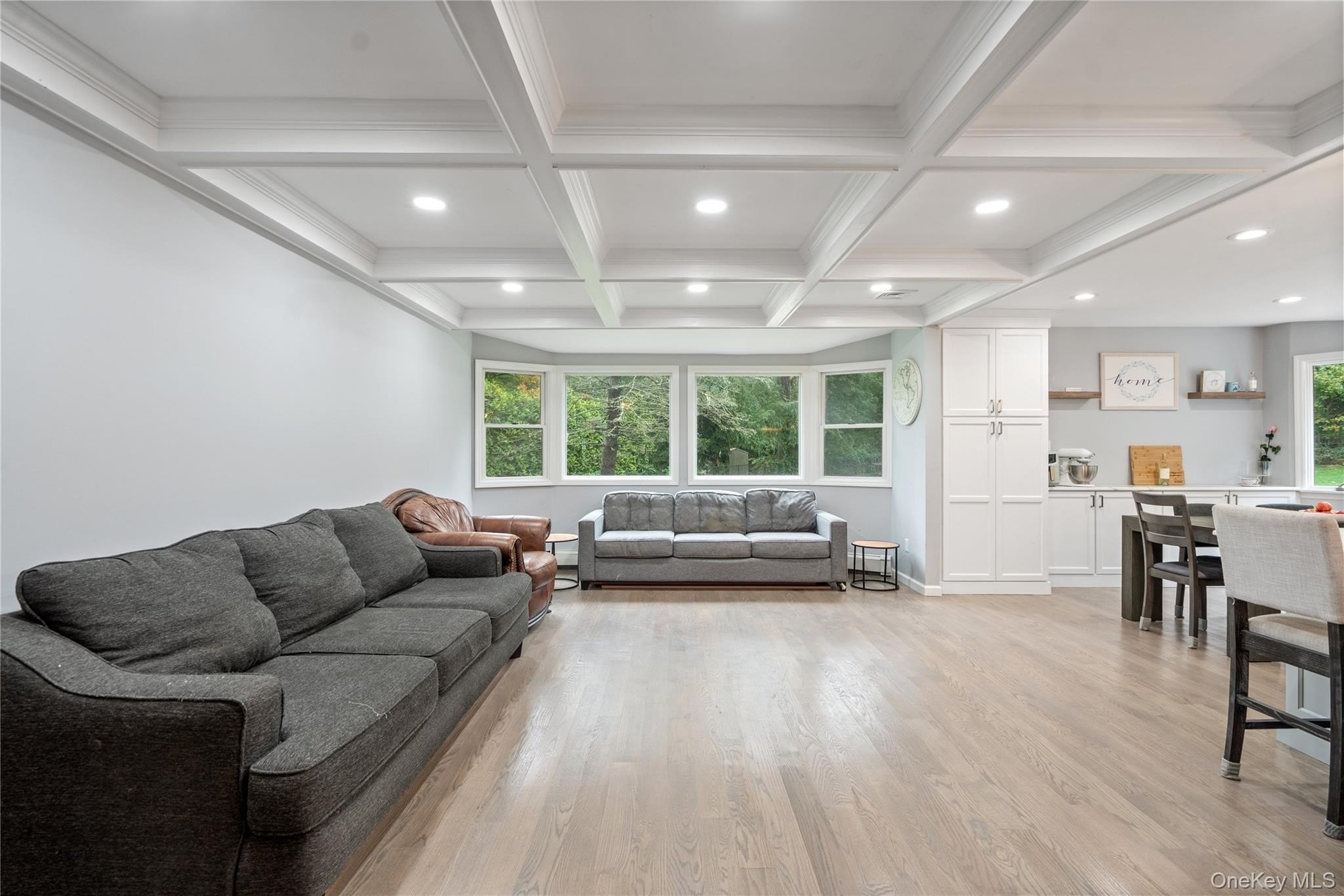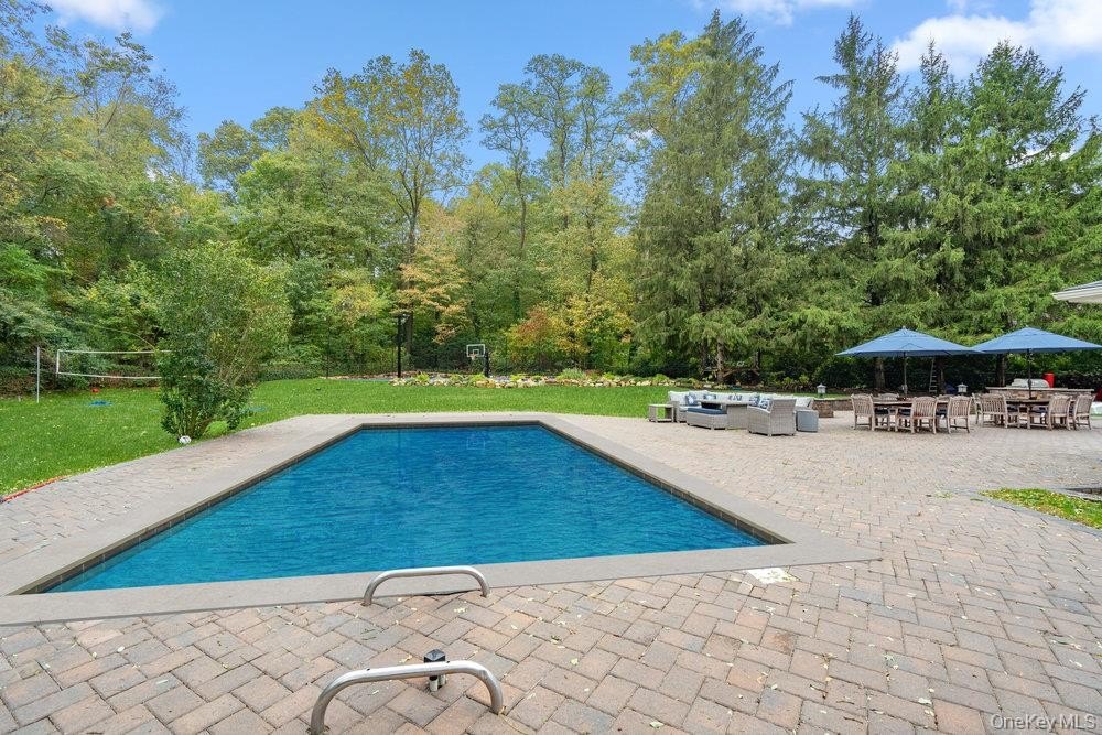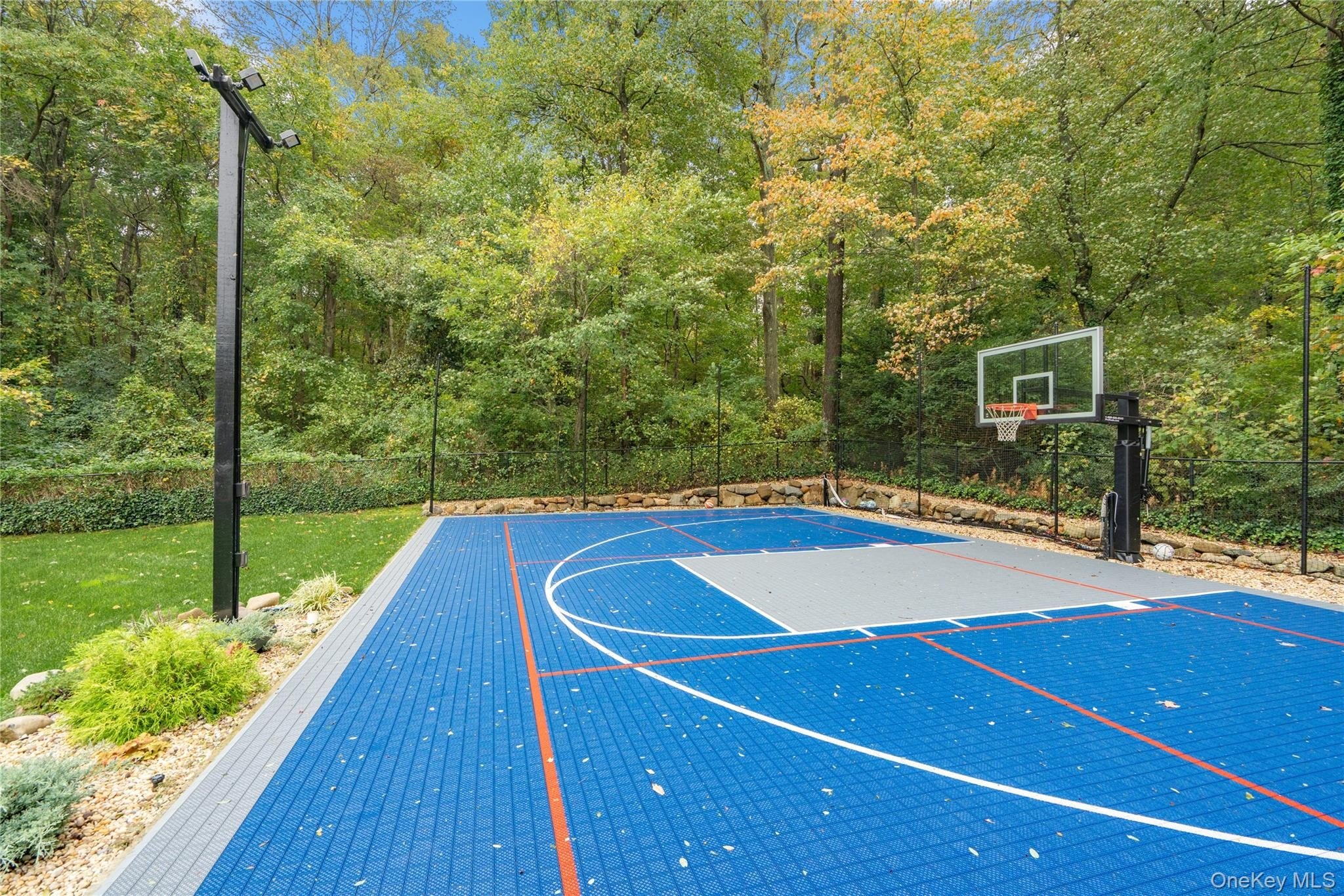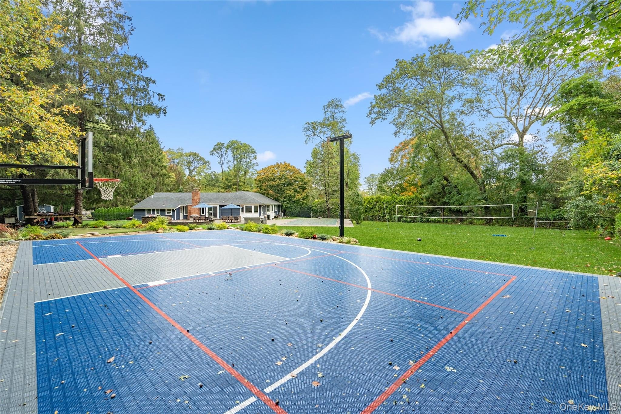 Warm and Inviting! Experience the perfect blend of elegance and comfort in this totally renovated 5-bedroom, 5-bath Ranch on a lush, private acre in the heart of Dix Hills. The open floor plan is ideal for modern living, with wood floors throughout, a living room with coffered ceiling, and a den featuring a cathedral ceiling with 2 skylights, and cozy wood-burning fireplace. Two primary with full baths, plus a home office with a full bath and private entrance. The full finished basement is perfect for entertainment, complete with a golf simulator / media room. Step outside to your own resort-style backyard with a heated saltwater pool, sports court, putting green, outdoor kitchen, and professionally landscaped grounds - a true private retreat. Located in the highly desirable Half Hollow Hills School District. Not-to-be-Missed!