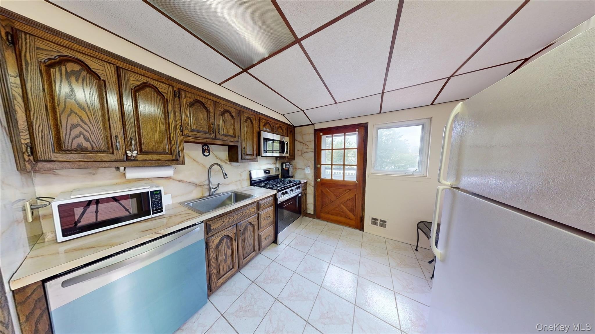 Welcome to 640 Carlls Straight Path, a high ranch offering a perfect blend of space, comfort, and functionality. This inviting home features oak hardwood floors, a new roof and siding, and a versatile layout ideal for today's living. Step inside to find a bright and open living room with large bay windows that fill the home with natural light. The formal dining area opens seamlessly to the kitchen, which now includes new stainless steel appliances, making it perfect for gatherings and everyday meals. The upper level offers three generous bedrooms and a full bath, while the lower level provides exceptional flexibility, including a spacious family room with a cozy propane fireplace, additional bedroom, laundry area, and a second full bath, ideal for extended family, guests, or a home office setup. Enjoy the outdoors with a large backyard, a raised deck perfect for entertaining, and a covered patio below for shaded relaxation. The attached two-car garage and wide driveway offer ample parking and convenience. Located close to shopping, parks, and major roadways.