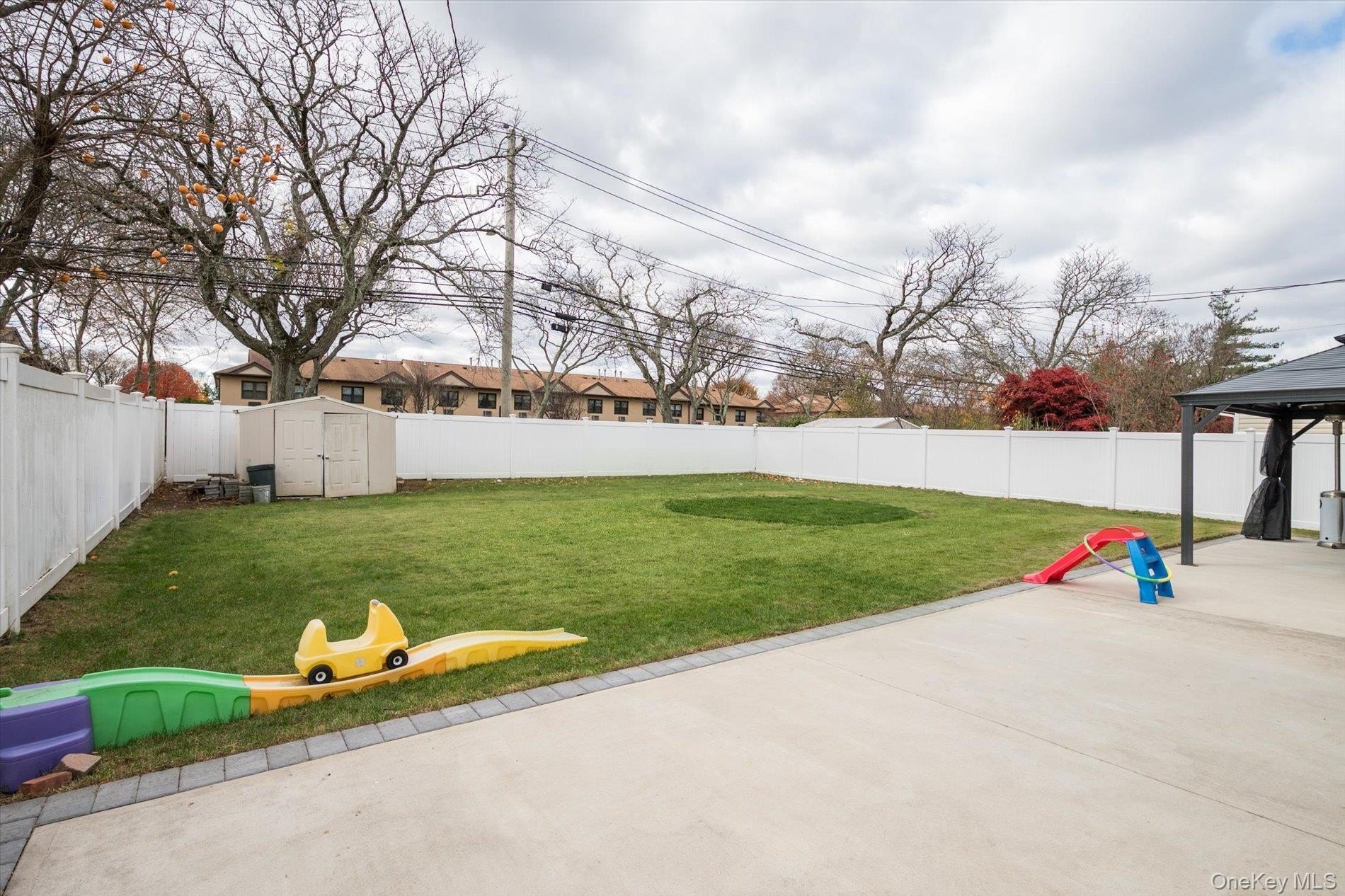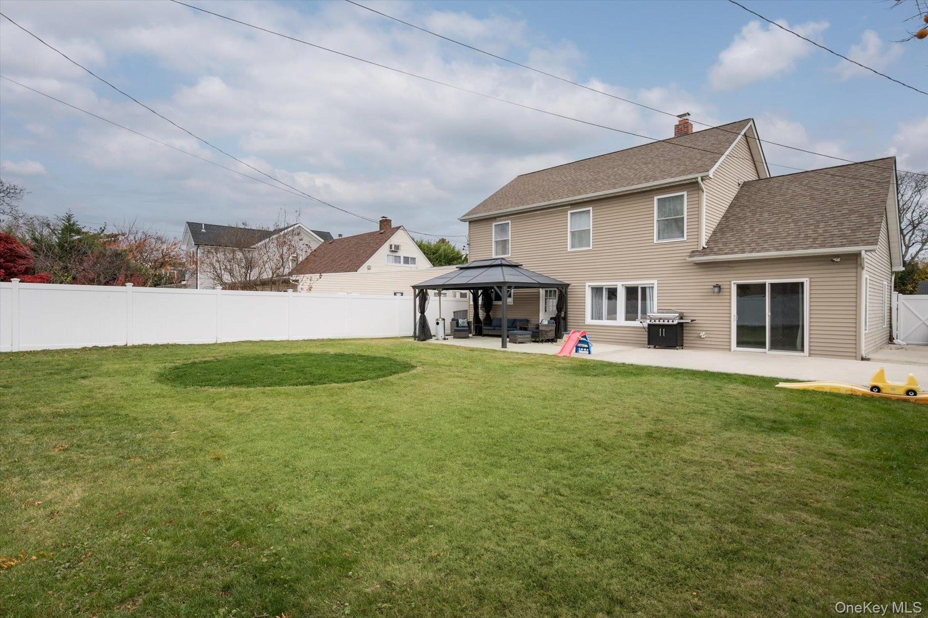 Welcome to 98 Hardy Lane, a custom-built 4 bedroom, 3 bath colonial with 2110 sq ft, located in the heart of Salisbury, within the East Meadow school district. The spacious first floor features an open layout with a dining area, living room, an expanded eat-in kitchen with a dual-sided fireplace, and beautifully tiled floors. The spacious kitchen is updated with granite countertops, stainless steel appliances, and lined with tons cabinet space. A large bedroom, full bathroom, and utility/laundry room complete the main level. Upstairs, the oversized primary suite offers a full ensuite bathroom with double vanity, a huge walk-in closet, and a versatile bonus room ideal for a nursery, office, or dressing/sitting room. Three additional generously sized bedrooms and another full bathroom complete the second floor. This home offers high ceilings, beautiful hardwood floors, a full attic, and fresh interior paint throughout, making it truly move-in ready. Enjoy a spacious, private, fully fenced backyard with a covered patio and gazebo, perfect for year-round entertaining. Don't miss out on this perfect home!