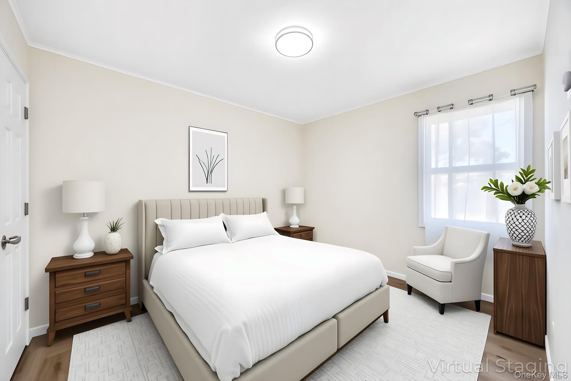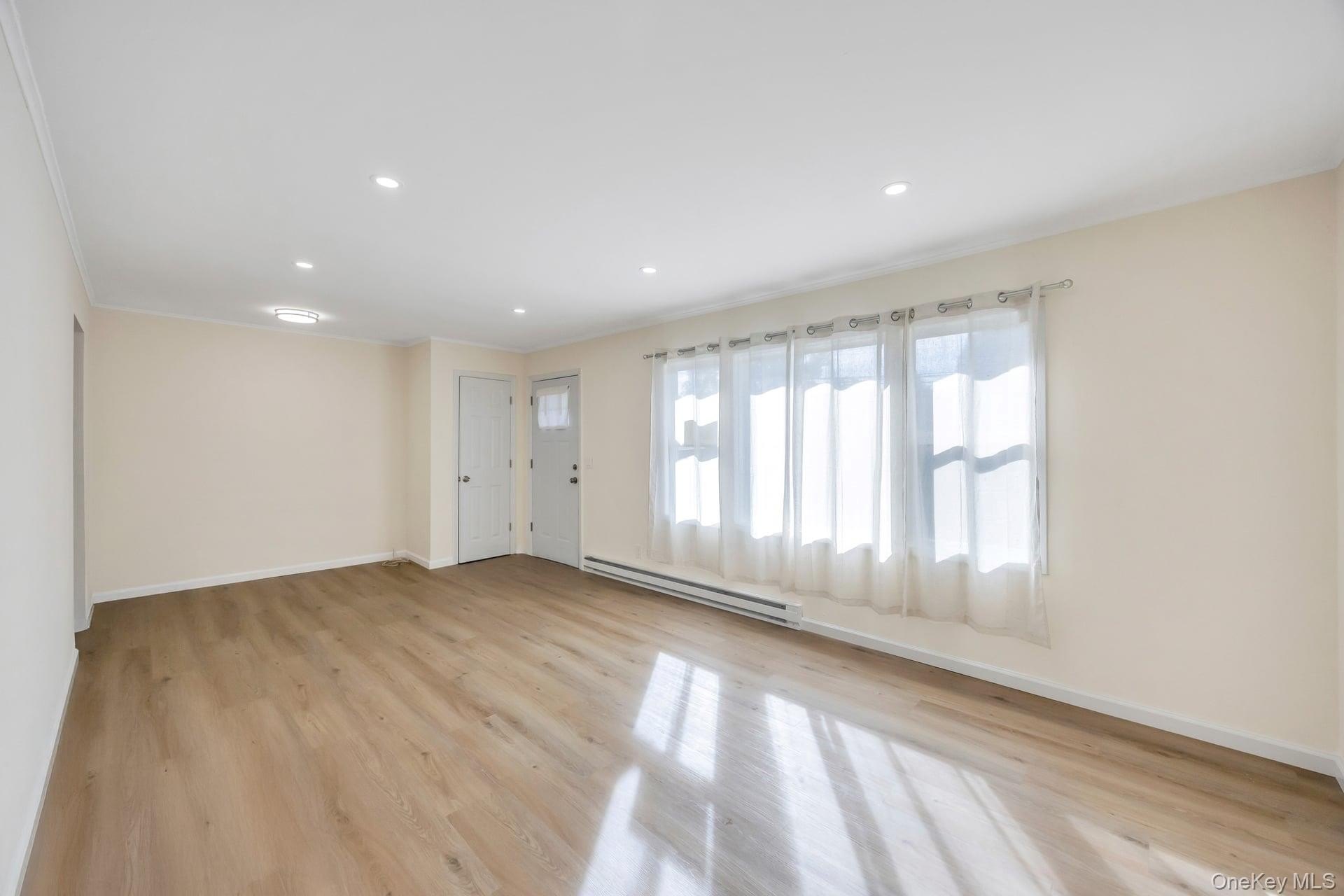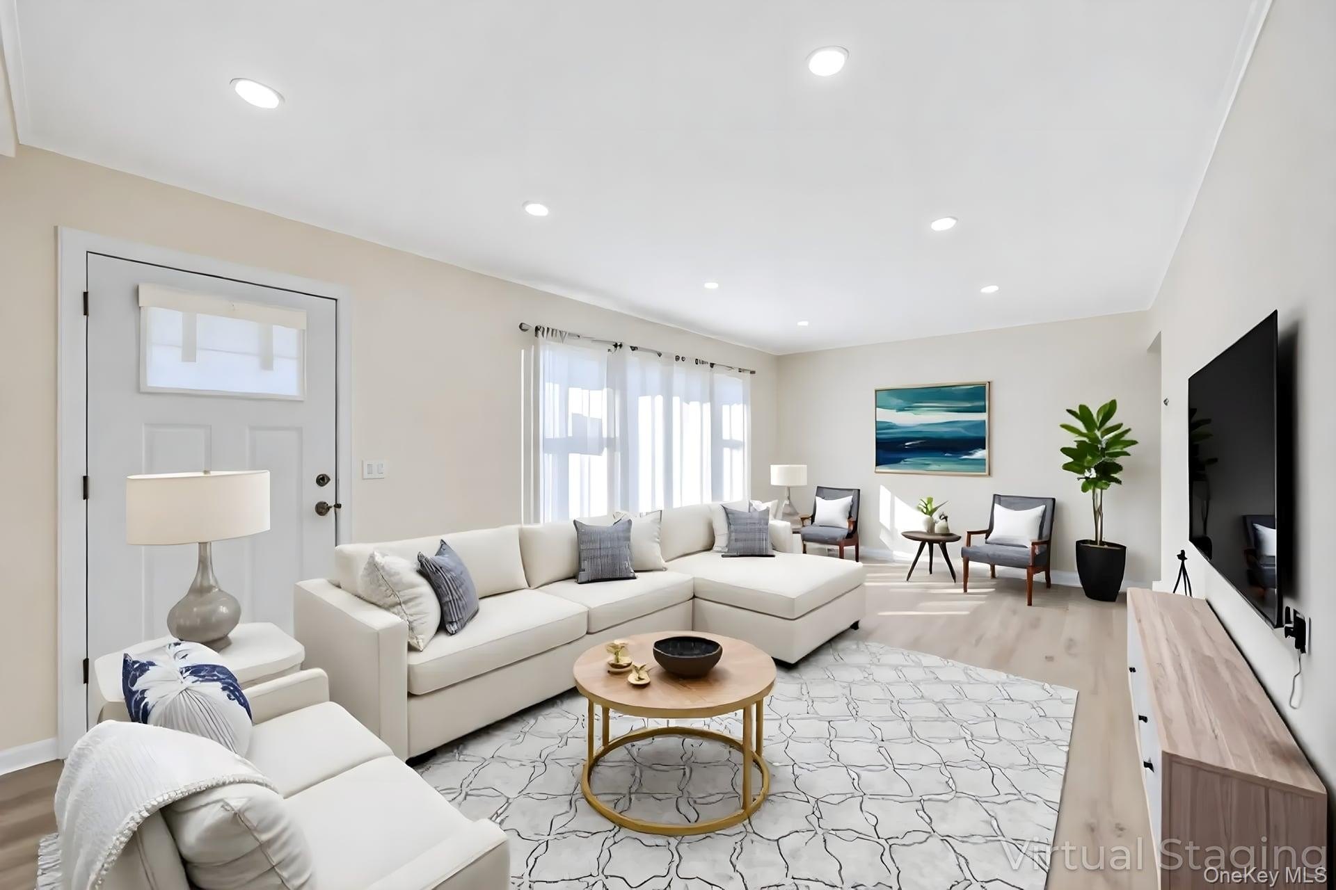 Incredible opportunity to own this magnificent, sprawling ranch perfectly situated mid-block on a beautiful, flat lot. This home offers stunning curb appeal with crisp vinyl siding and a spacious blacktop driveway with plenty of street parking. Step inside to an open floor plan featuring brand new flooring, fresh paint throughout, and recessed lighting. The chef's kitchen showcases white cabinets, quartz countertops, brand new stainless steel appliances, and an abundance of counter and cabinet space. The bright living room and dining area flow seamlessly together, creating the perfect space for entertaining. The large primary suite provides comfort and privacy, while two additional bedrooms are generously sized. The hallway bath features a new vanity and updated subway tile in the tub and shower. Additional highlights include a full unfinished basement with two new windows, a large expanded electrical panel with plenty of open space, updated doors, and new baseboard covers. This all-electric home combines modern upgrades, functionality, and location-an incredible find for today's market.