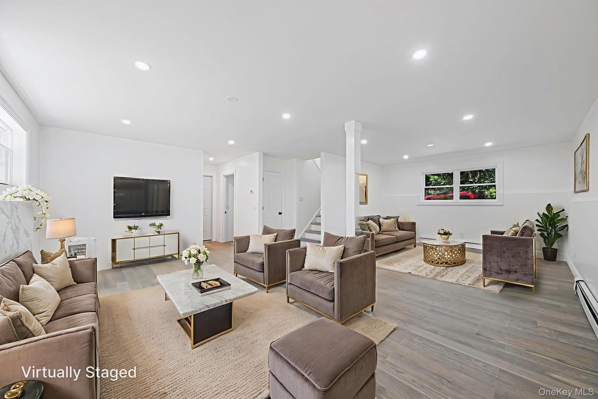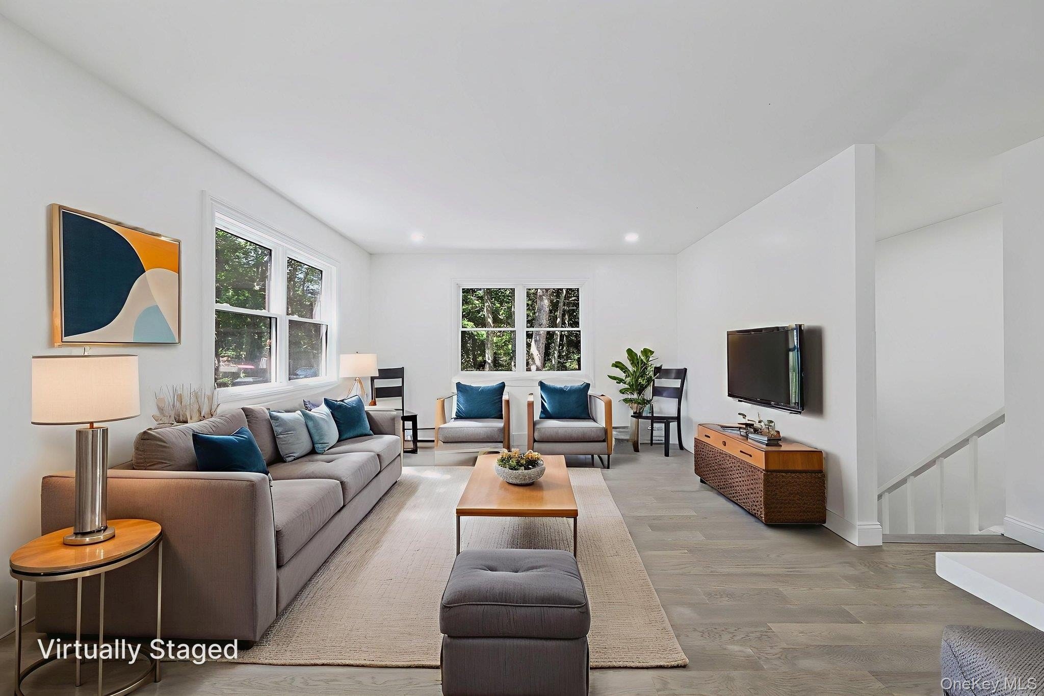 Experience modern living in this newly renovated split-level home, thoughtfully designed for comfort, flexibility, and style. The interior boasts brand-new windows throughout and a contemporary kitchen equipped with sleek stainless steel appliances. The lower level offers a spacious and inviting den, a private bedroom, full bathroom, and laundry area. A separate walk-out entrance adds convenience and offers flexible living potential. Main-level you'll find 2 bedrooms, full bathroom, a bright and airy living room, and an open-concept kitchen and dining area-perfect for everyday living and entertaining. Sliding glass doors lead to an elevated deck overlooking a beautifully large & leveled backyard. (Seedlings have just been placed) At the heart of the outdoor space is a 16' x 32' in-ground pool, featuring brand-new vinyl lining and a surrounding deck that offers generous space for outdoor dining, lounging, and summer gatherings-creating a true backyard oasis. Engineered hardwood throughout brand new roof brand new siding with insulation *New roof *Brand new windows throughout. *Waterproofing for the basement. *LED recessed lighting throughout *Washer dryer coming in next week Potential Mother/Daughter or Rental Income Investment with proper permits. All information is deemed reliable but should be independently verified. A 2.5% Peconic Bay Region Community Preservation Transfer Tax may apply to the purchaser Proof of funds required with all offers.