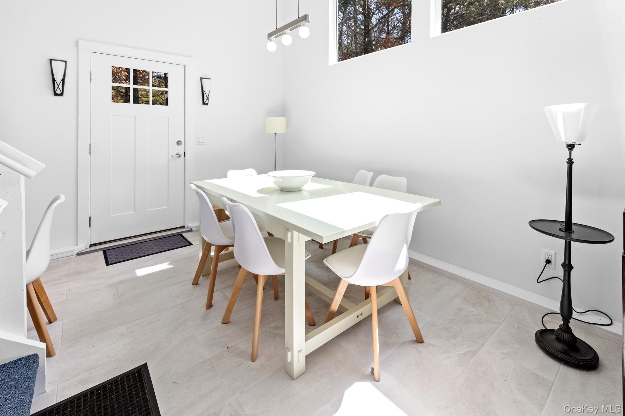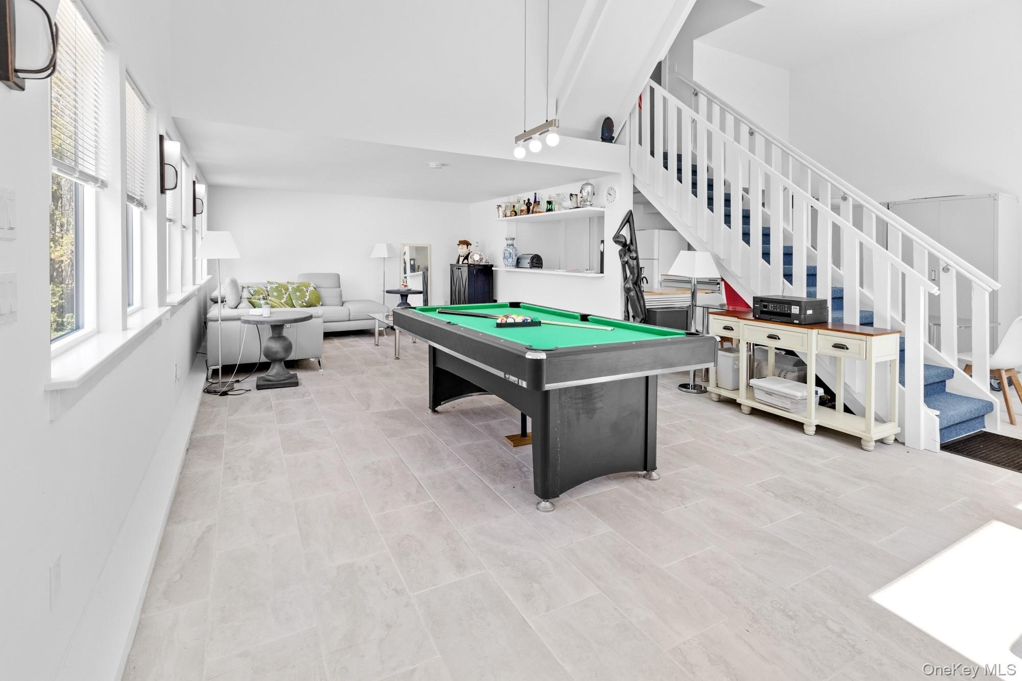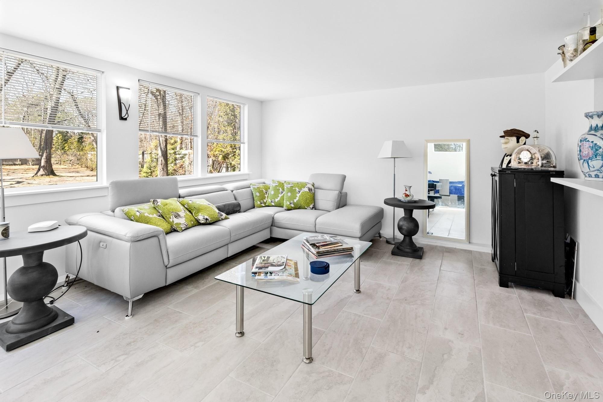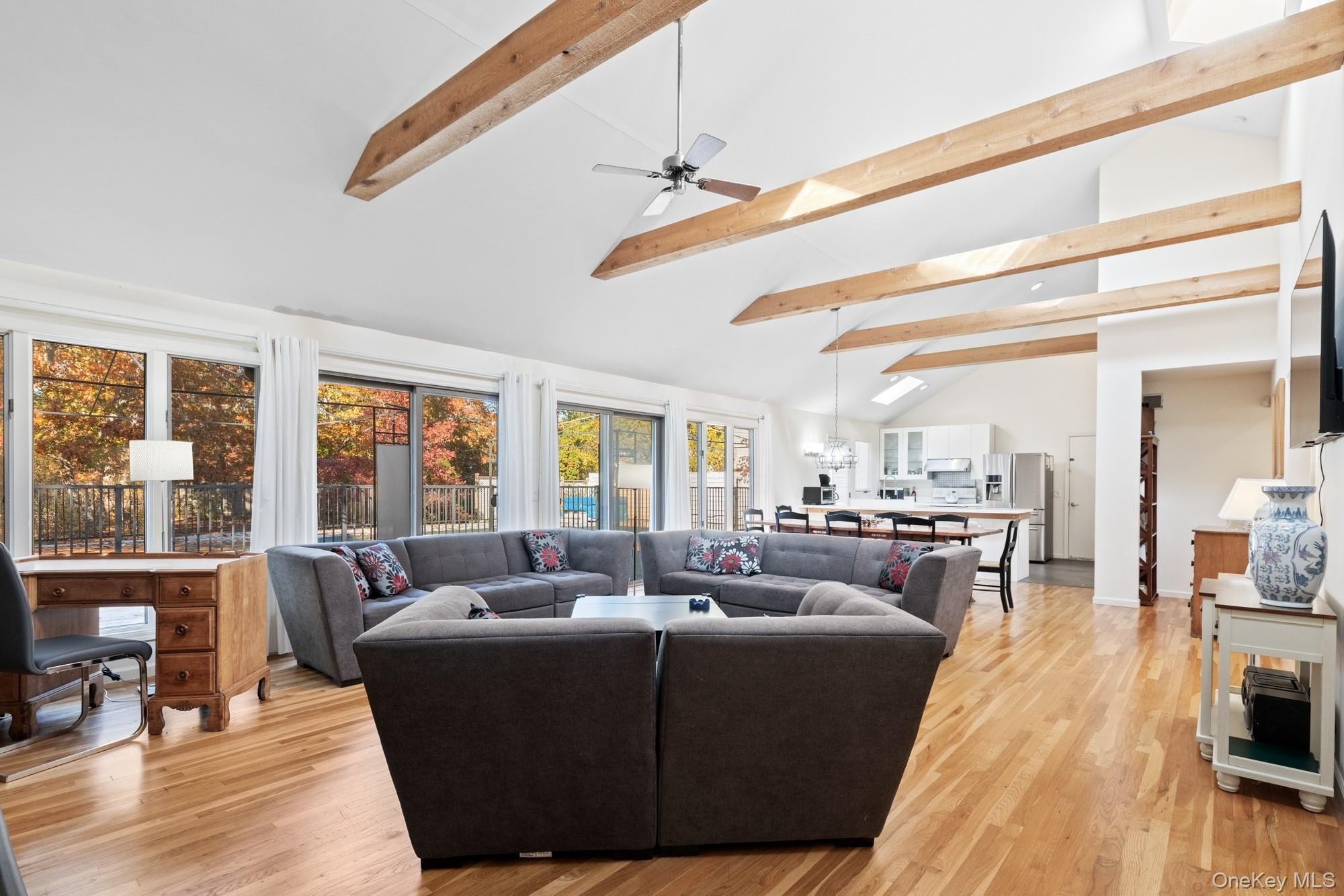 Located at the end of a quiet cul-de-sac, this 4-bedroom, 3-bath home offers one-level living on a private, park-like acre. A 200-foot driveway leads to an open, airy floor plan with 18-foot ceilings and a striking stone fireplace. Glass sliders open to a large deck, heated in-ground pool, and hot tub-ideal for indoor-outdoor entertaining. The kitchen features Samsung appliances and a sleek KOBE range hood, with ample counter space and a large island. Central air with a NEST thermostat ensures year-round comfort. The spacious primary suite includes double exposure and a bathroom with a soaking tub, separate shower, and double-sink vanity. Each of the additional bedrooms enjoys abundant natural light. A legal two-story accessory structure offers incredible flexibility, with two and a half baths, a recreational space on the first floor, a sitting room on the second, and attic storage. It can be used as a pool house, home office, or creative studio. Additional highlights include a two-car garage, city water, outdoor shower, and childproofed heated pool. This home is conveniently located just 3/4 mile from the Westhampton train station, 1/2 mile from the Westhampton Tennis Club, and under two miles to the village center. This private, well-maintained property offers the perfect combination of comfort, luxury, and convenience for both year-round living or a weekend getaway