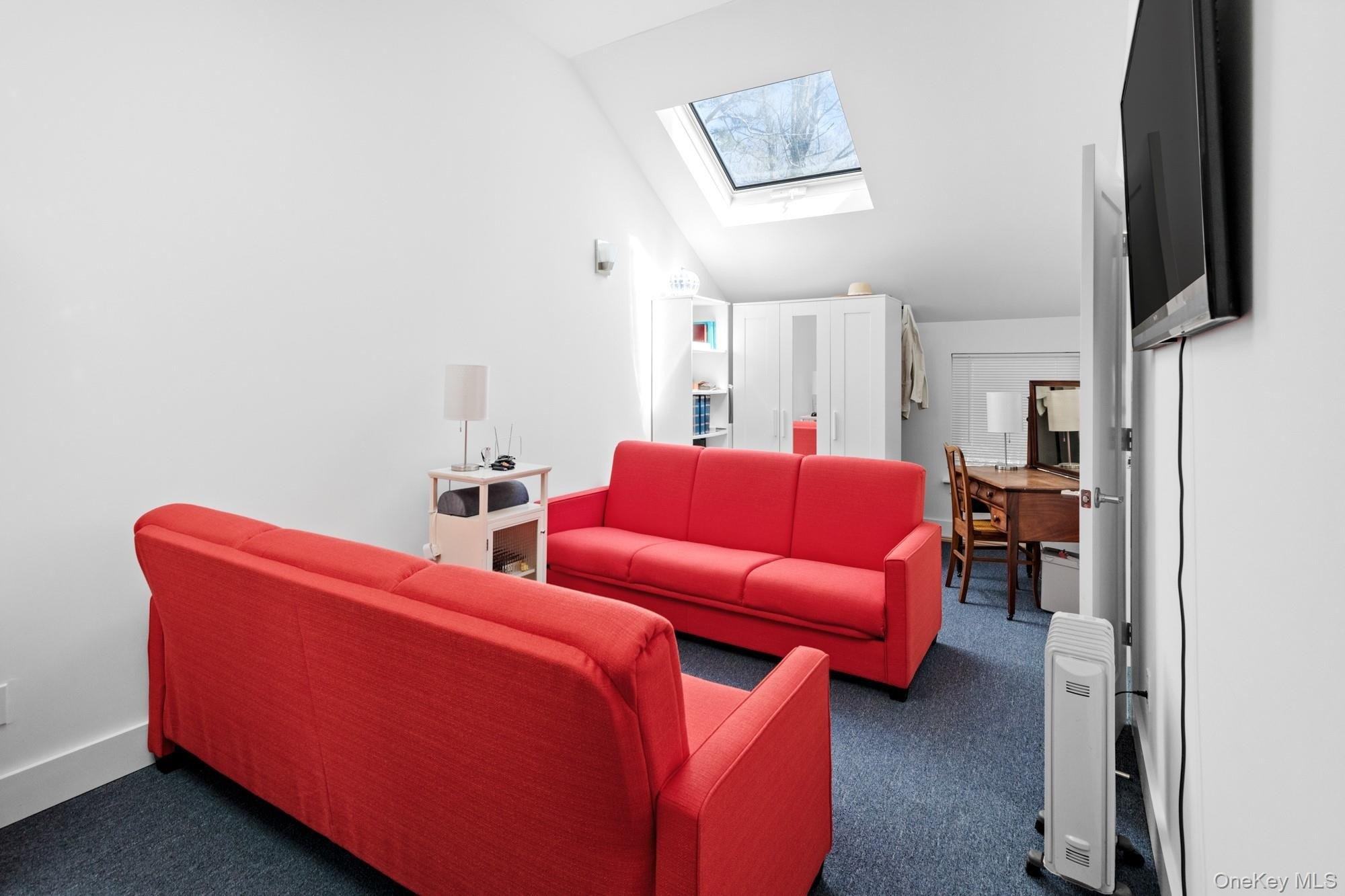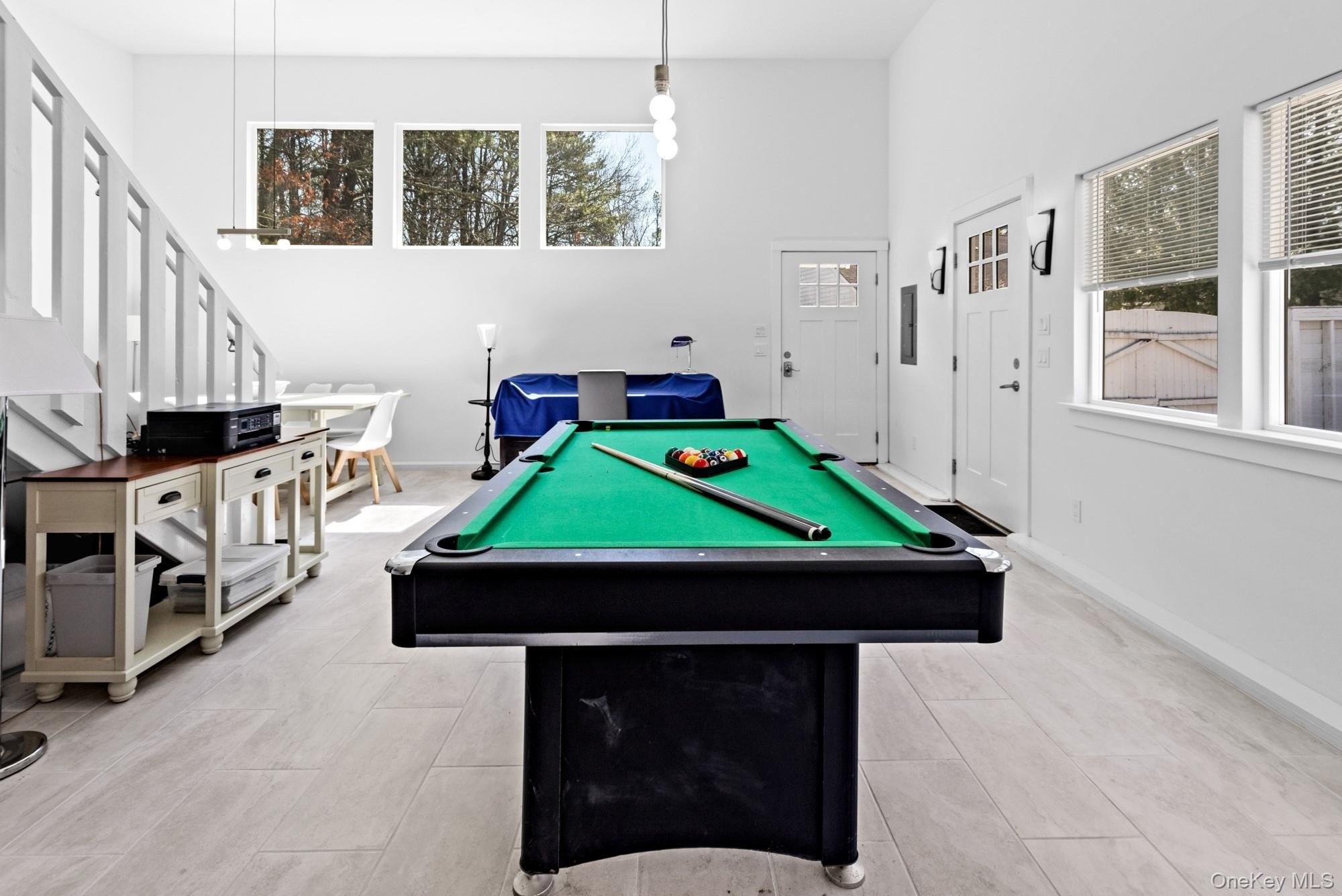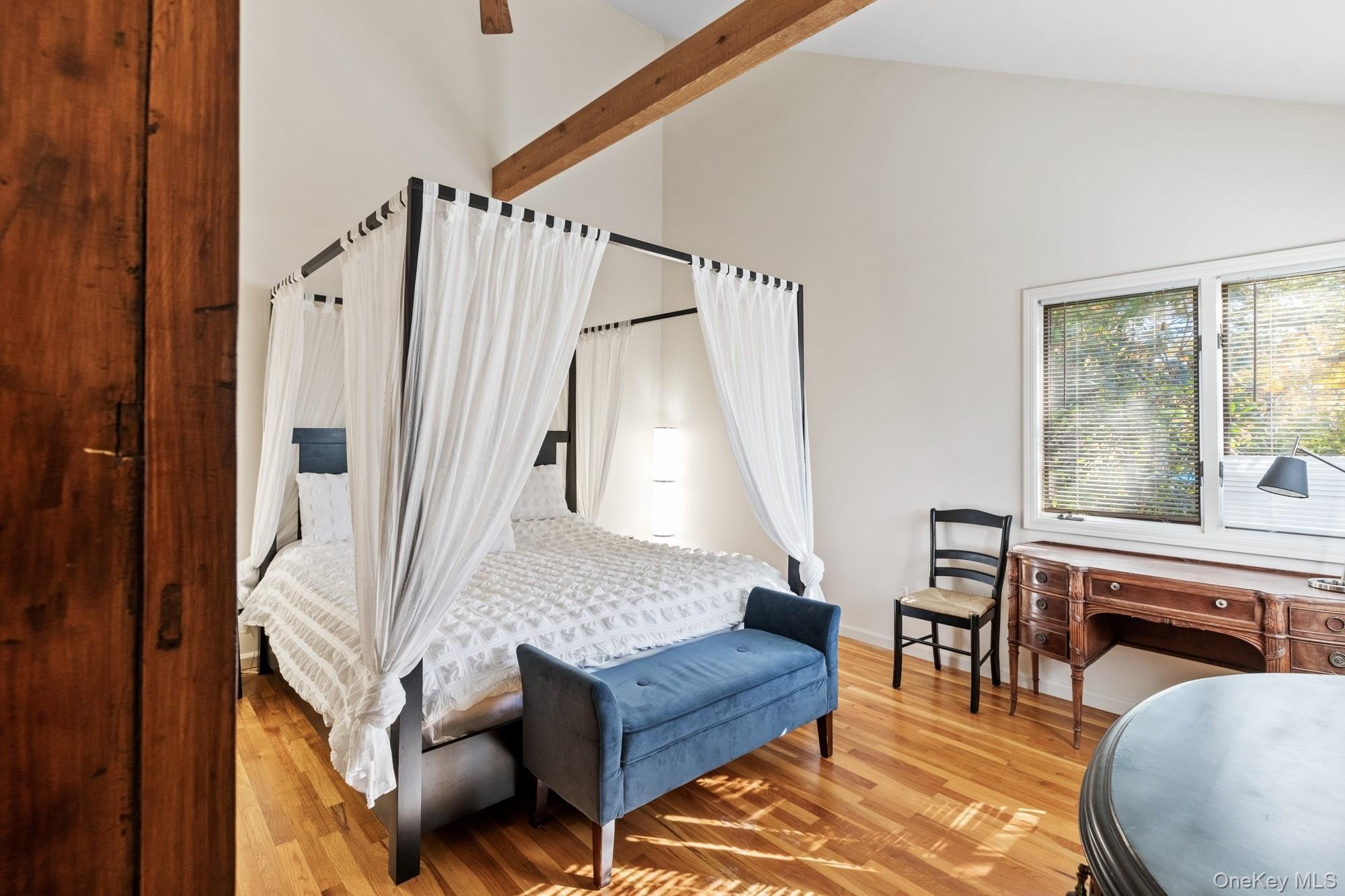 Located at the end of a quiet cul-de-sac, this 4-bedroom, 3-bath home offers one-level living on a private, park-like acre. A 200-foot driveway leads to an open, airy floor plan with 18-foot ceilings and a striking stone fireplace. Glass sliders open to a large deck, heated in-ground pool, and hot tub-ideal for indoor-outdoor entertaining. The kitchen features Samsung appliances and a sleek KOBE range hood, with ample counter space and a large island. Central air with a NEST thermostat ensures year-round comfort. The spacious primary suite includes double exposure and a bathroom with a soaking tub, separate shower, and double-sink vanity. Each of the additional bedrooms enjoys abundant natural light. A legal two-story accessory structure offers incredible flexibility, with two and a half baths, a recreational space on the first floor, a sitting room on the second, and attic storage. It can be used as a pool house, home office, or creative studio. Additional highlights include a two-car garage, city water, outdoor shower, and childproofed heated pool. This home is conveniently located just 3/4 mile from the Westhampton train station, 1/2 mile from the Westhampton Tennis Club, and under two miles to the village center. This private, well-maintained property offers the perfect combination of comfort, luxury, and convenience for both year-round living or a weekend getaway
