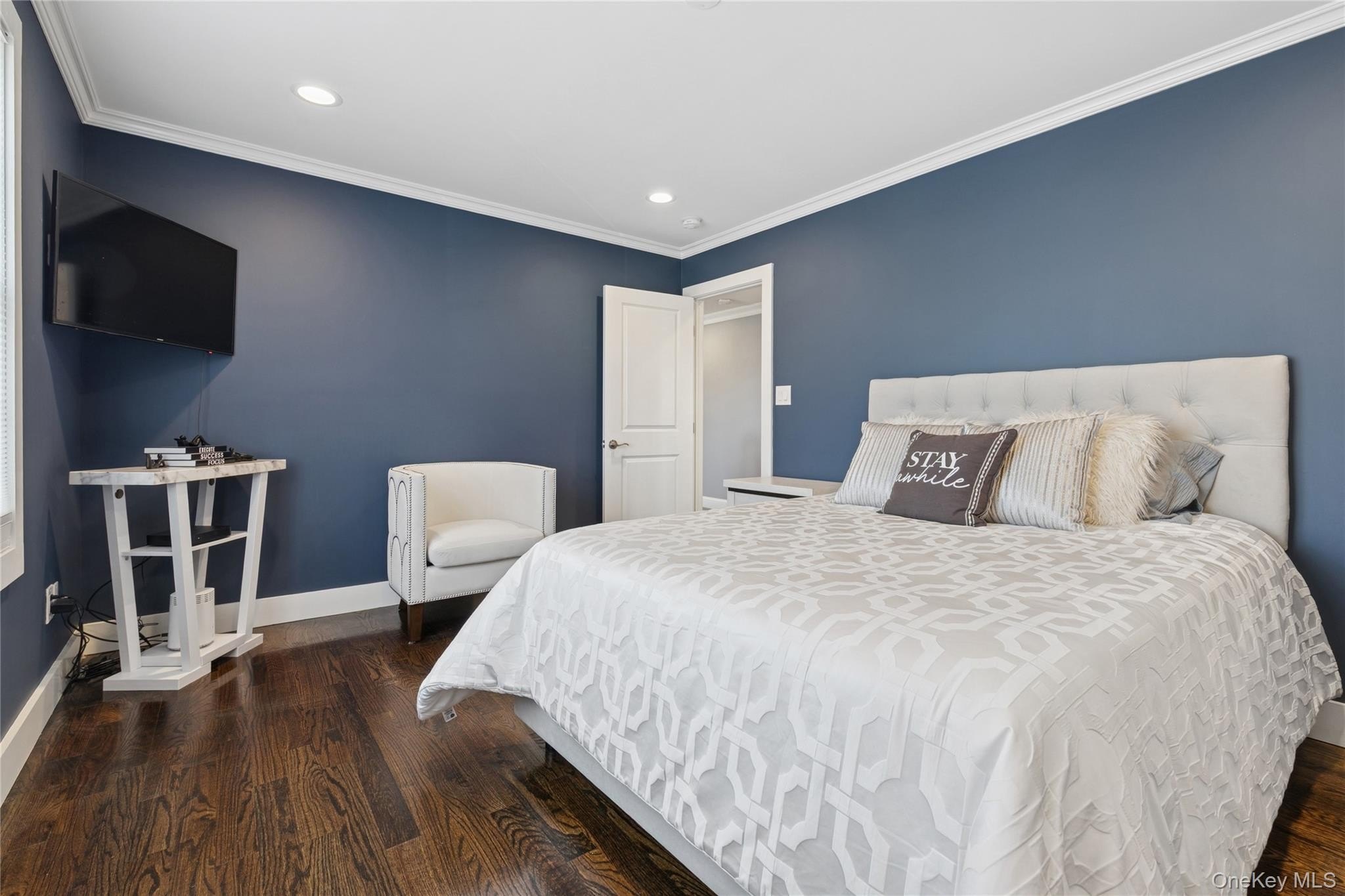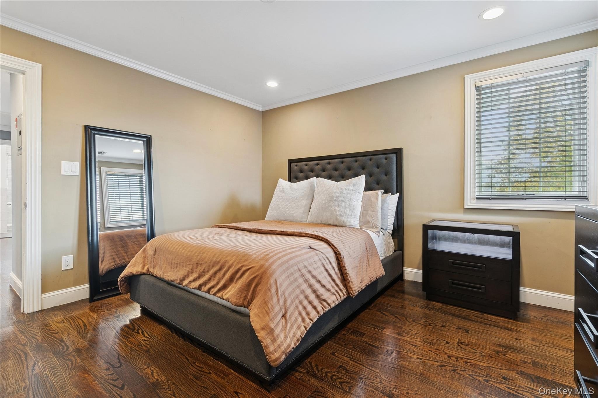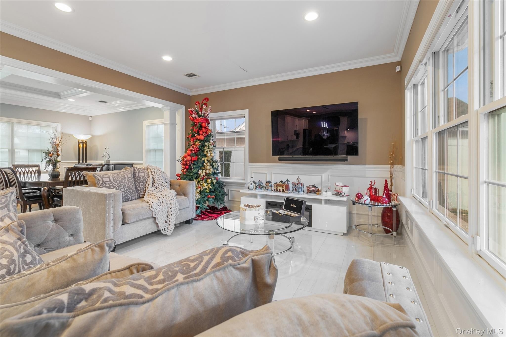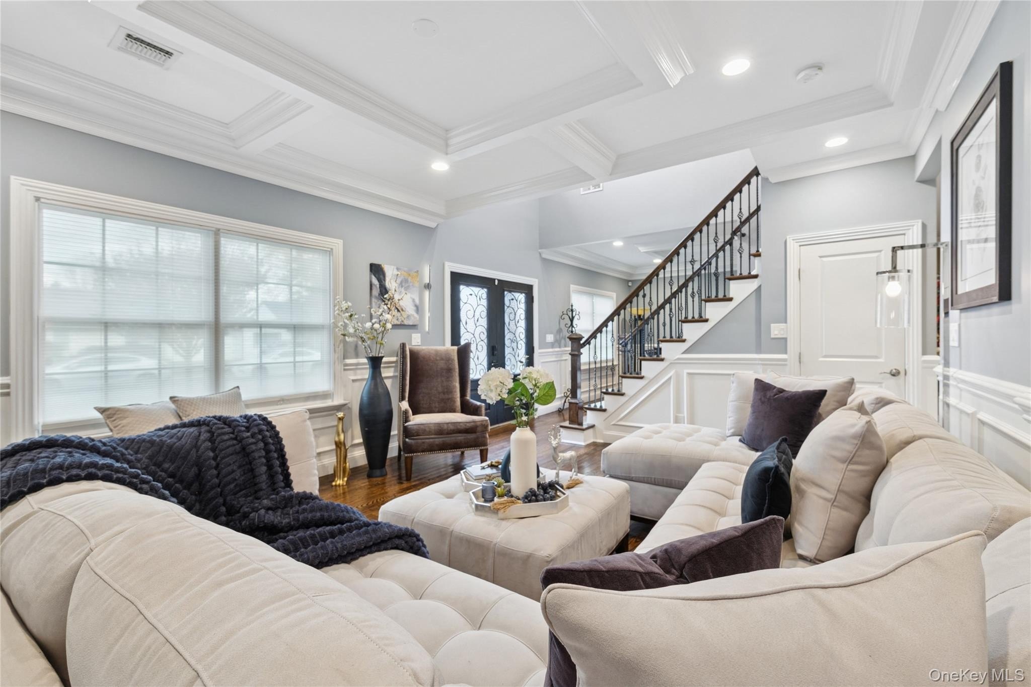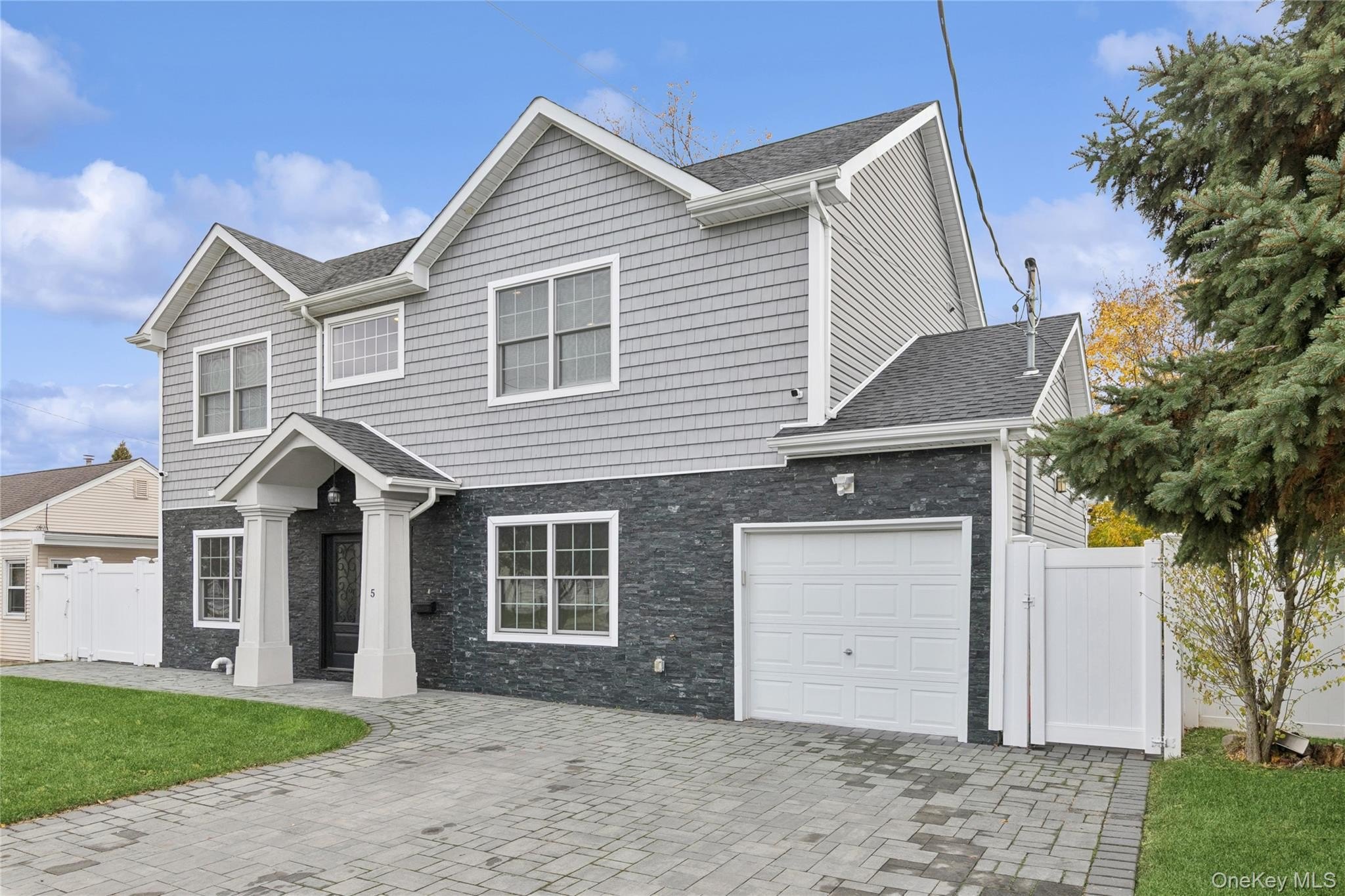 Welcome to a rare luxury residence in Plainview-one of the few newer-construction homes in the area. Designed with modern elegance and everyday comfort in mind, this home offers bright open spaces, premium finishes, and exceptional functionality. You're greeted by a dramatic two-story entry with custom millwork, wrought-iron double doors, and rich hardwood floors. The first floor features impressive 9-foot ceilings, enhancing the open feel and adding volume and light throughout the main living areas. The chef-inspired kitchen showcases Cafe stainless steel appliances, beautiful cabinetry, generous counter space, and a layout perfect for both everyday cooking and elevated entertaining. Seamless flow connects the kitchen, dining, and living areas, making this home ideal for gatherings. Upstairs, you'll find four spacious bedrooms, including two rooms with walk-in closets and custom organizers. One bedroom has been transformed into an exquisite designer dressing room; sellers are open to discussing converting it back to a traditional bedroom if preferred. Enjoy year-round comfort with central air conditioning, forced-air heating, and a high-efficiency Navien tankless hot-water system providing continuous hot water and reduced utility costs. The private, fully fenced backyard offers professional landscaping, inground sprinklers, and an expansive paver patio supported by elegant architectural columns-perfect for outdoor dining, relaxing, and entertaining. A detached shed is included as a gift. Enhanced curb appeal, a paver driveway, and beautifully maintained grounds complete this move-in-ready home located near shops, highways, parks, and the award-winning Plainview-Old Bethpage School District.