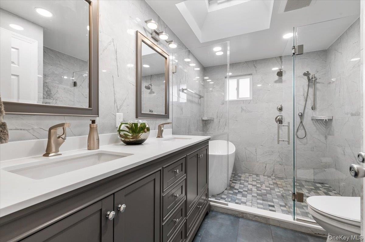 Welcome to this spacious and beautifully updated Hi-Ranch offering 5 bedrooms, 2 full bathrooms, and scenic water views in the heart of Bellmore. The main level showcases an updated kitchen with sleek quartz countertops, stainless steel appliances, a reverse osmosis water filtration system, and a bright skylight that fills the space with natural light. Directly off the kitchen, the dining room and living room offer an effortless, open flow that's perfect for both everyday comfort and entertaining. A cozy wood-burning fireplace anchors the living room, while the bay window brings in abundant natural sunlight. Sliders from the dining room lead to the elevated deck, extending your living space outdoors with ease. A newly renovated full bathroom on this main level is designed for luxury, complete with radiant heated floors, a bidet, a large glass-enclosed shower/tub, and its own skylight for an airy, spa-like ambiance. Three generous bedrooms, including the primary, offer comfort and flexibility. The primary bedroom features a large walk-in closet and private slider access to the deck making it ideal for enjoying peaceful mornings or evening breezes. The lower level of the home enhances your living options with two additional bedrooms, excellent storage, and a spacious den/family room perfect for hosting guests, relaxing movie nights, or a recreation space tailored to your needs. Step outside and enjoy the best of outdoor living. Multiple access points to the upper deck allow you to take in the gorgeous water views, while the yard below provides space for entertaining, gardening, and play. Additional updates include newer windows, recently upgraded electric, hot water heater, washer & dryer and more all providing comfort and peace of mind. This home delivers comfort, style, and the relaxed charm of Bellmore waterfront living. Move right in and start enjoying this exceptional lifestyle today!