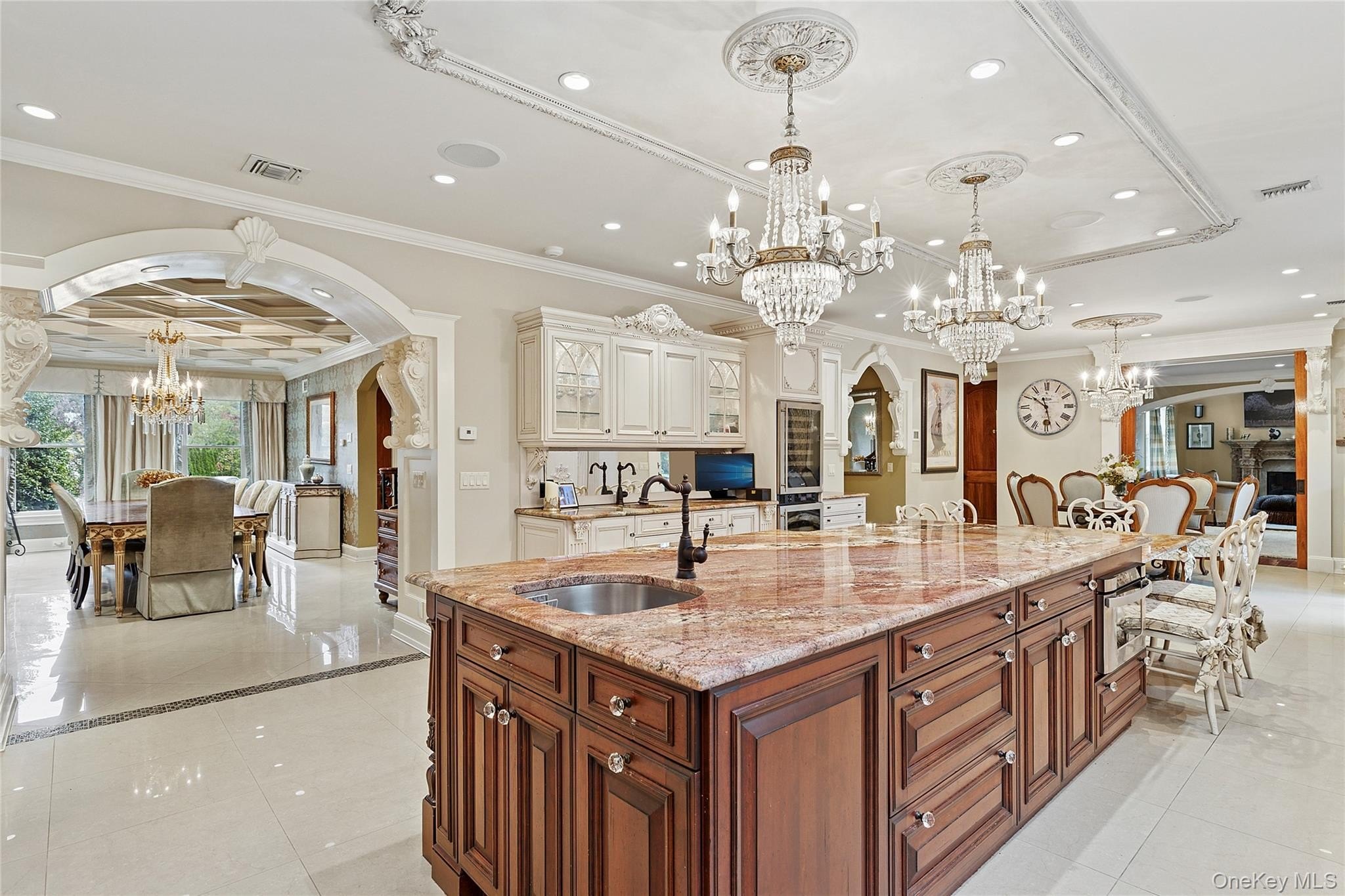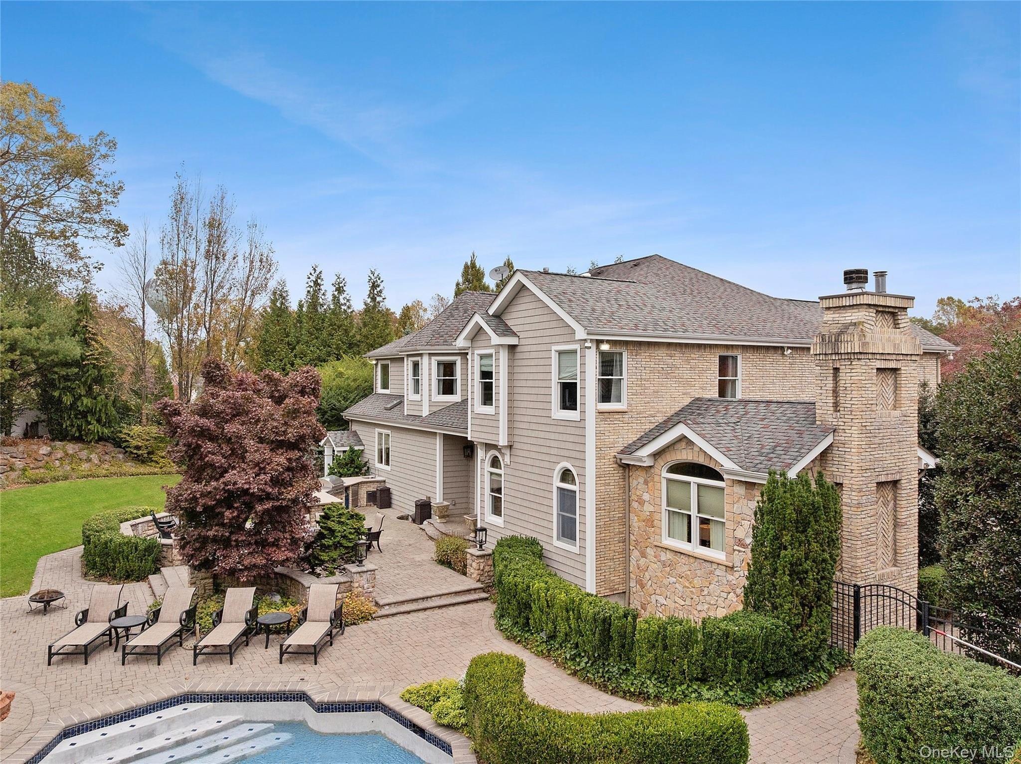 Located on a quiet cul-de-sac in Oyster Bay, this stately 5-bedroom, 7-bathroom home offers over 6,800 square feet of refined living on a beautifully landscaped half-acre property. Designed for everyday luxury, the home blends timeless craftsmanship with high-end amenities. A dramatic two-story foyer with a 16-foot wrought iron front door and motorized chandelier sets the tone. Inside, Brazilian teak floors, custom mahogany finishes, and detailed trim work create a warm, sophisticated atmosphere. The layout includes both a formal main staircase and a secondary back staircase for added function. The heart of the home is a chef's kitchen featuring a 14-foot granite island, Sub-Zero fridge and freezer, Decor range, double ovens, two dishwashers, three sinks, a wet bar, wine fridge, microwave drawer and Scotsman ice maker. The sliders open to a stunning backyard retreat. Living spaces include formal and casual rooms with three gas fireplaces, custom ceilings, and full wiring for sound and security systems. The second floor offers four spacious bedrooms, all en-suite, including a primary suite with a skylit walk-in closet and spa-style bath. The finished basement, with outside access and egress windows, includes a second kitchen, living room with a fireplace, den, guest suite/office, full bath, utility room, and a climate-controlled wine cellar with brickwork. Outside, the fully fenced yard is a true oasis-complete with a heated saltwater gunite pool with a waterfall, slide and swim-out. The full outdoor kitchen is equipped with a grill, refrigerators, sink, and ice maker. Additional features include 15-zone radiant gas heat, central air, high-efficiency air filtration, recessed lighting throughout, skylights, and extensive trim and ceiling detail. Plus a 15-zone irrigation system and a Generac generator. With unmatched style, space, and privacy-just minutes from beaches, schools, parks, golf course, restaurants, shopping, transportation, highways -this is North Shore living.