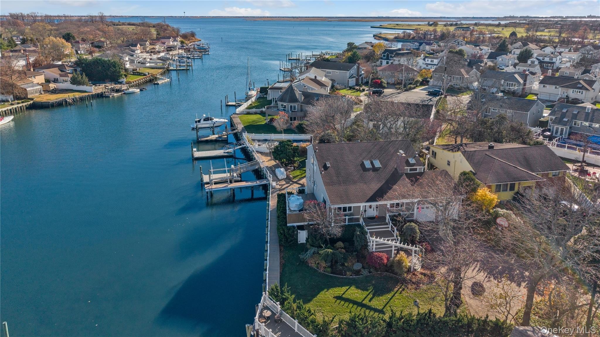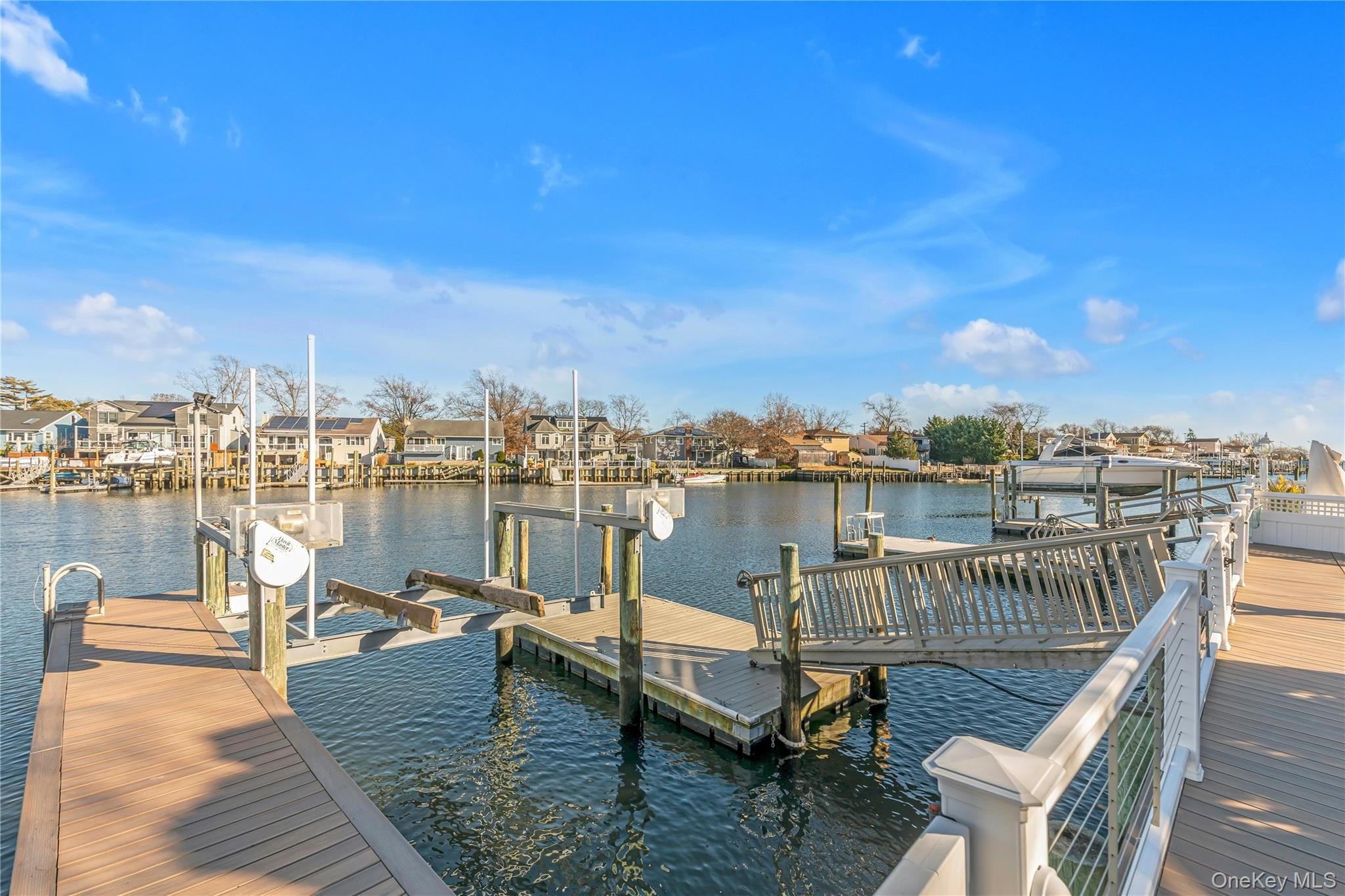 This premier waterfront residence sits secluded at the very end of a beautifully tree lined street nestled in the Estates section of Oceanside.The property is situated on a generous quarter-acre lot with over 160 feet of canal frontage. The home features four bedrooms and 2.5 baths, including a primary bedroom with an en suite bathroom, walk in closet, and a south-facing balcony overlooking the wide canal leading to Parson's creek and the Middle Bay. Hardwood floors span the interior, complemented by two wood-burning fireplaces that add warmth and character. As you walk in the front door, you're greeted by abundant natural light from two skylights set high in the 15-foot ceilings, creating a bright, airy entry. An indoor pool, which is heated and cedar-lined, make it a truly one of a kind property- perfect for year-round swimming and entertaining. The pool connects to a back patio with sliders, creating seamless flow for hosting guests in any season. The second floor boasts a balcony overlooking the living room, and every room benefits from abundant natural light through skylights throughout the home. The built-in gas stove top, granite countertops, grill, and sink on the secondary deck provide additional outdoor cooking and entertaining options. The property includes a two-car garage and substantial expansion potential. Outdoor living is highlighted by a private backyard framed by mature trees-an ideal setting for relaxation and gatherings by the water. Waterfront amenities include a boat lift and two docks, with a bulkhead that was replaced after Sandy, ensuring sturdy waterfront infrastructure. The home has been meticulously cared for and maintained, reflecting more than forty years of attentive ownership. The backyard is tranquil and perfect for entertaining, with serene views of the water and a wider canal segment that offers straightforward access straight out to the Middle Bay. This residence combines timeless charm with modern conveniences in a sought-after Oceanside location, offering privacy, convenience, and a lifestyle focused on coastal living.