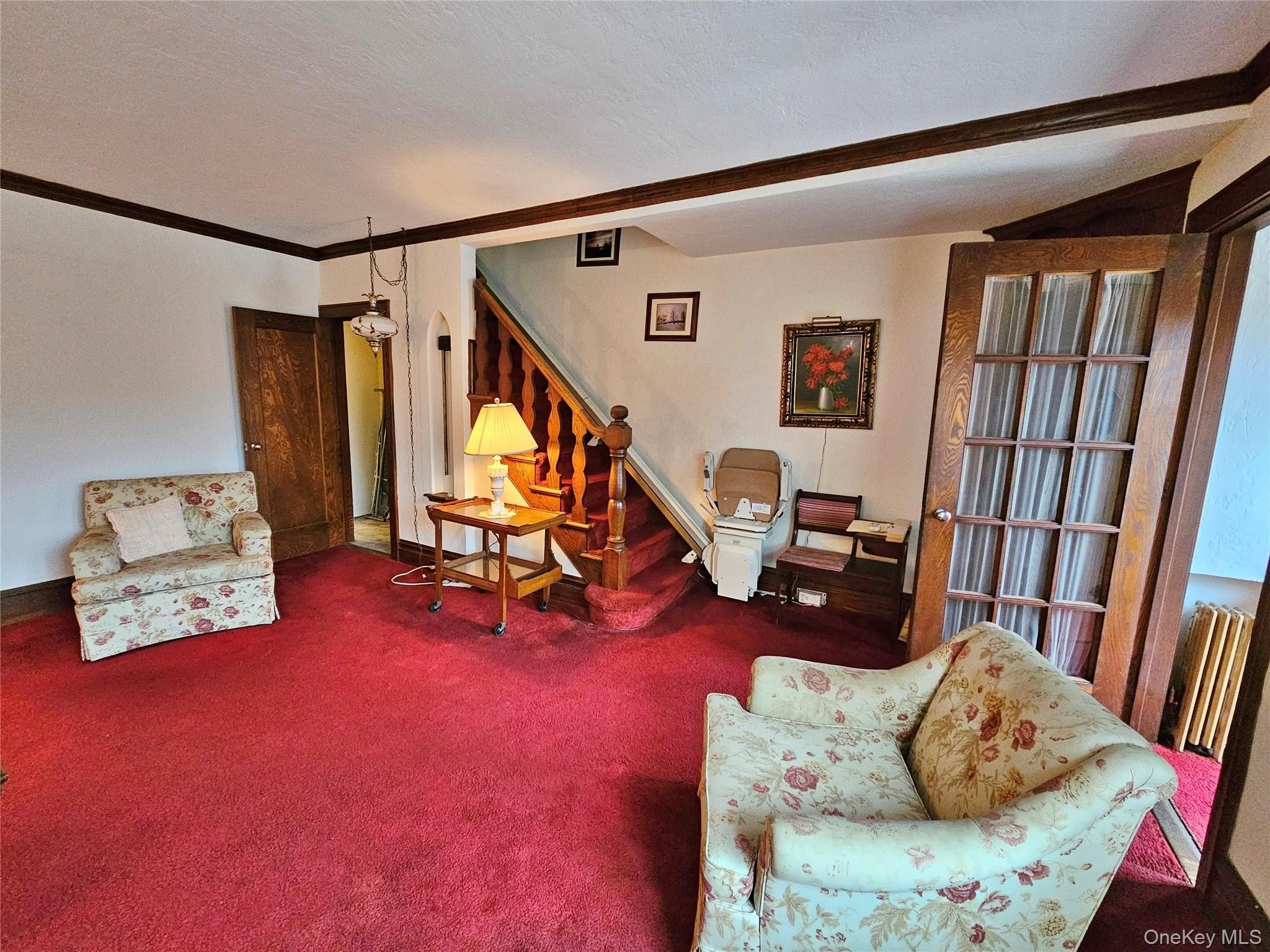 Don't miss out on this One Family Brick Tudor home with a welcoming front entry and patio area. Enter a formal living room with a wood-burning fireplace, a separate formal dining room, and a spacious kitchen-keeping original hardwood floors, wainscoting, built-ins, or stained-glass windows where possible. 2nd floor has 3 nice size bedrooms and a full bathroom, retaining original moldings and hardwood flooring. Basement is finished space with laundry, storage, and recreational space/family room with half a bath. This beautiful home also boasts a private garage and driveway, along with a private backyard for entertaining. Located just moments away from The Shops at Atlas Park, for great retail, dining amenities. Excellent transportation with nearby bus lines, Q47, Q54, Q55 and M train approximately 1 mile away.