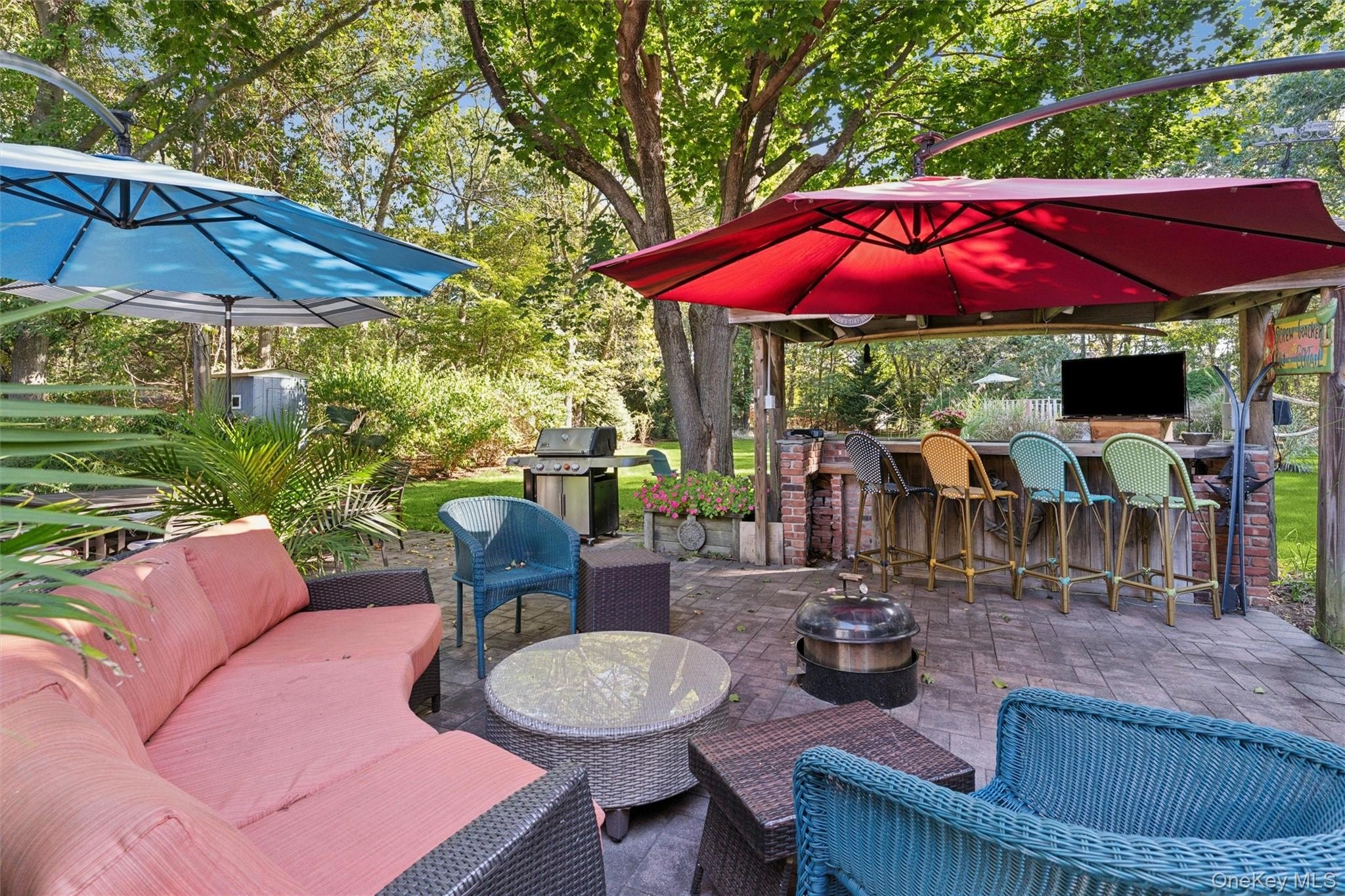 Tucked away on a private one-acre parcel, this inviting 3-bedroom, 1.5-bath residence offers the perfect blend of comfort, charm, and outdoor living. The home's thoughtful layout welcomes you with sun-filled rooms and an easy flow that's ideal for both everyday living and hosting. Step outside, and you'll discover what truly sets this property apart. The expansive yard offers endless possibilities from gardening to games on the lawn. Entertain in style on the spacious patio, complete with a fully equipped outdoor bar, perfect for casual get-togethers, celebrations, or simply unwinding at the end of the day. Here, privacy and tranquility meet convenience. Just minutes from local shops, dining, schools, and the beautiful South Shore beaches, this home delivers the best of both worlds a peaceful retreat with easy access to everything Center Moriches has to offer. Whether you're searching for your first home, a summer getaway, or a place to put down roots.