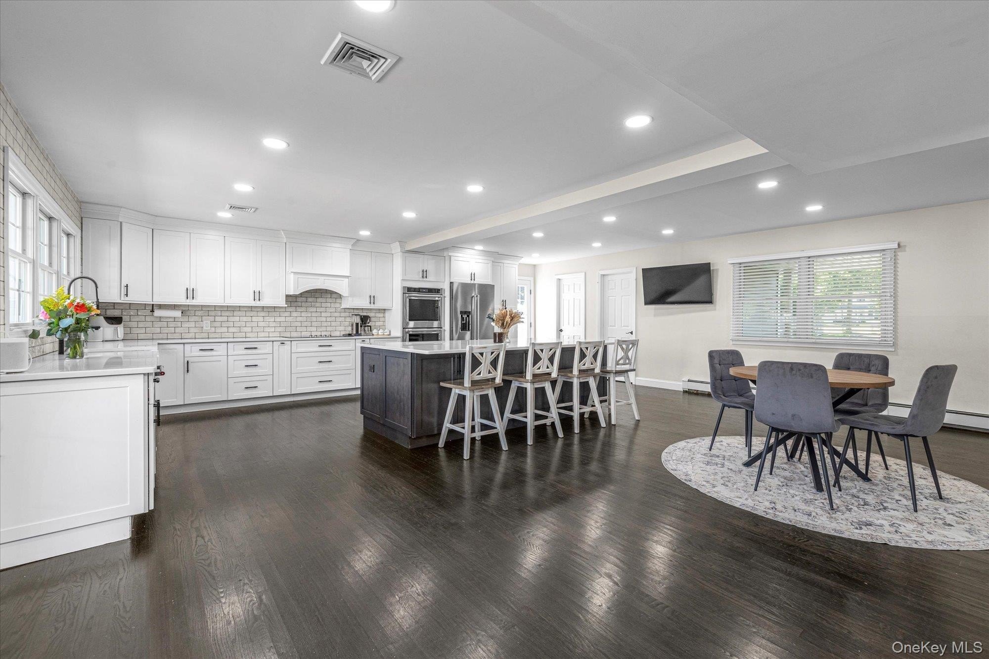 Welcome to this beautiful 4-bedroom, 2-bath Colonial offering the perfect blend of classic design and modern living. Enter inside to find hardwood floors throughout, a formal dining room with a cozy wood-burning fireplace, and an inviting living room. The large open-concept kitchen is designed for both everyday living and entertaining, featuring a center island, built-in wine fridge and microwave, double ovens, 5-burner stove, stainless steel appliances, and plenty of cabinet space for storage. A spacious eat-in area adds convenience and charm. The primary suite has its own ensuite bath, walk-in closet, and laundry for added ease. Additional bedrooms are filled with natural light. Other highlights include a full basement, pull-down attic for storage, and a 3-car driveway. Outside, enjoy a prime location close to public transportation, golf courses, restaurants, and shopping. This home is the perfect mix of comfort, convenience, and style-ready for its next chapter.