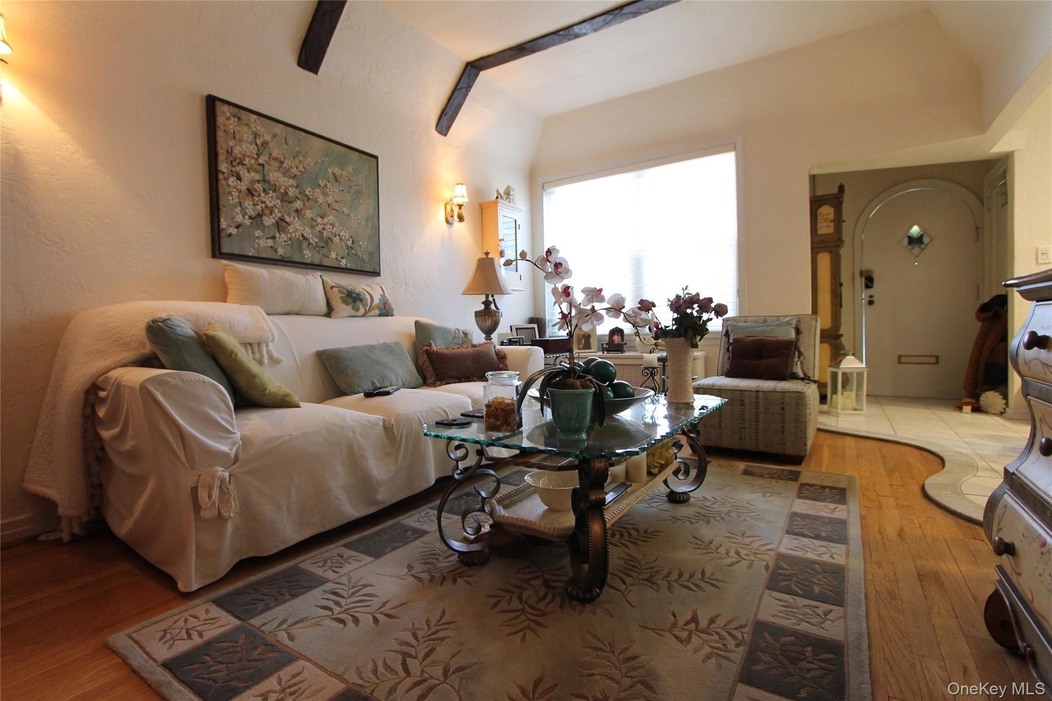This Tudor style ranch home offers an inviting covered front porch, an entrance foyer with coat closet, a spacious living room with a beamed cathedral ceiling, open dining area, galley kitchen with young stainless steel appliances, full bathroom and two comfortable bedrooms! The basement level offers additional living space with high ceilings, a second full bathroom, storage space, laundry room and walk-out access to the rear outdoor space! Extra features include young wall unit air conditioners, high hat lighting, young gas heating system, young water heater, patio pavers and privacy fencing out back, a one car garage and parking for two additional cars!