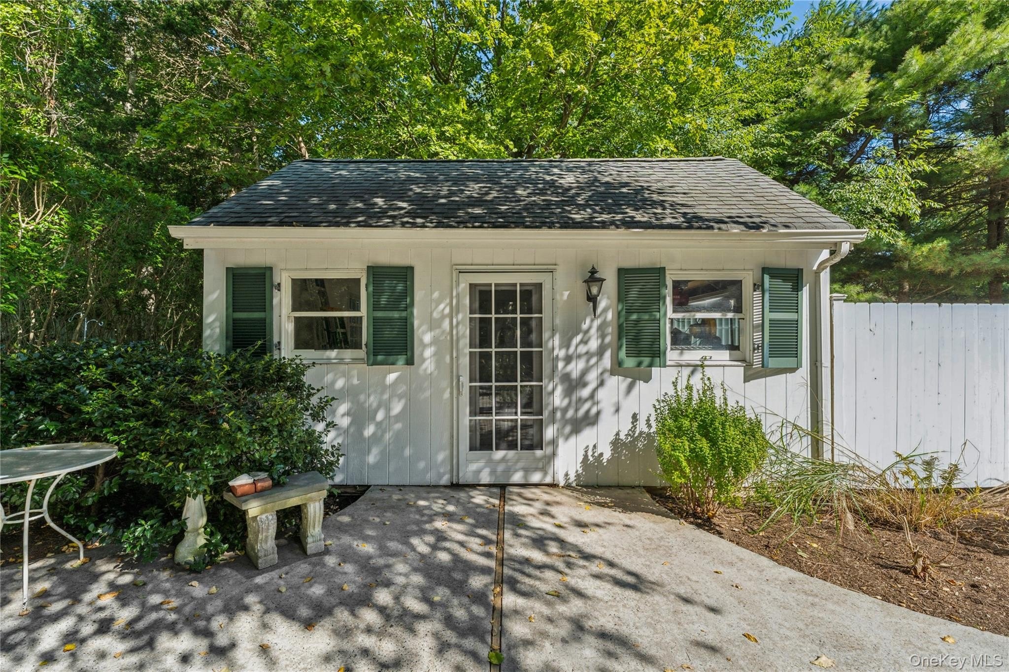 Welcome to 29D Squiretown Road, a charming residence nestled in the serene enclave of Hampton Bays, NY. This exquisite two-bedroom,two-bathroom ranch-style home offers a unique blend of comfort and modern living, perfectly positioned adjacent to the tranquil woodlands of Good Ground Park. As you approach this hidden gem, you'll appreciate the privacy afforded by its secluded location. The home is equipped with solar panels, ready for connection to PSEG, providing an eco-friendly energy solution. Step inside to discover a spacious Great Room, featuring a large fireplace that serves as the heart of the home, ideal for cozy gatherings. The adjoining dining area and expansive kitchen, complete with a new gas cooktop, offer a seamless flow for entertaining and everyday living. The recently renovated bathroom and newly carpeted bedrooms provide a fresh and inviting atmosphere. Outside, the property truly shines with its Gunite pool, which has been recently resurfaced and enhanced with a new saltwater system. A pool house/garage building, complemented by a pergola, offers a perfect space for outdoor relaxation and entertainment. The rear yard presents a park-like setting, boasting mature landscaping and an oversized patio, ideal for enjoying the natural beauty of the surroundings. This move-in-ready home is a rare find, offering both tranquility and convenience in one of Hampton Bays' most desirable locations. Don't miss the opportunity to make 29D Squiretown Road your new home, where comfort meets elegance in a picturesque setting.