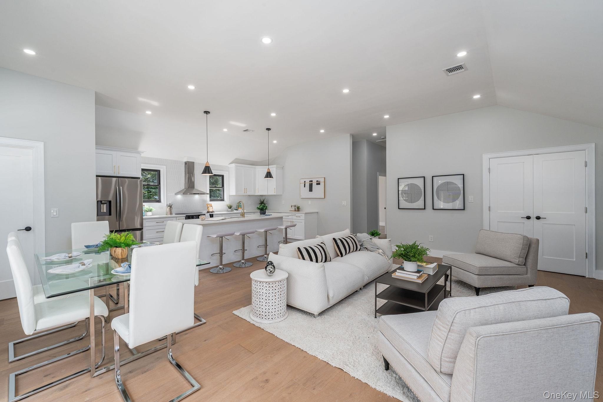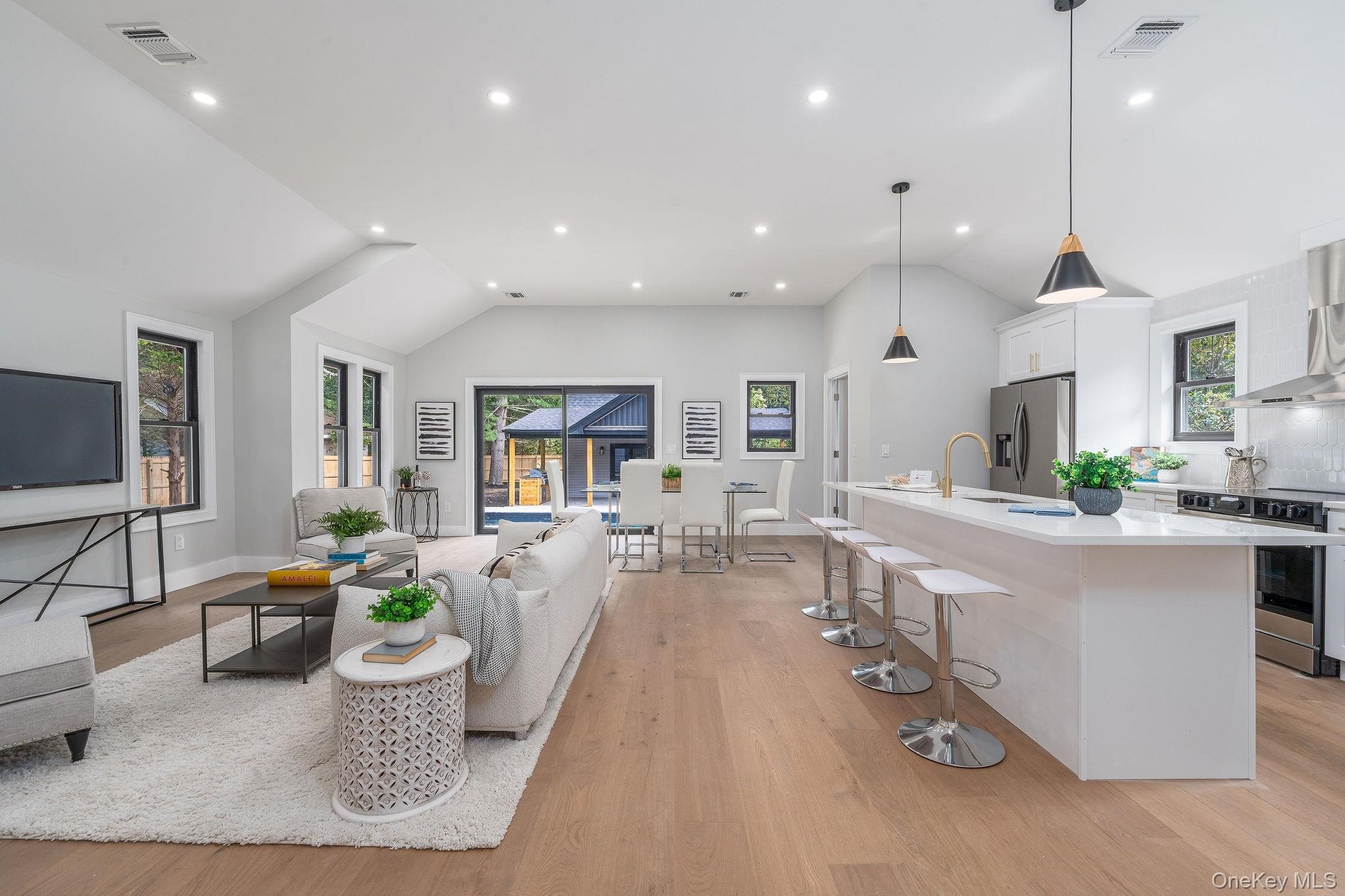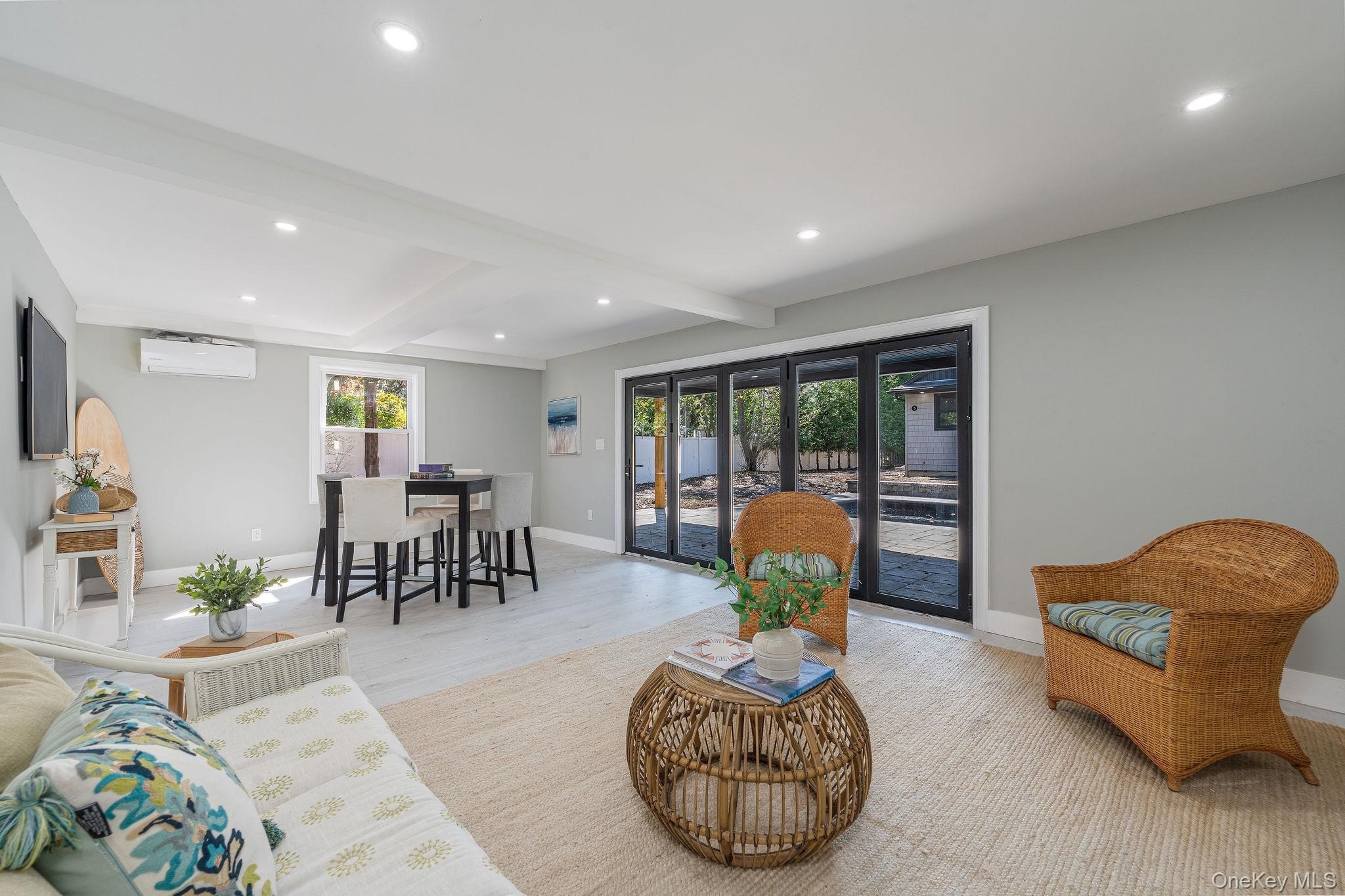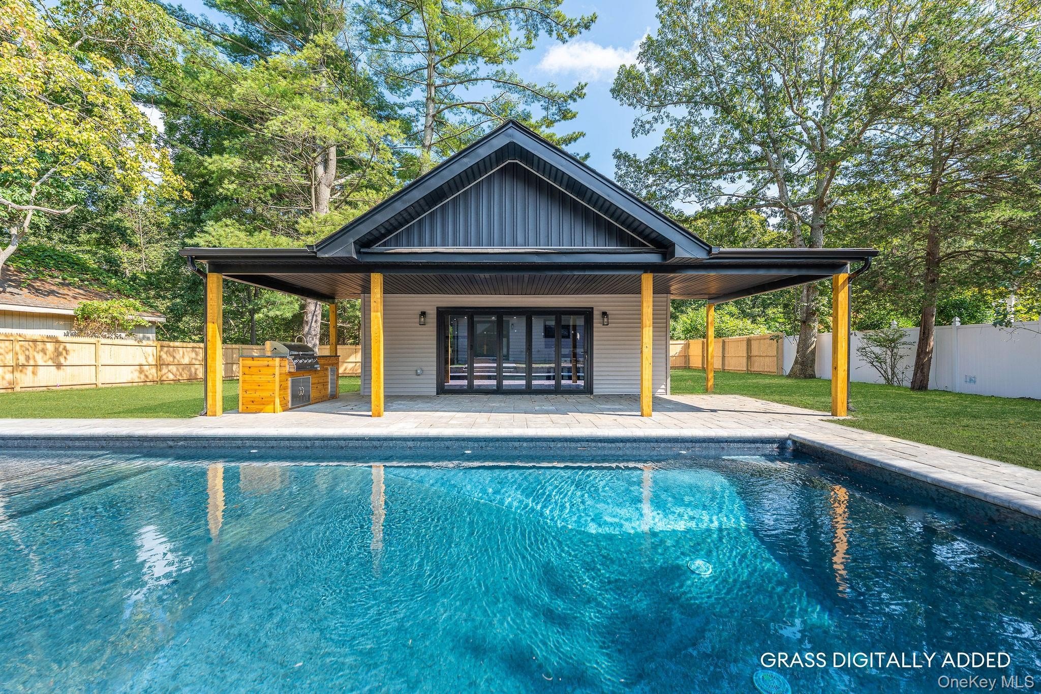 This fully renovated 3-bedroom, 2.5-bath home offers 1,400 sq ft of modern living with soaring 10' vaulted ceilings throughout. Complete renovation in 2025. The primary suite features a walk-in closet and marble-tiled bath. A new high-efficiency Bosch electric central air and heating system, smart Alexa-ready lighting, sprinkler system, and all new WaterSense appliances ensure comfort and convenience. The kitchen includes a wine fridge, while a separate laundry room adds functionality. Step outside to a resort-style backyard with a brand-new 14'x36' heated saltwater pool with in-pool sun deck, Hayward electric heater, outdoor kitchen, new paver patio with full drainage, and built-in enclosed shed. The pool house offers 508 finished sq ft, plus an additional 353 sq ft across two rooms ready to be completed with proper permits, featuring its own water heater and mini split AC. All new windows, siding, roof, flooring and more! Additional upgrades include a new IA septic system sized for expansion, two dry wells, a new well tank, and everything designed for efficiency and low maintenance