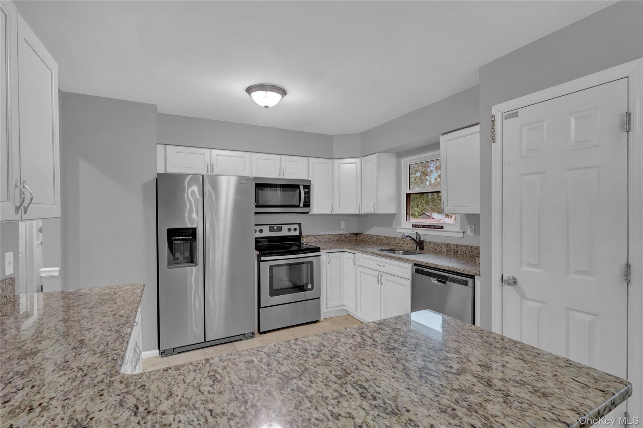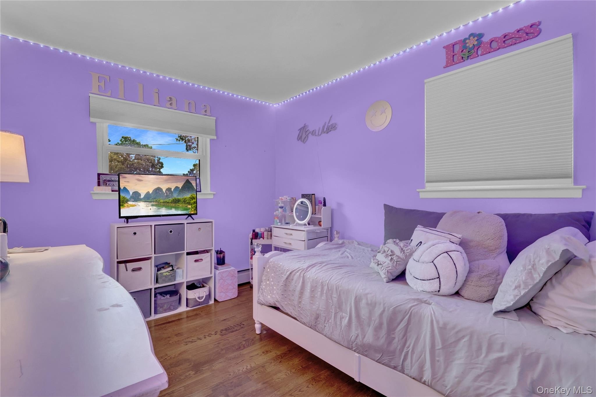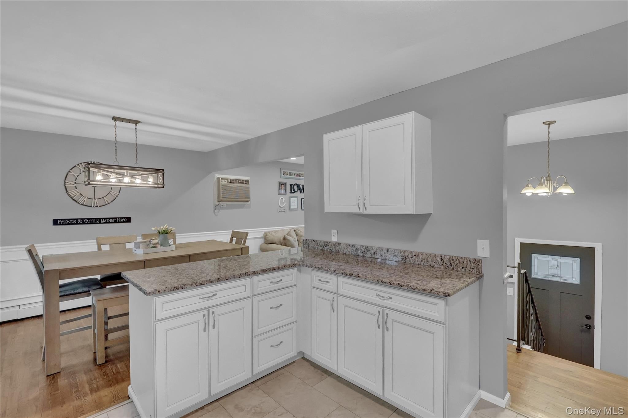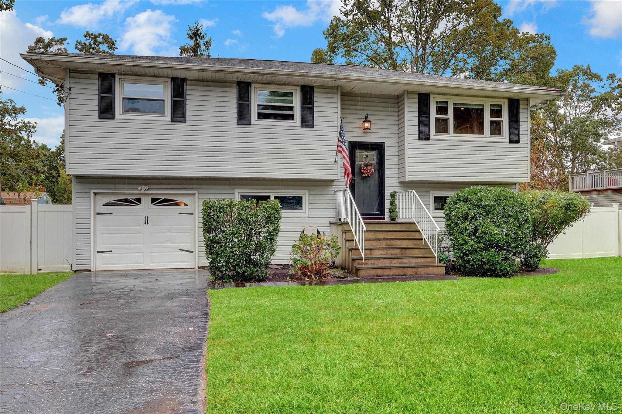 Welcome to this charming and spacious 4-bedroom, 2-bath Hi-Ranch located in the Eastport-South Manor School District. Perfectly situated on a generous lot, this home features beautiful landscaping, a brand-new fully fenced yard, and a 1-car attached garage with pull-down attic access for extra storage. Inside, enjoy two large living areas, a full stone fireplace with a custom mantle, and stylish chair rail and picture frame moldings throughout. The oak hardwood floors add warmth and character, while the modern eat-in kitchen offers granite countertops, stainless steel appliances, beautiful ceramic tile and abundant cabinetry, opening seamlessly to the dining area-perfect for entertaining. The lower level features a first-floor bedroom and full bathroom, along with versatile living space ideal for a guest suite, home office, or recreation room. Additional highlights include a shed for extra storage and a move-in ready design that blends comfort and style.