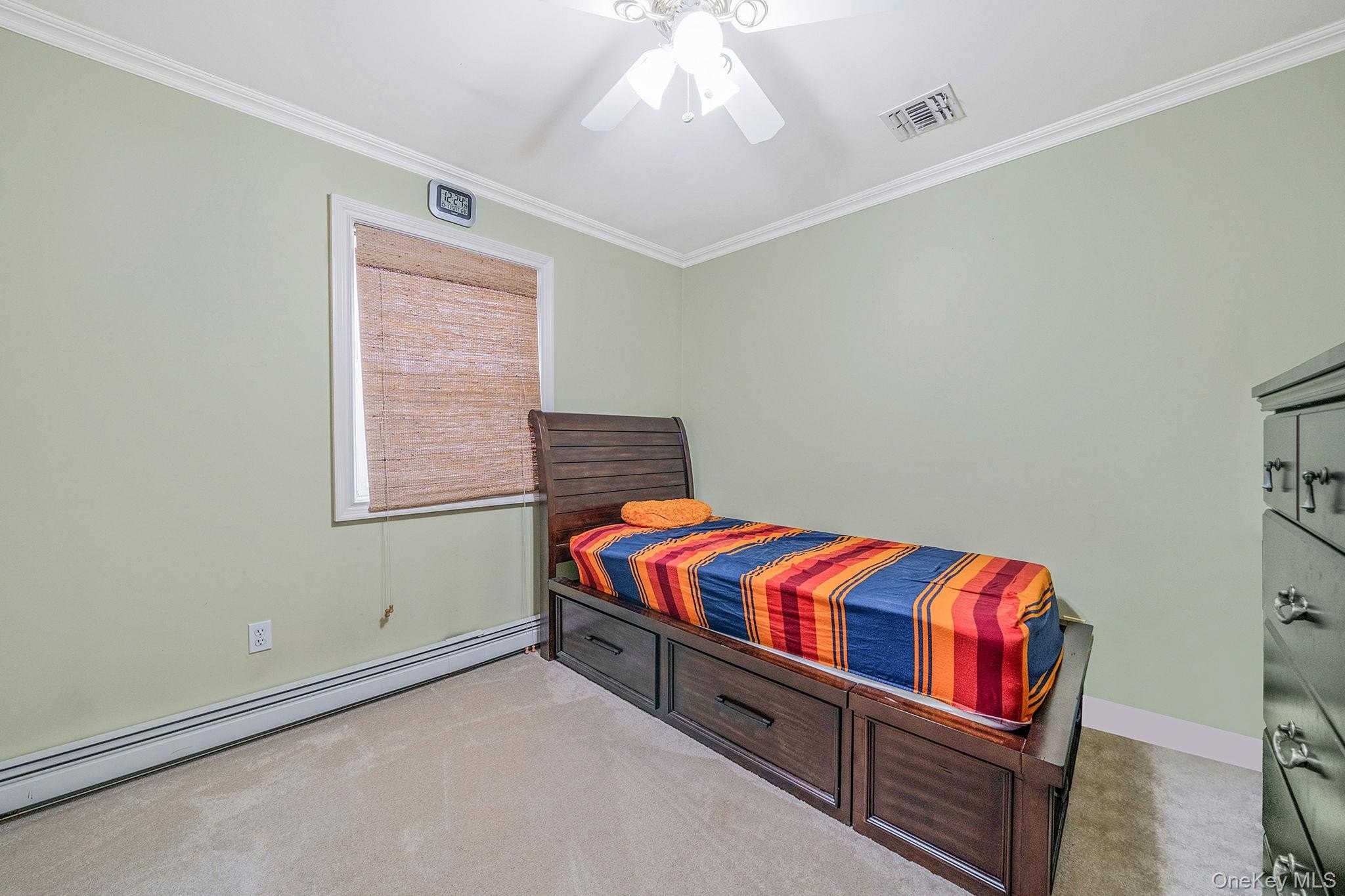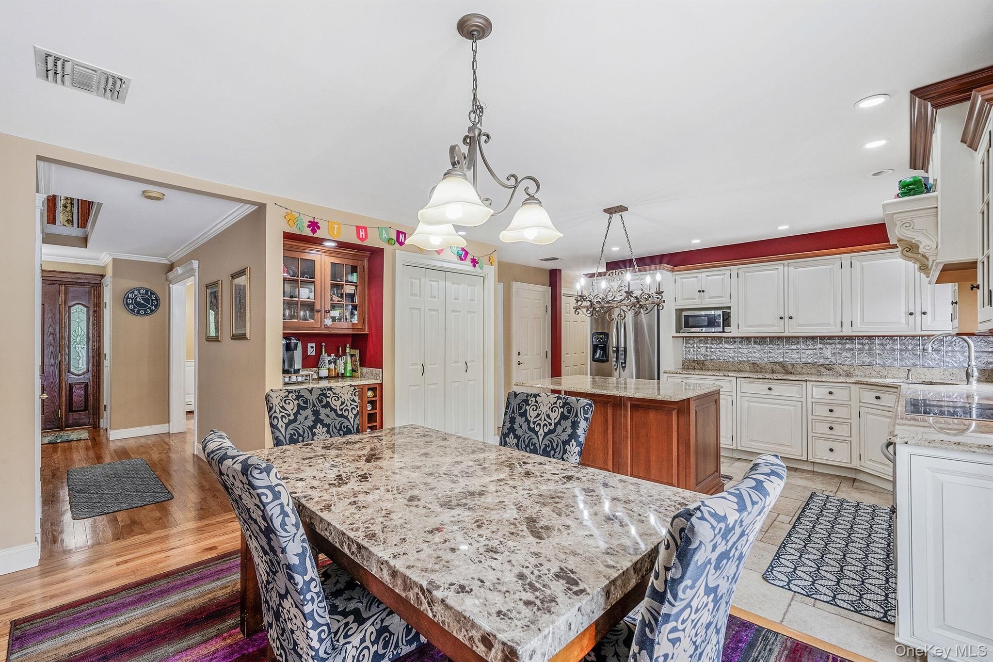 Saint James Colonial in Smithtown Schools, built 1998, on a quiet cul-de-sac. A grand two-story foyer leads to formal living and dining rooms, a fireplace family room, and an eat-in kitchen with granite countertops. Off the rear, a glass-wrapped sunroom overlooks the backyard and opens to a large composite deck. Main level highlights include hardwood floors, powder room, and laundry. Two-car garage with electric-car charger, 9-zone in-ground sprinklers, central air. Upstairs offers four bedrooms and two full baths, including a comfortable primary suite. The walk-out lower level provides flexible space for multigenerational needs, in-laws, or an au pair arrangement: two finished rooms currently set as sleeping areas, a living/rec area with a wet bar, a full bath, and its own washer and dryer, plus a separate entrance. Owned solar panels (2020) help the property generate its own electricity; per seller, PSEG averages about $17/month to keep the account active. East-west orientation, deck and sunroom for everyday enjoyment, and a convenient location near all that Saint James offers.