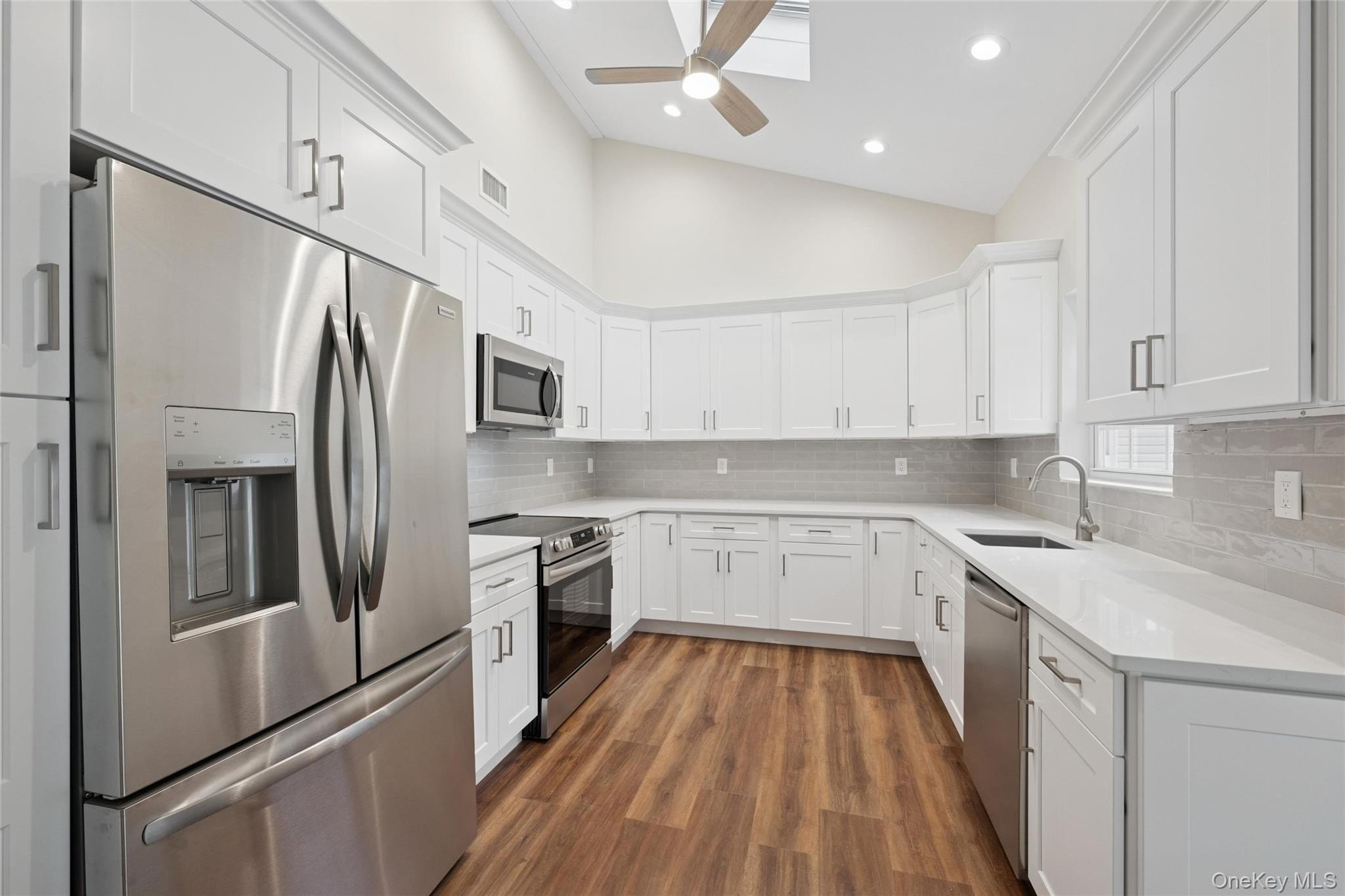 Beautifully Renovated 2-Bedroom, 2-Bath Condo with Garage - Land Lease (Cash Buyers Only) 55 and over community! This completely updated 2-bedroom, 2-bathroom condo offers comfortable, low-maintenance living in a vibrant land lease community. The home features cathedral ceilings, a brand-new kitchen with quartz countertops and stainless Frigidaire appliances, and two modern bathrooms-including a new en-suite in the spacious primary bedroom. You'll find abundant storage throughout, including multiple large closets, a walk-in closet, and a generous 1-car garage. Exterior upgrades include new Cedar Impressions vinyl siding, updated windows and doors, a front wood deck with PVC railing, and a fully fenced backyard with a patio. The driveway and walkway are lined with Belgium block, complemented by a landscaped front planter bed. Shed installations up to 8x10 are allowed (must back up to a structure), and fencing is permitted up to 5 feet in height. The monthly community fee is $1,688 plus $46.62 for water and sewer. Taxes and utilities are separate. Enjoy a wide range of amenities including a swimming pool, pickleball and tennis courts, shuffleboard, mini-golf, a fitness center, clubhouse with organized activities and events, a game room, billiards, darts, and a poker room. All exterior maintenance, landscaping, and snow removal are included for hassle-free living. Application required. Land lease - cash buyers only.